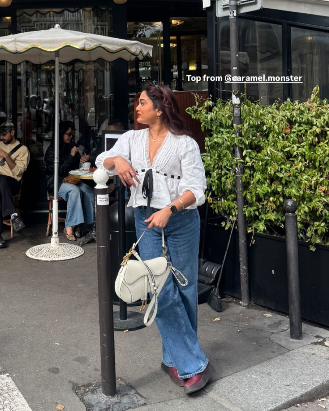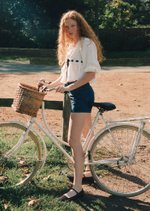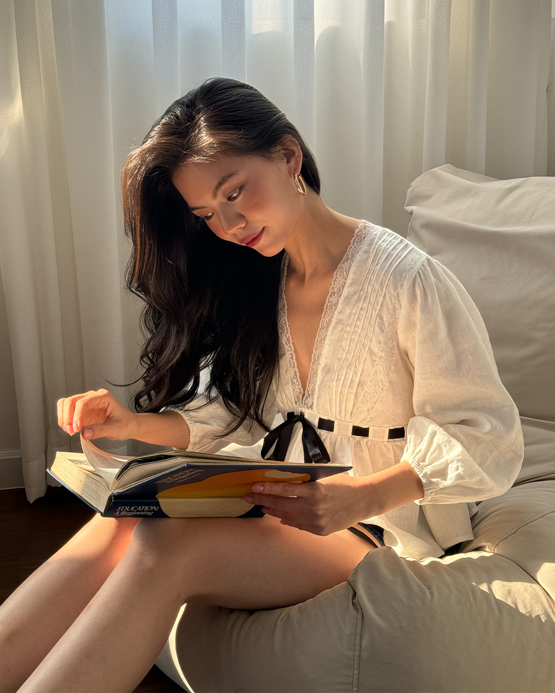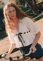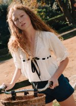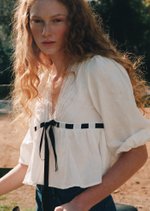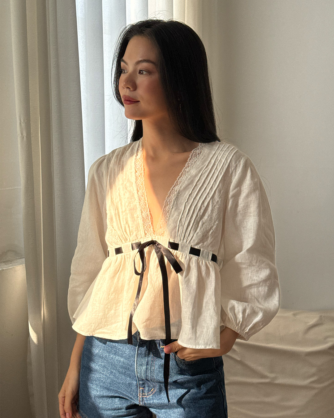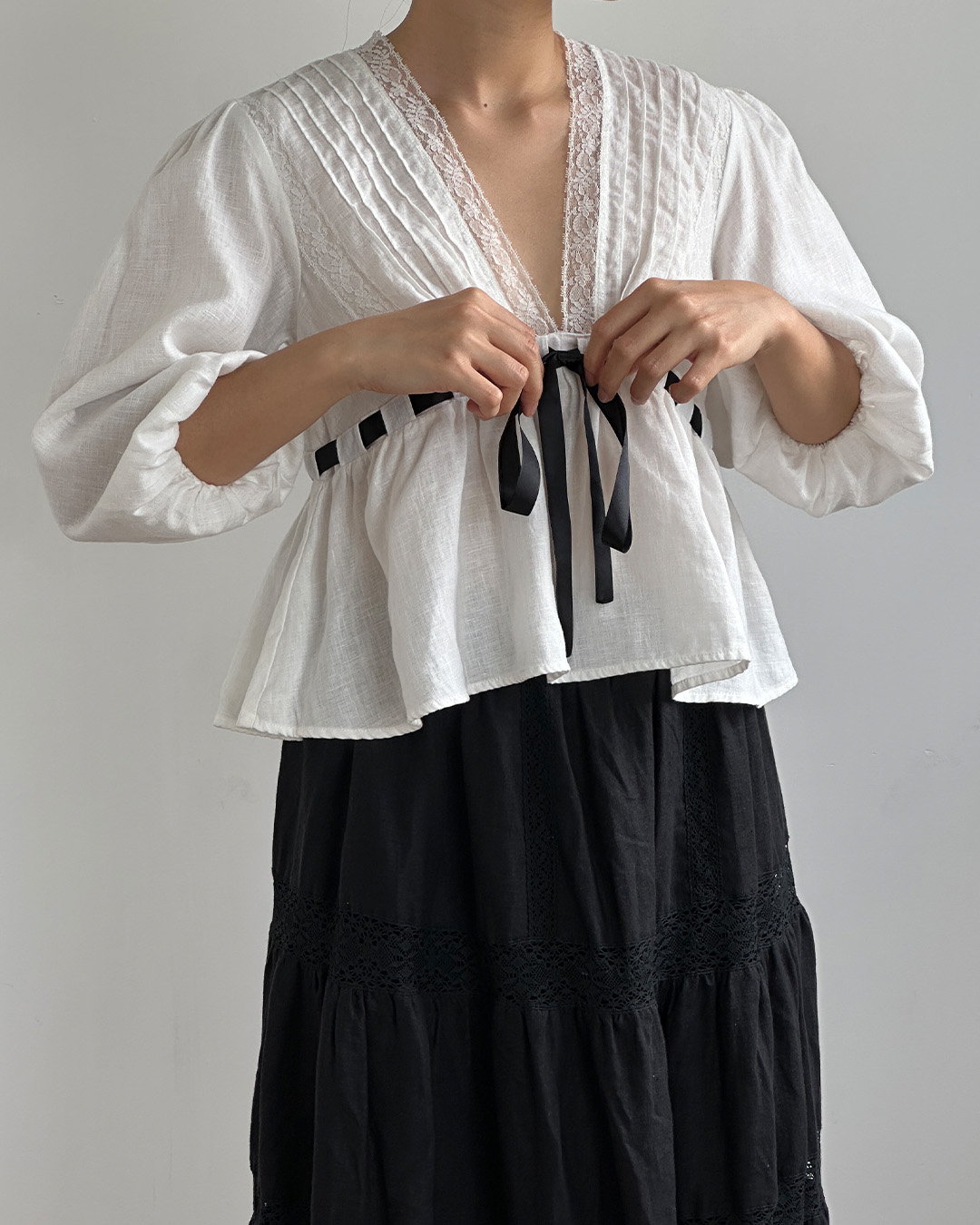 The Adele Top features a romantic V-neckline with delicate pintucks and lace trim, balanced by softly voluminous sleeves and a structured waistband. Finished with a bold contrast ribbon tie and a gentle peplum hem, it’s a charming piece with a touch of drama.