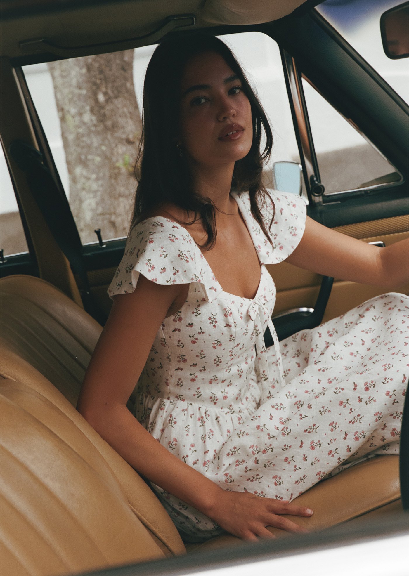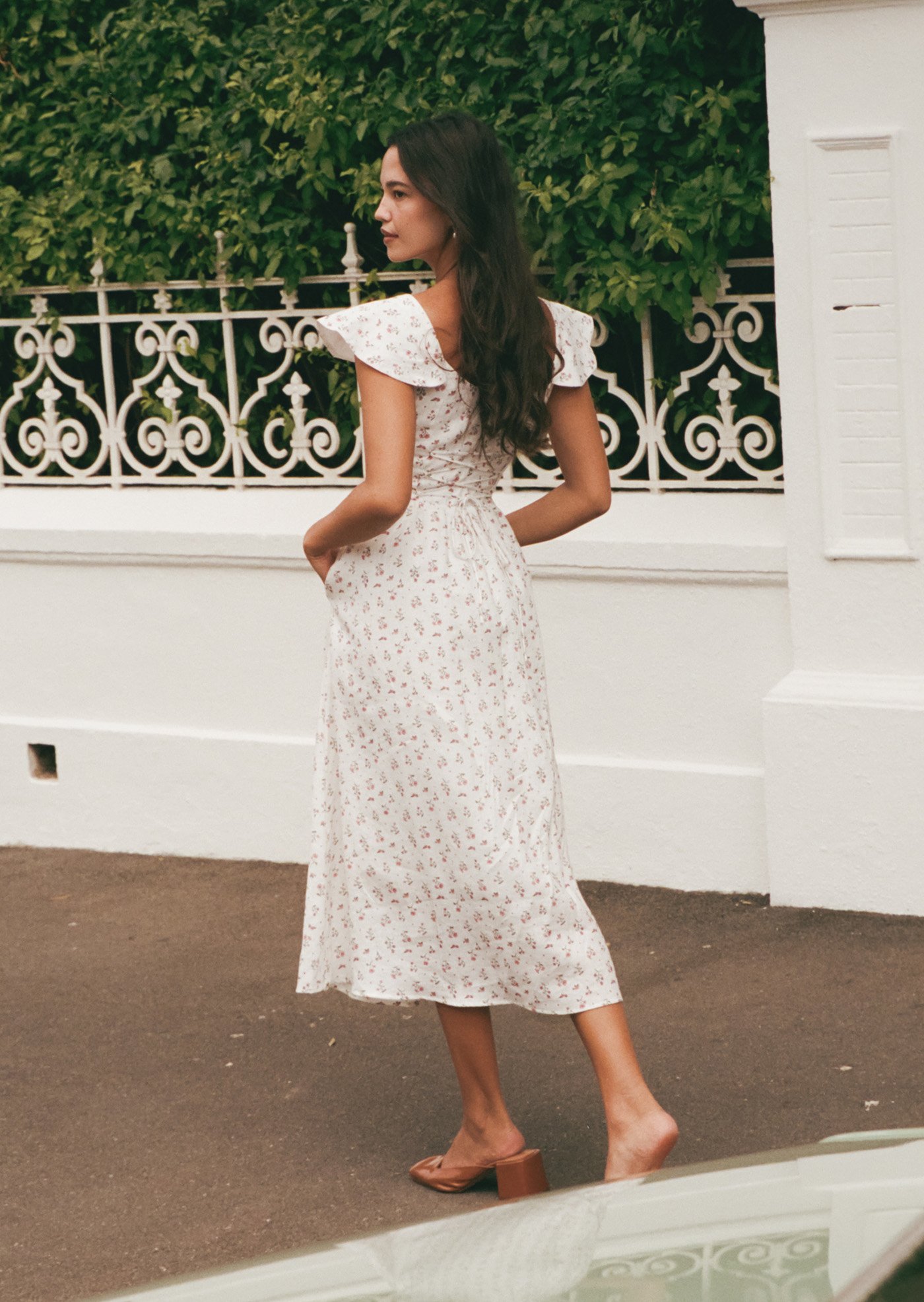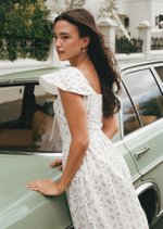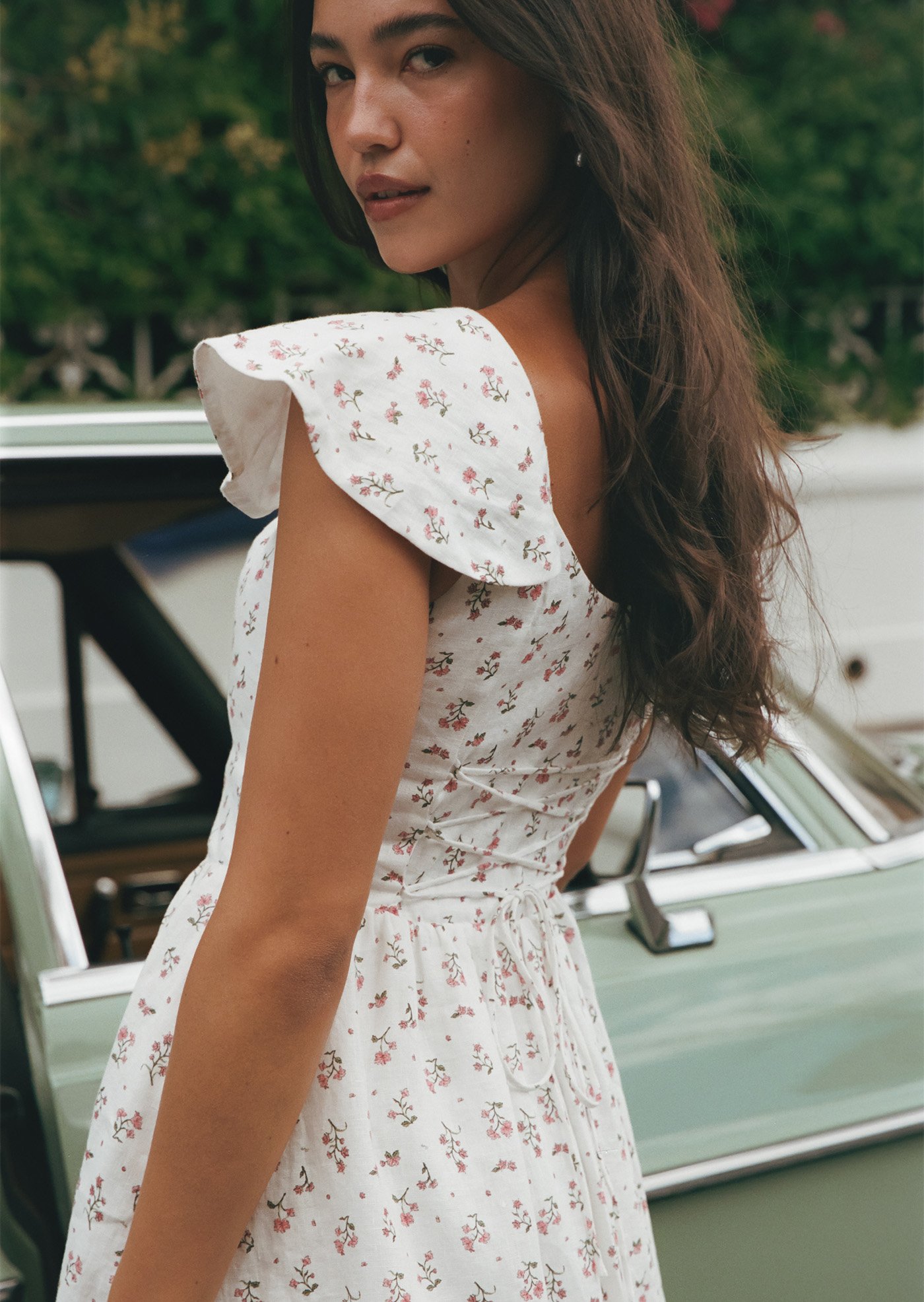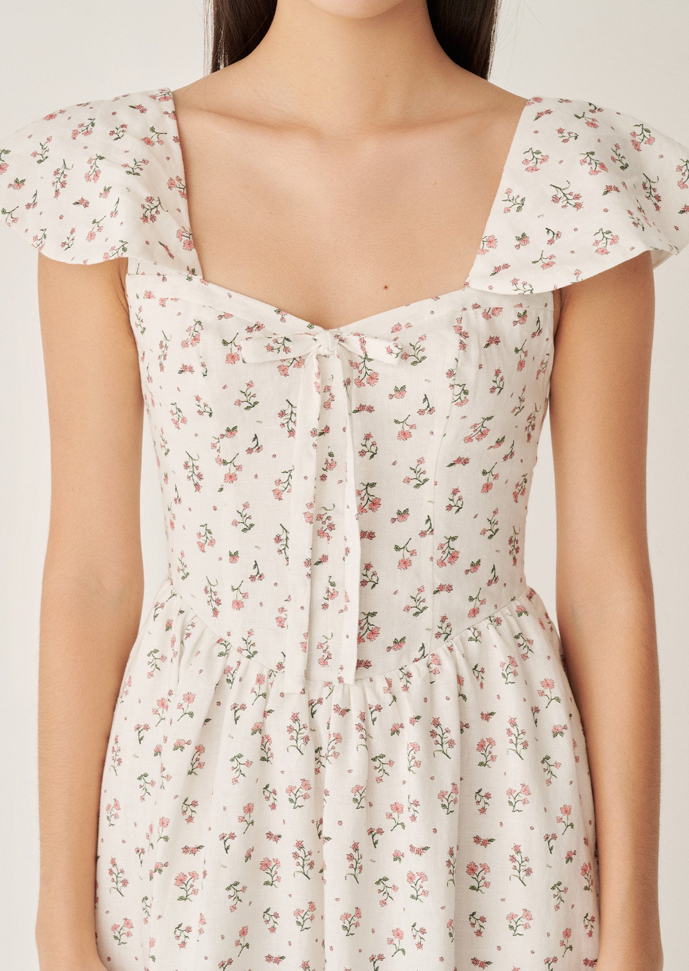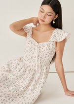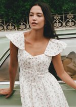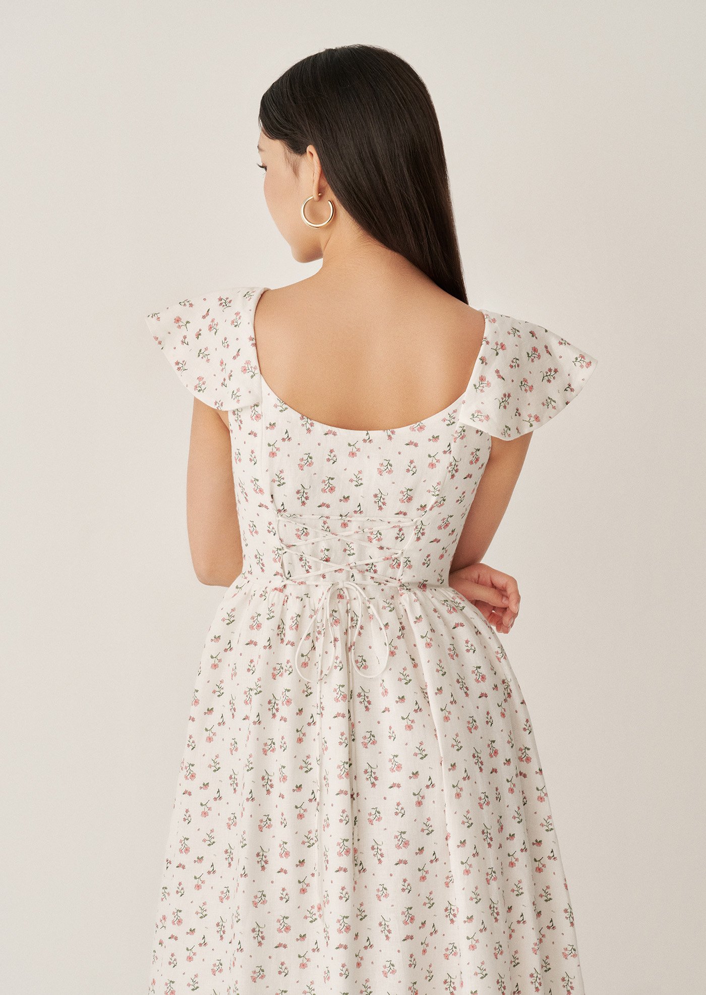Aileen is a softly romantic midi designed with delicate structure and everyday ease in mind. Featuring a gentle scoop neckline, flutter sleeves, and a flattering fitted bodice, this piece balances femininity with comfort. The lace-up back allows for an adjustable fit, while the flowing skirt adds lightness and movement — perfect for slow mornings and warm afternoons.