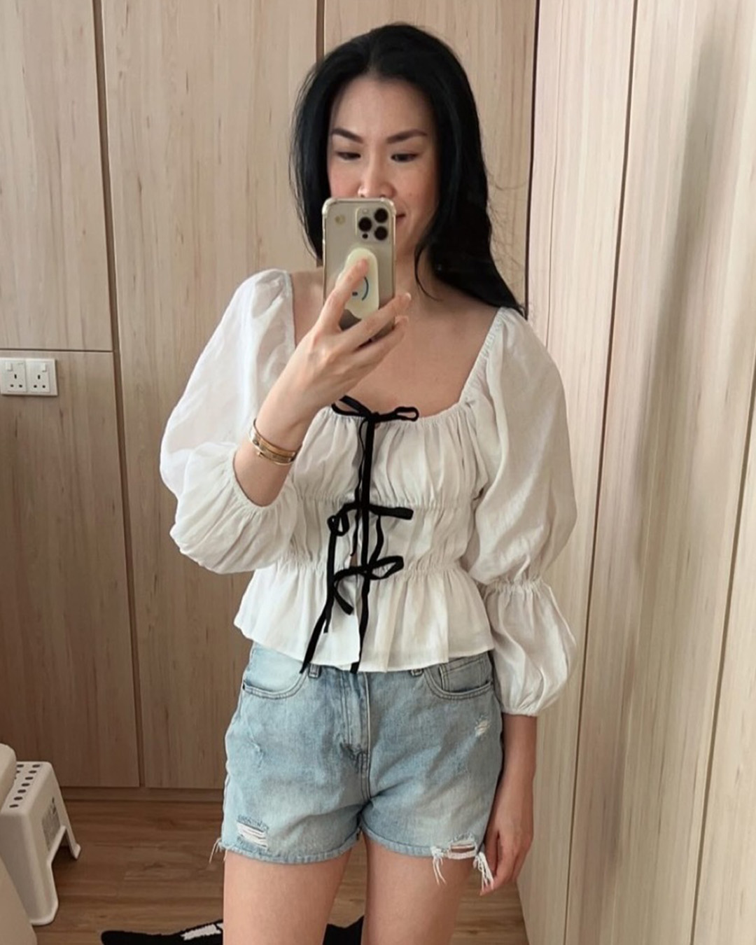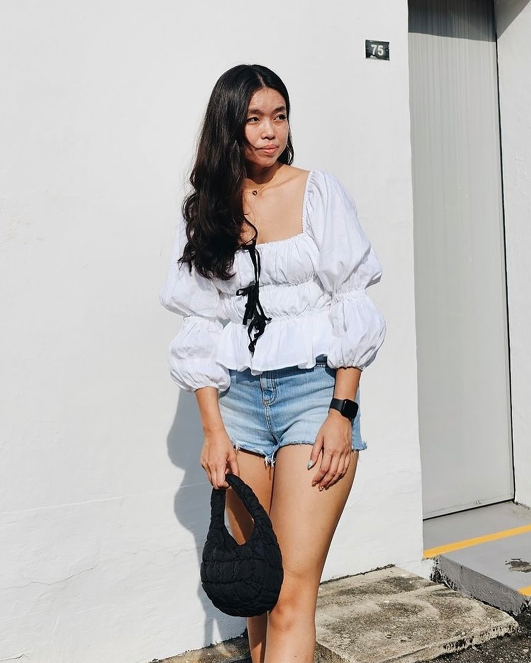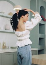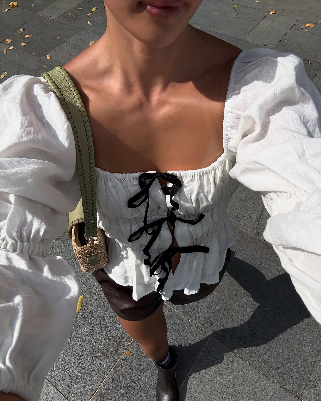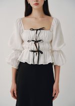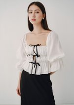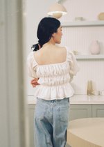 The Amanda top is ruched in the bodice with puffy sleeves.