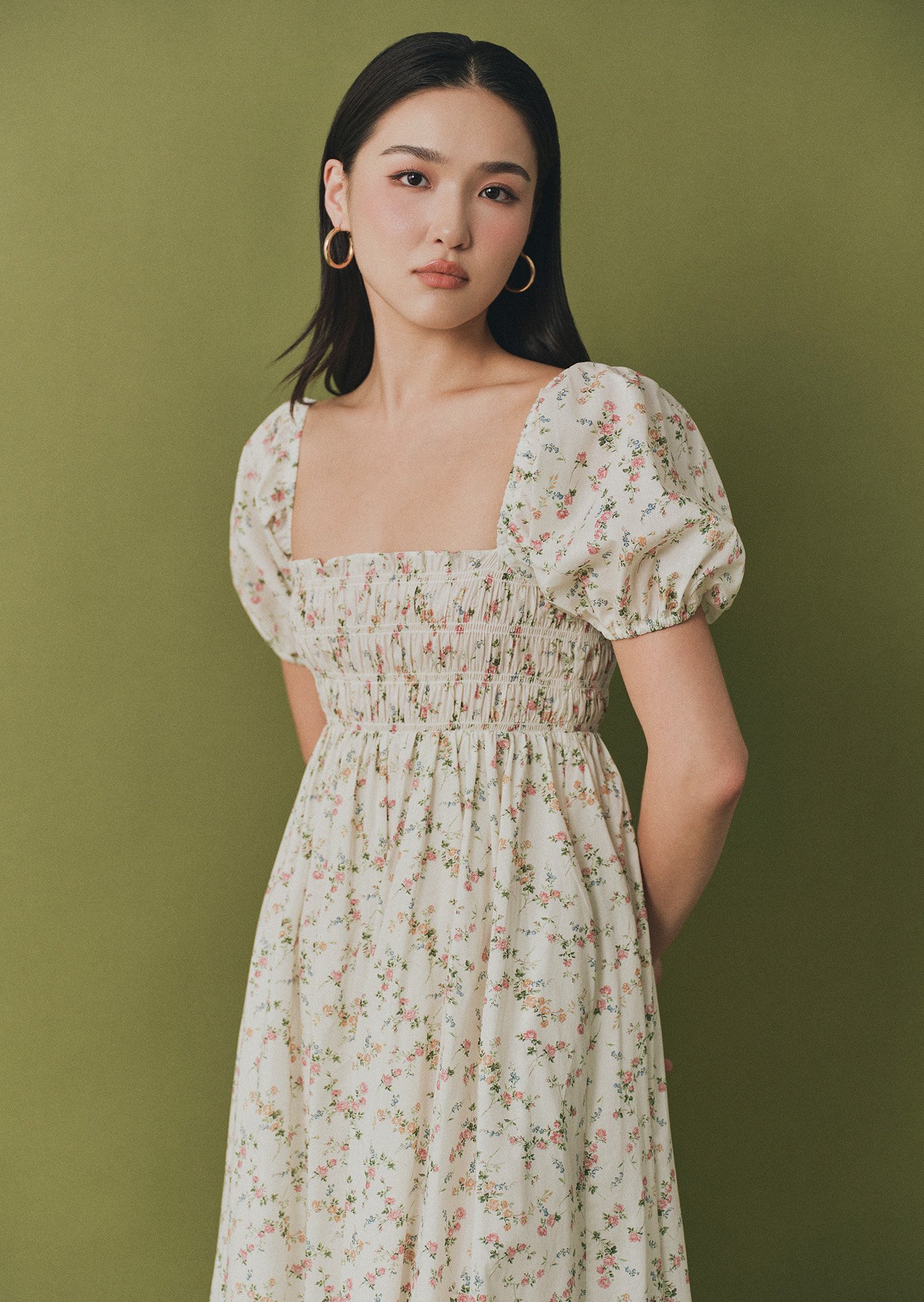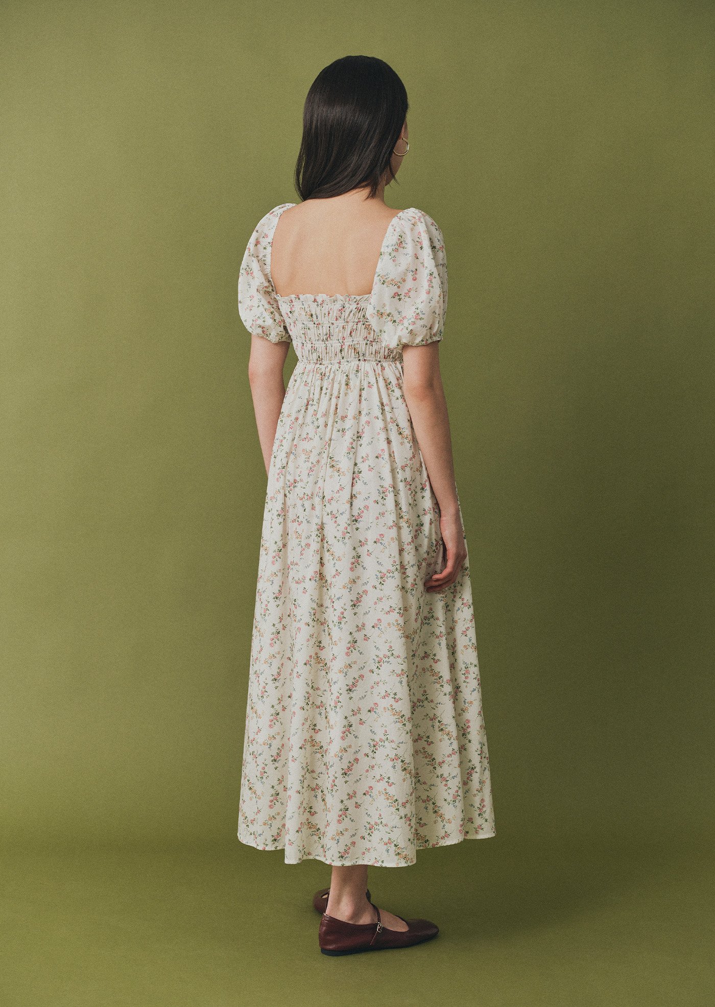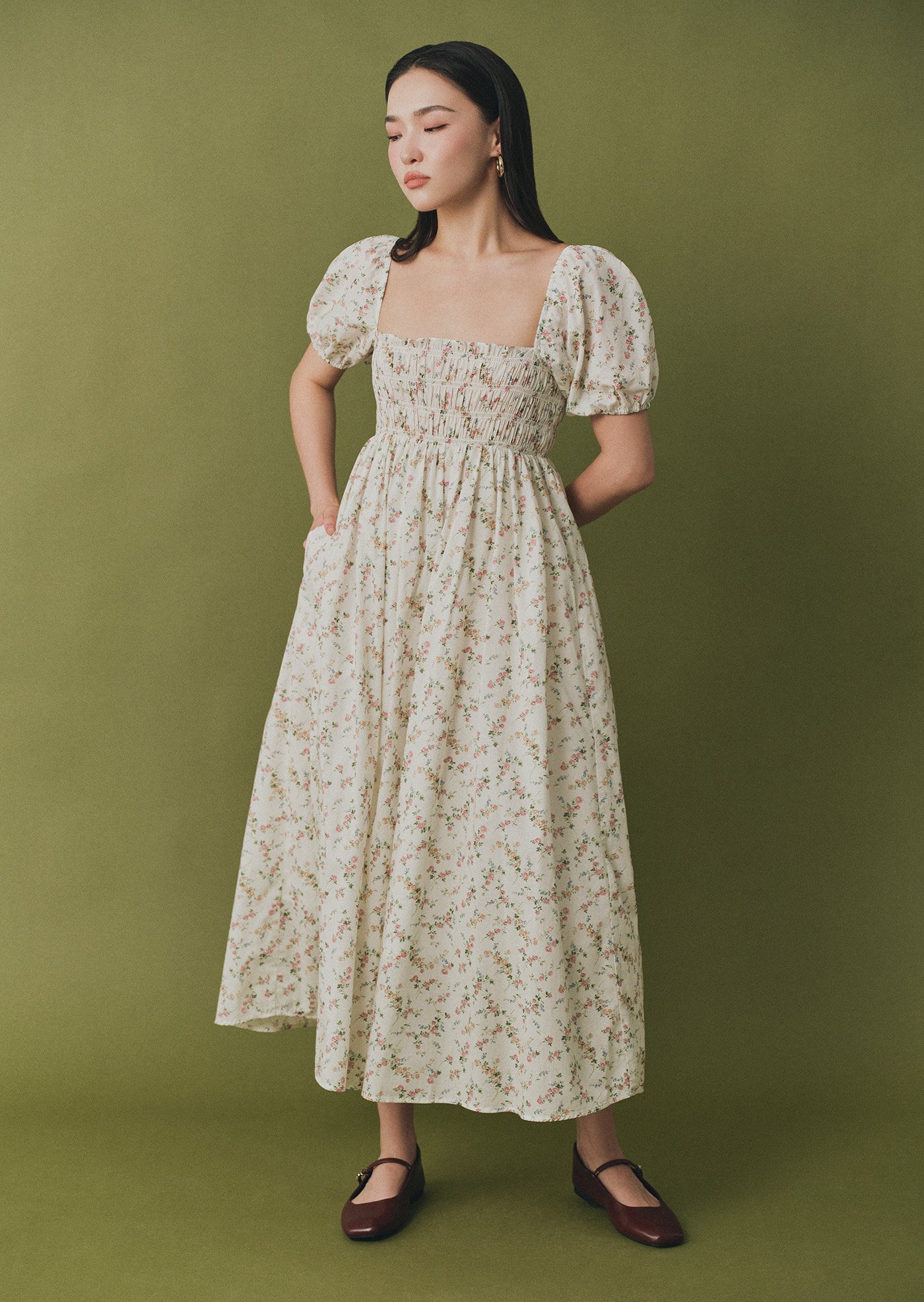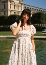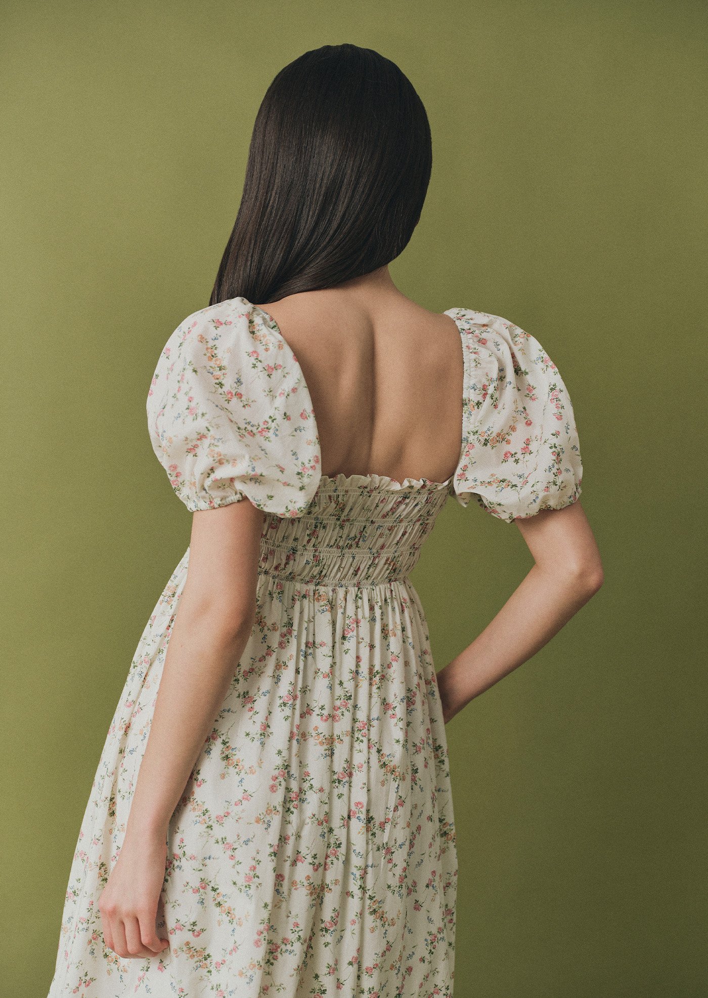 The Anka Midi Dress is a romantic piece with a smocked bodice, puff sleeves, and a flowing skirt that drapes to mid-calf. Finished in delicate floral cotton, it’s a timeless silhouette that feels both airy and effortlessly feminine.