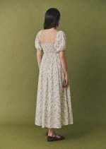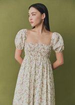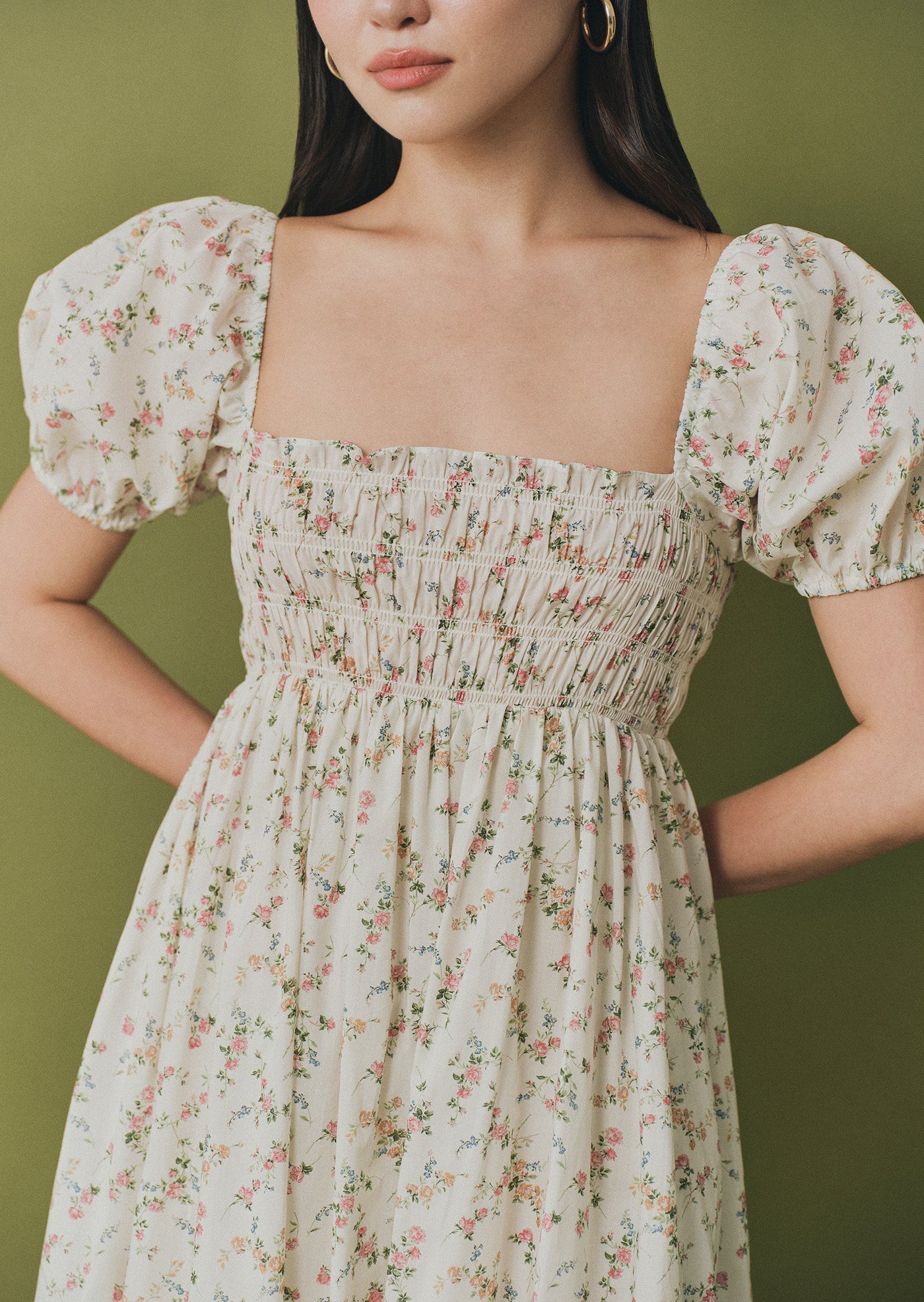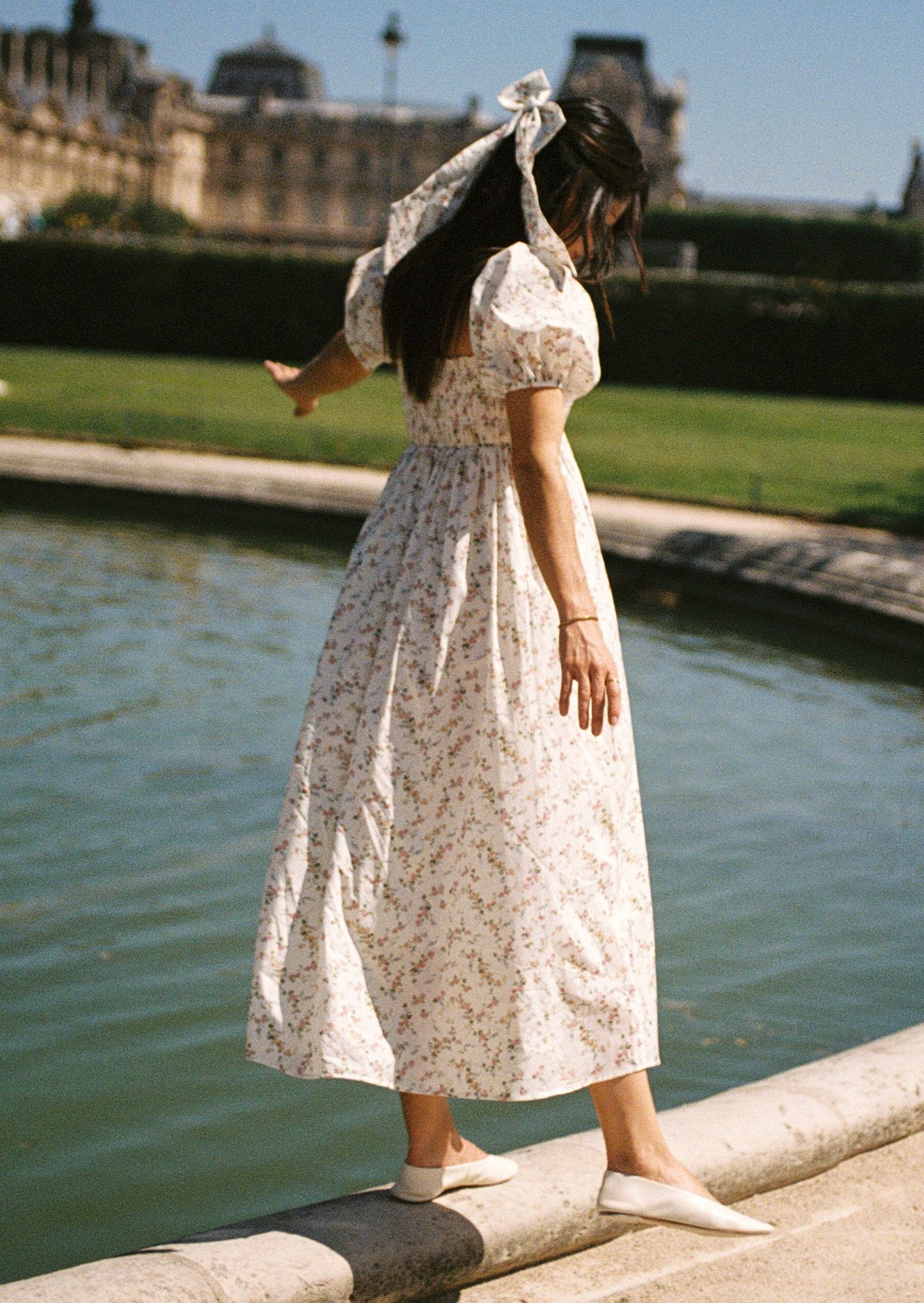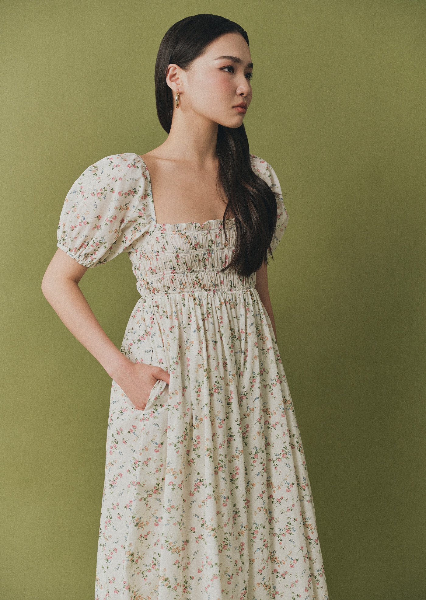 The Anka Midi Dress is a romantic piece with a smocked bodice, puff sleeves, and a flowing skirt that drapes to mid-calf. Finished in delicate floral cotton, it’s a timeless silhouette that feels both airy and effortlessly feminine.
