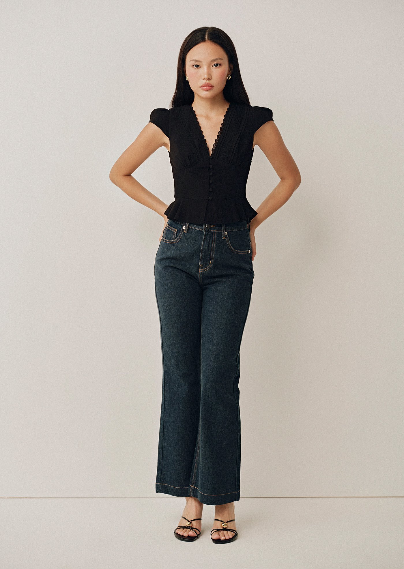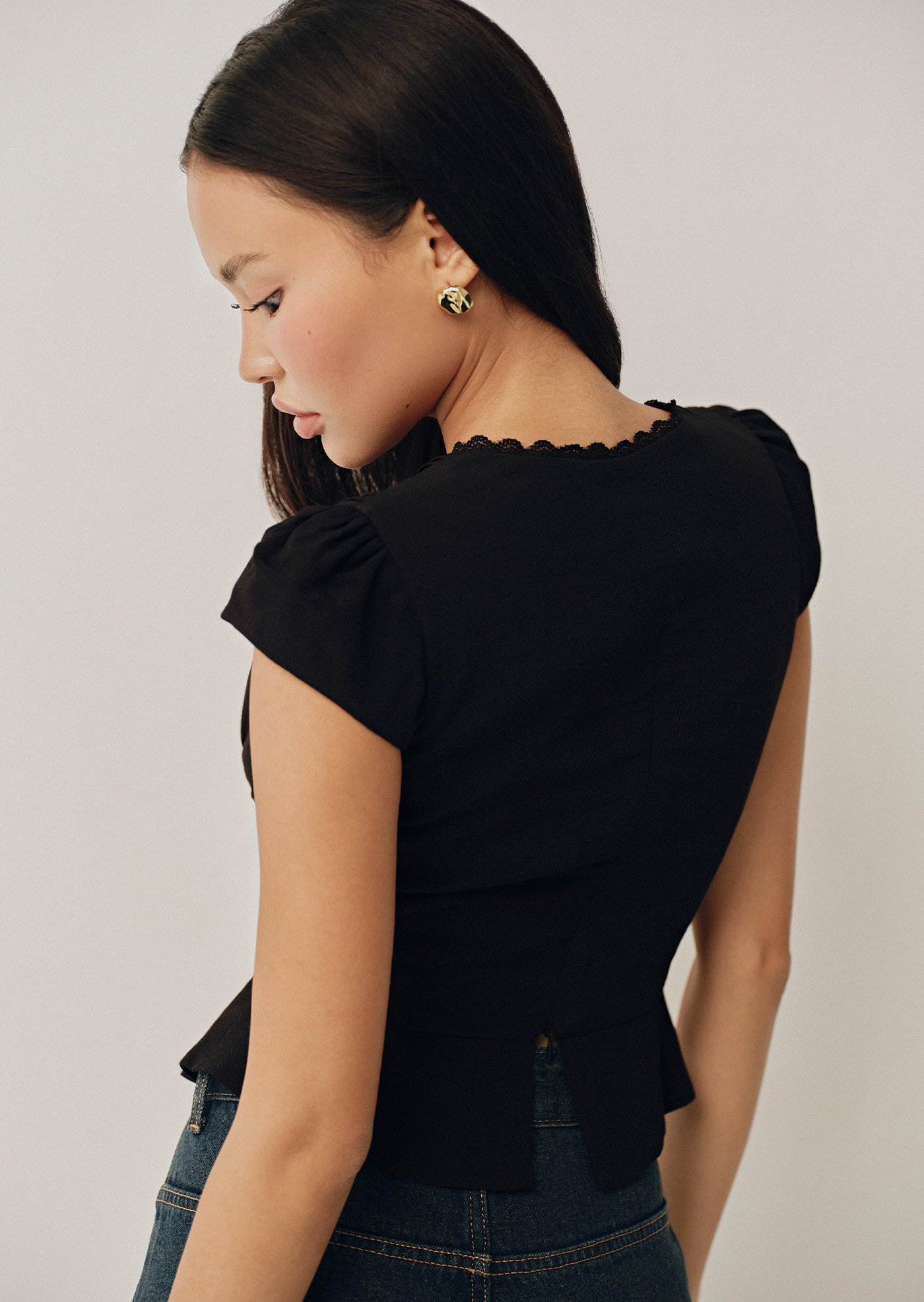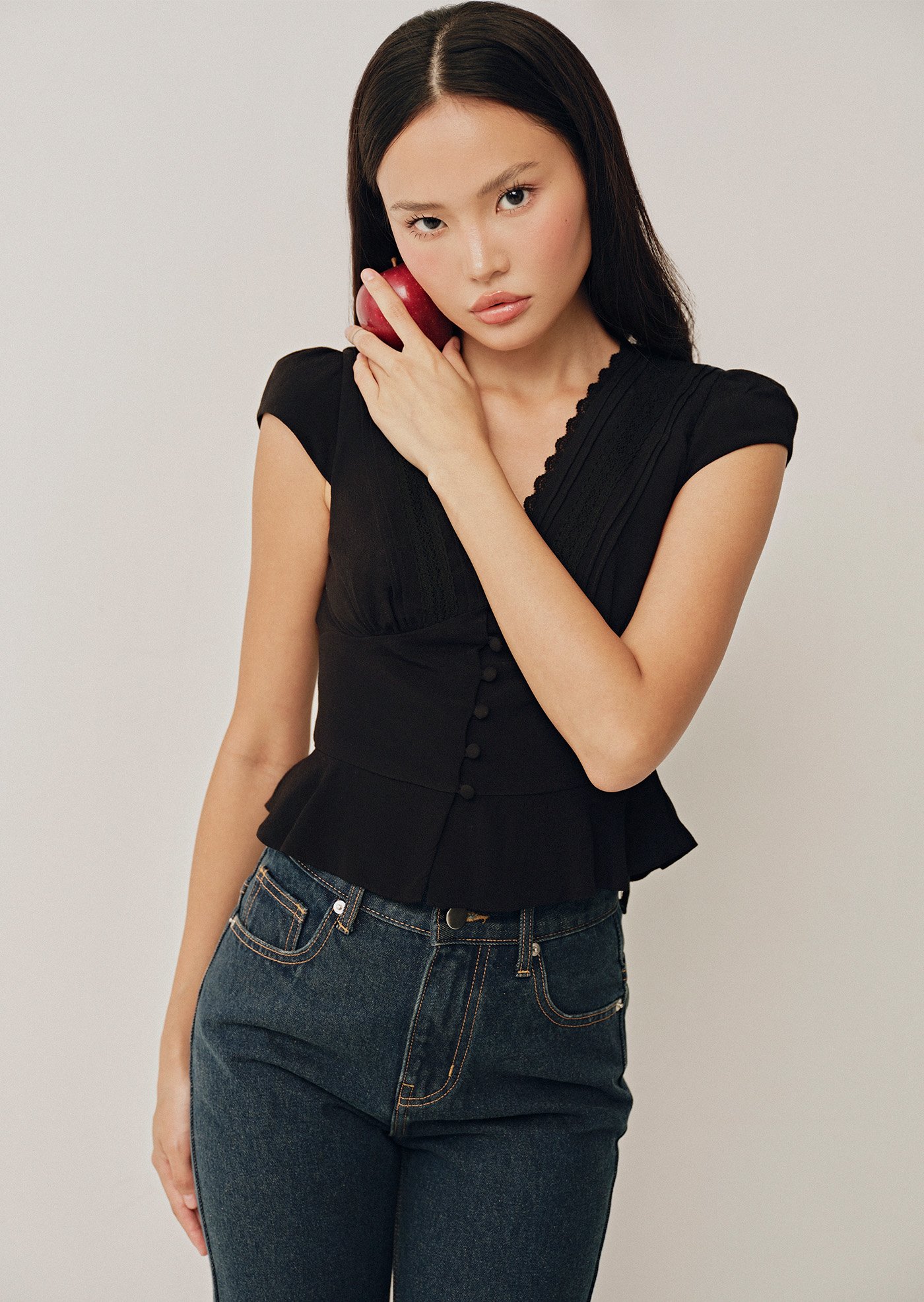 The Anya Top features a flattering V-neckline framed with delicate scalloped lace, pintuck detailing through the bodice, and soft cap sleeves for a feminine touch. Finished with fabric-covered buttons and a gentle peplum flare, it’s a timeless piece with subtle structure and charm.