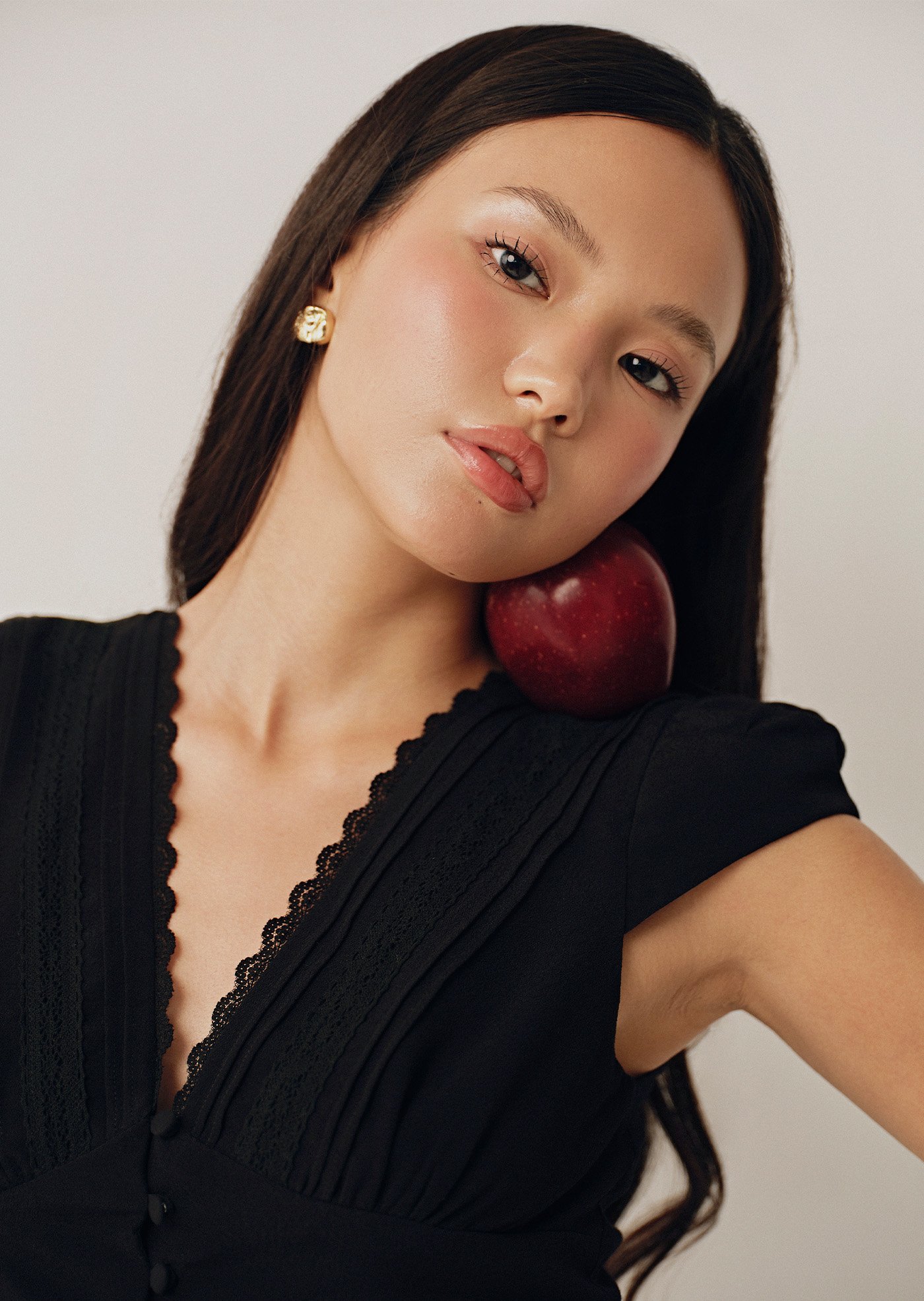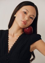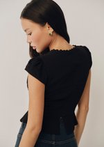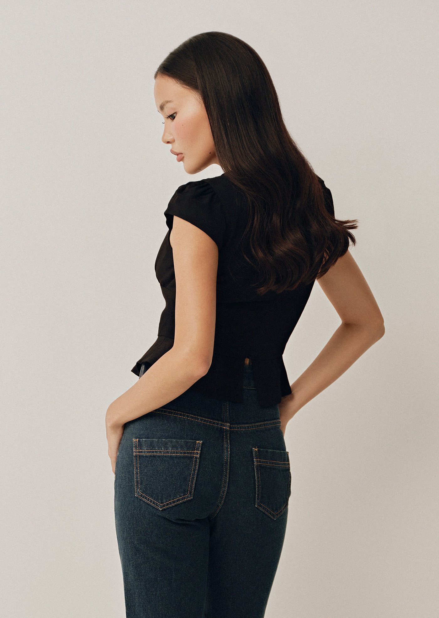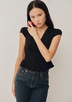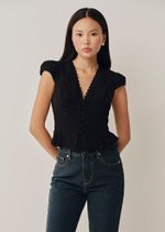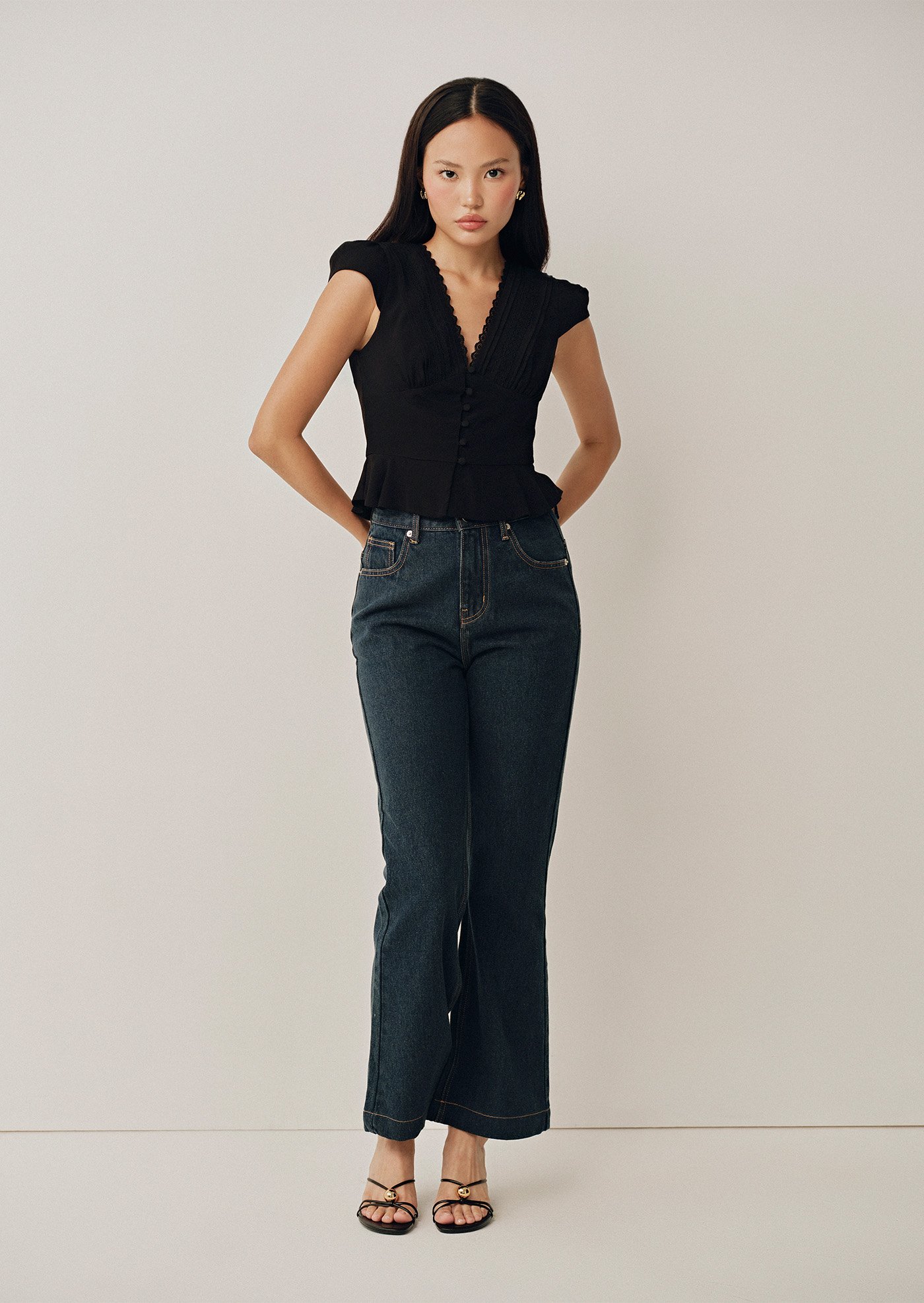 The Anya Top features a flattering V-neckline framed with delicate scalloped lace, pintuck detailing through the bodice, and soft cap sleeves for a feminine touch. Finished with fabric-covered buttons and a gentle peplum flare, it’s a timeless piece with subtle structure and charm.