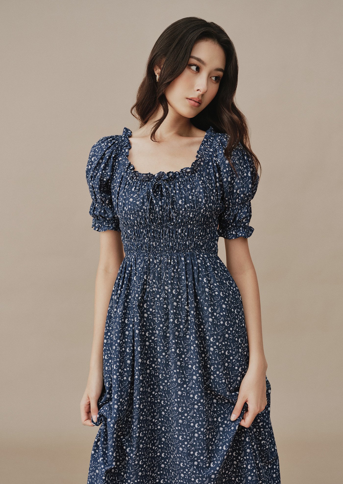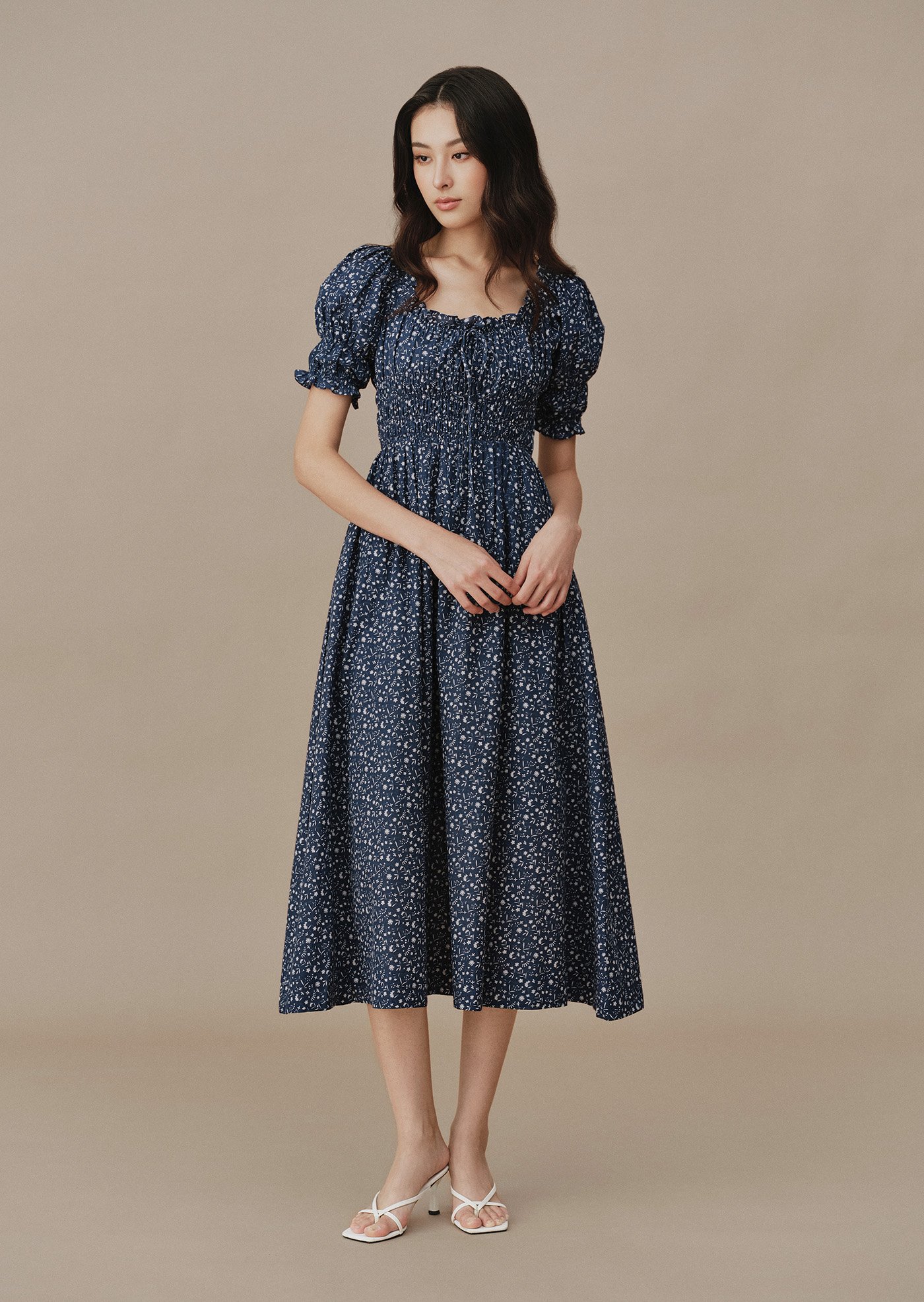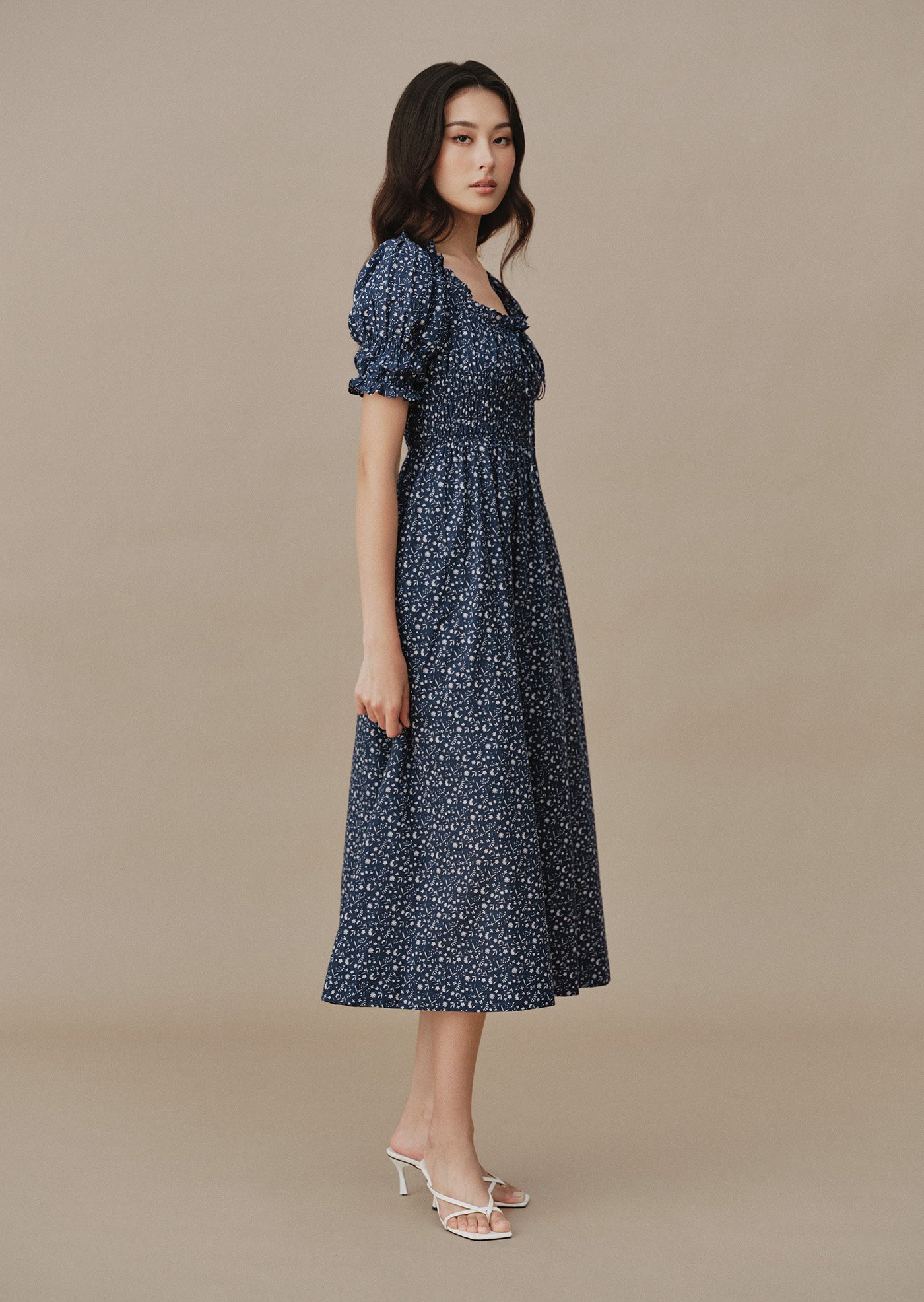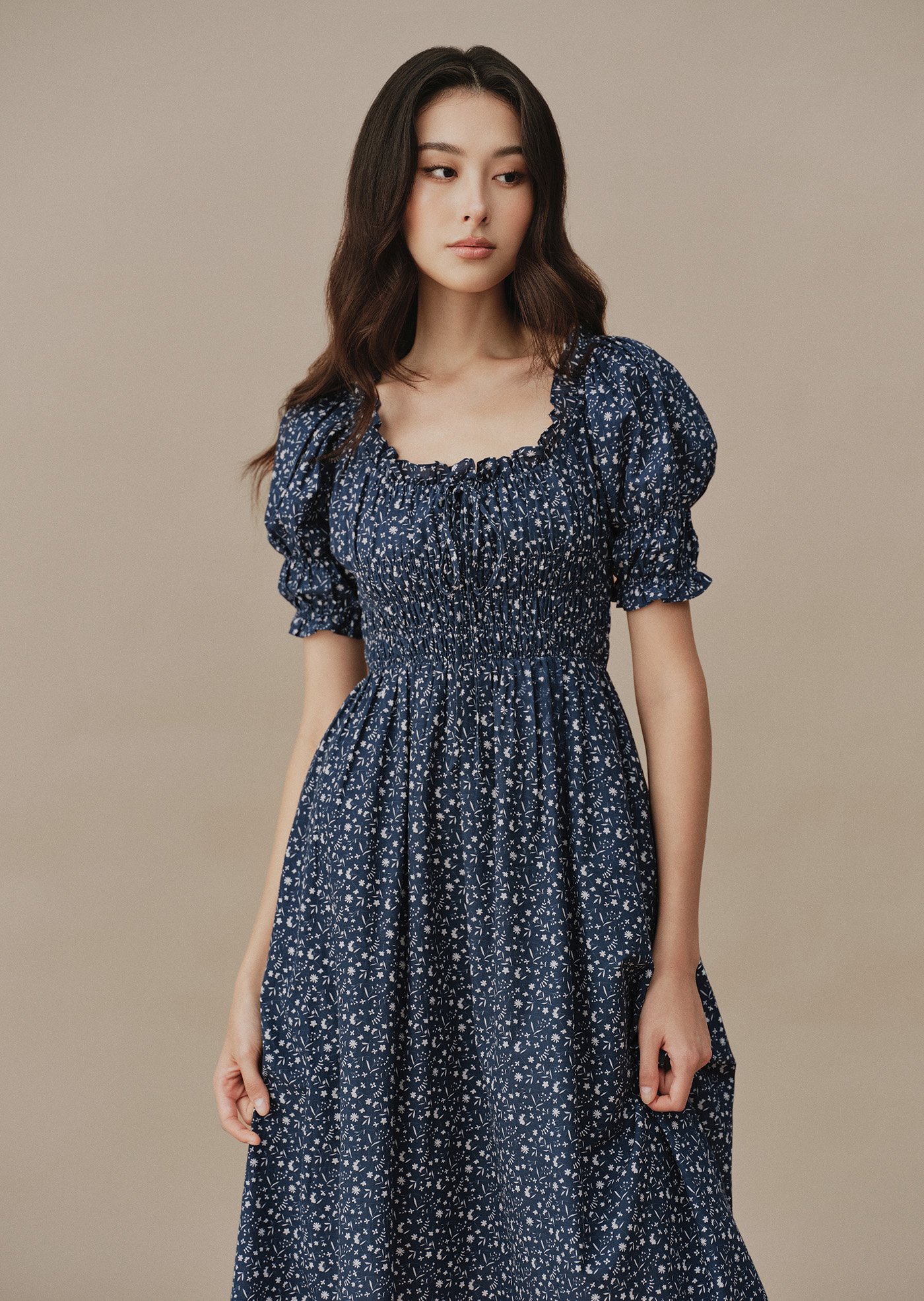 Featuring a smocked bodice that hugs comfortably, puffed sleeves with gentle ruffles, and a flowy midi skirt, this dress moves effortlessly between everyday ease and quiet elegance. Printed with delicate vintage-inspired florals on breathable cotton, it’s the kind of piece made for slow days and long strolls.