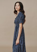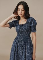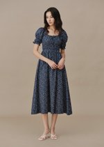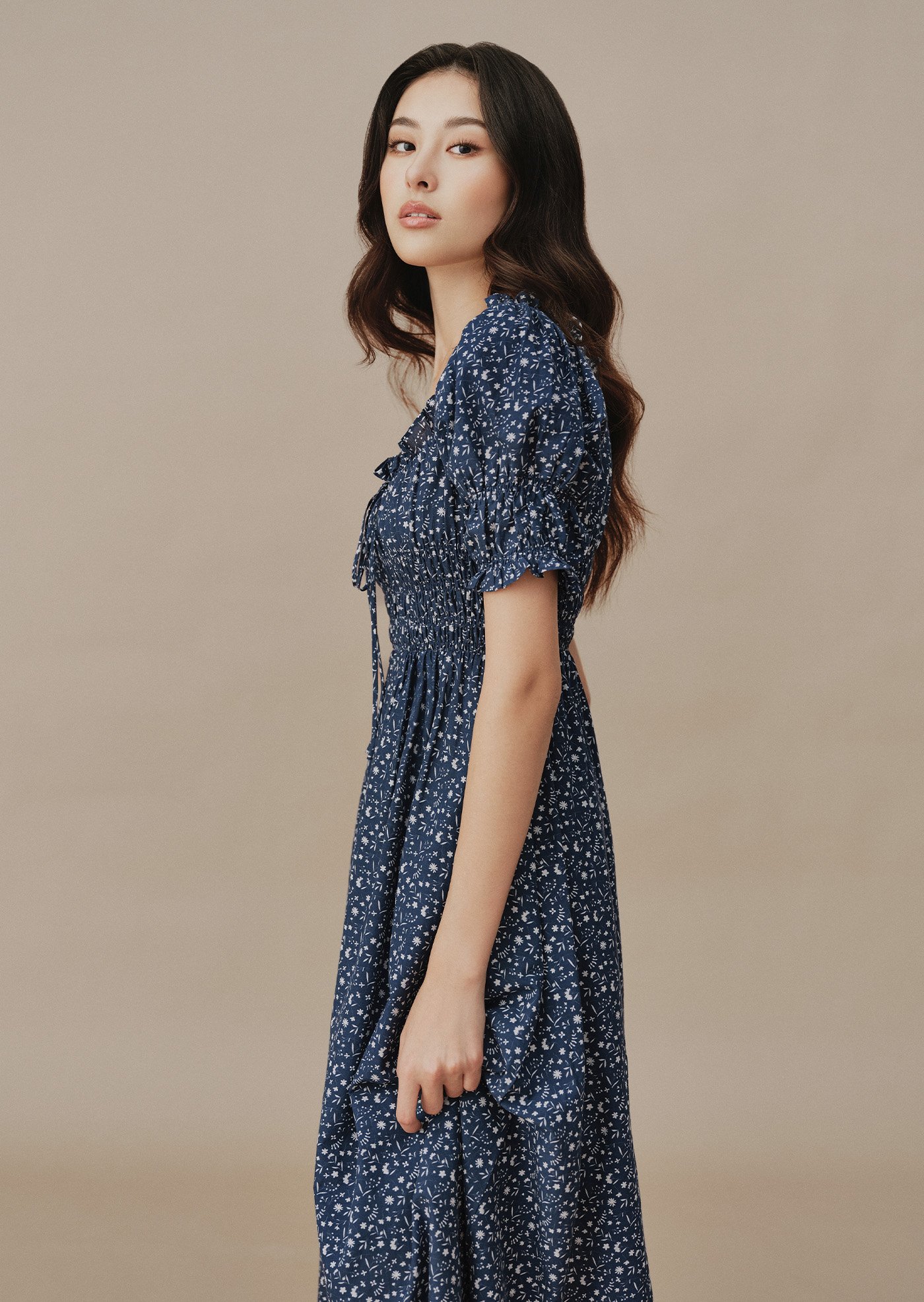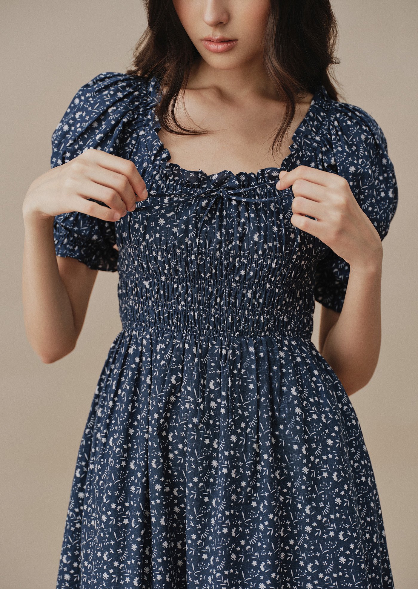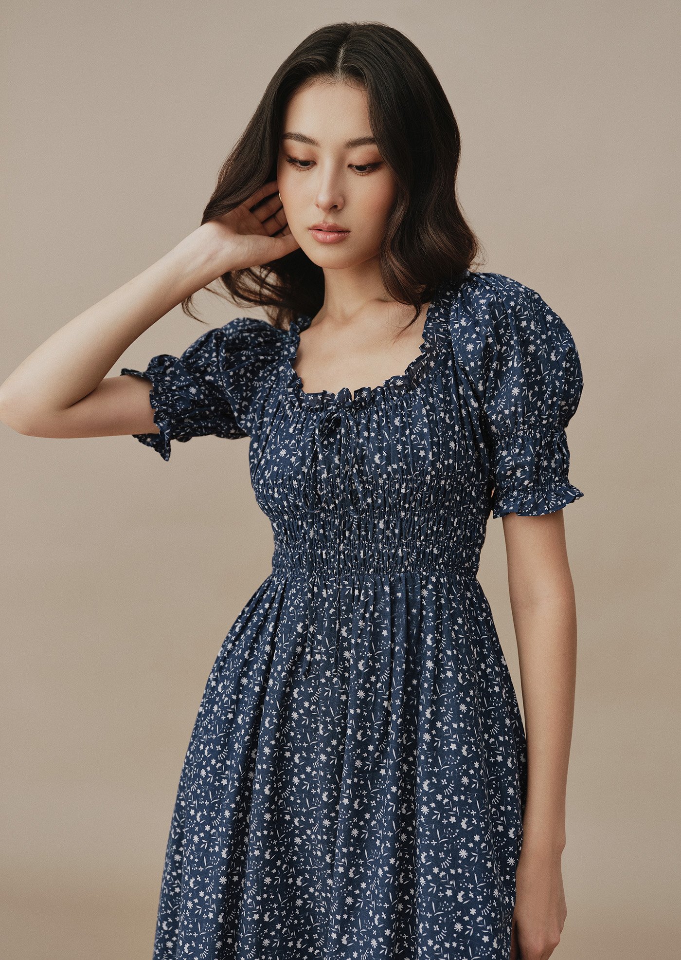Featuring a smocked bodice that hugs comfortably, puffed sleeves with gentle ruffles, and a flowy midi skirt, this dress moves effortlessly between everyday ease and quiet elegance. Printed with delicate vintage-inspired florals on breathable cotton, it’s the kind of piece made for slow days and long strolls.