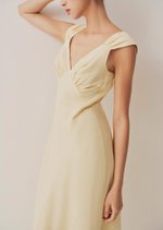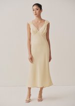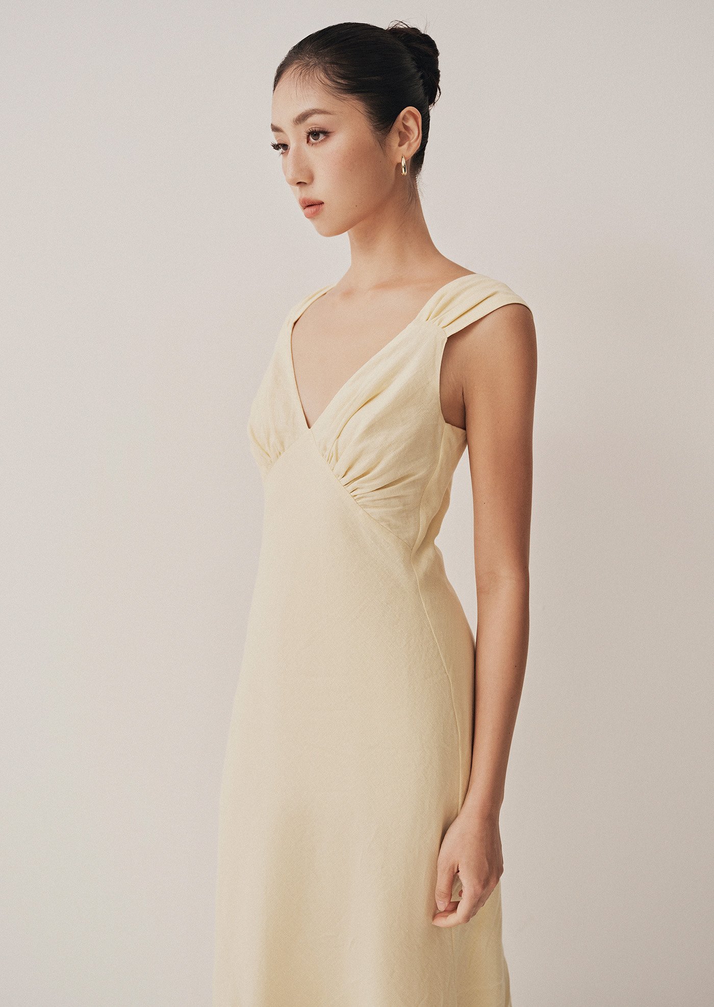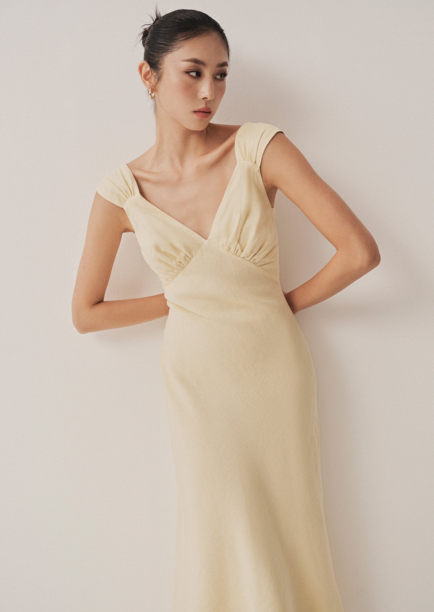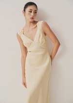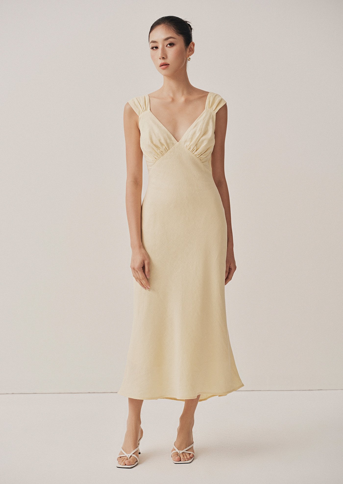 Oh Beatrice. A bias cut midi dress with plunging neckline and added ruching details around the bust and straps.