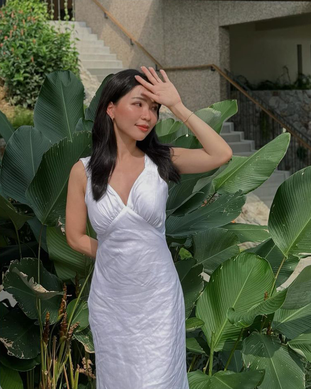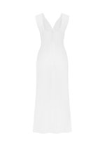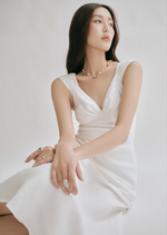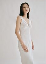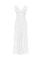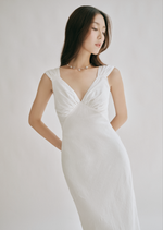 Oh Beatrice. A bias cut midi dress with plunging neckline and added ruching details around the bust and straps.