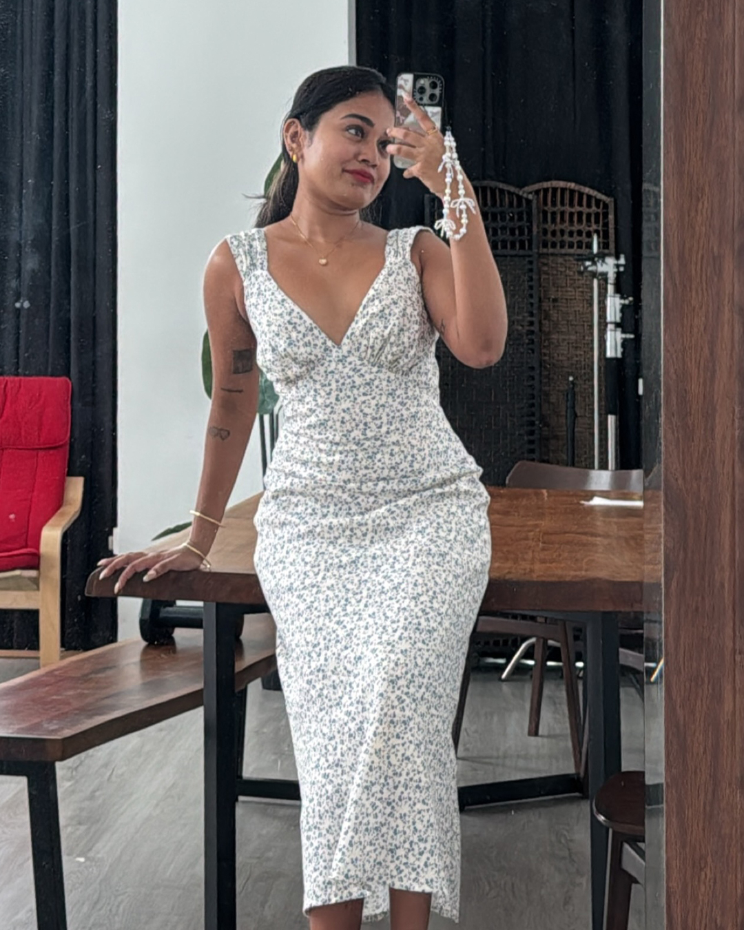 Oh Beatrice. A bias cut midi dress with plunging neckline and added ruching details around the bust and straps.