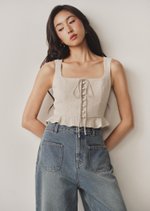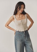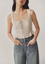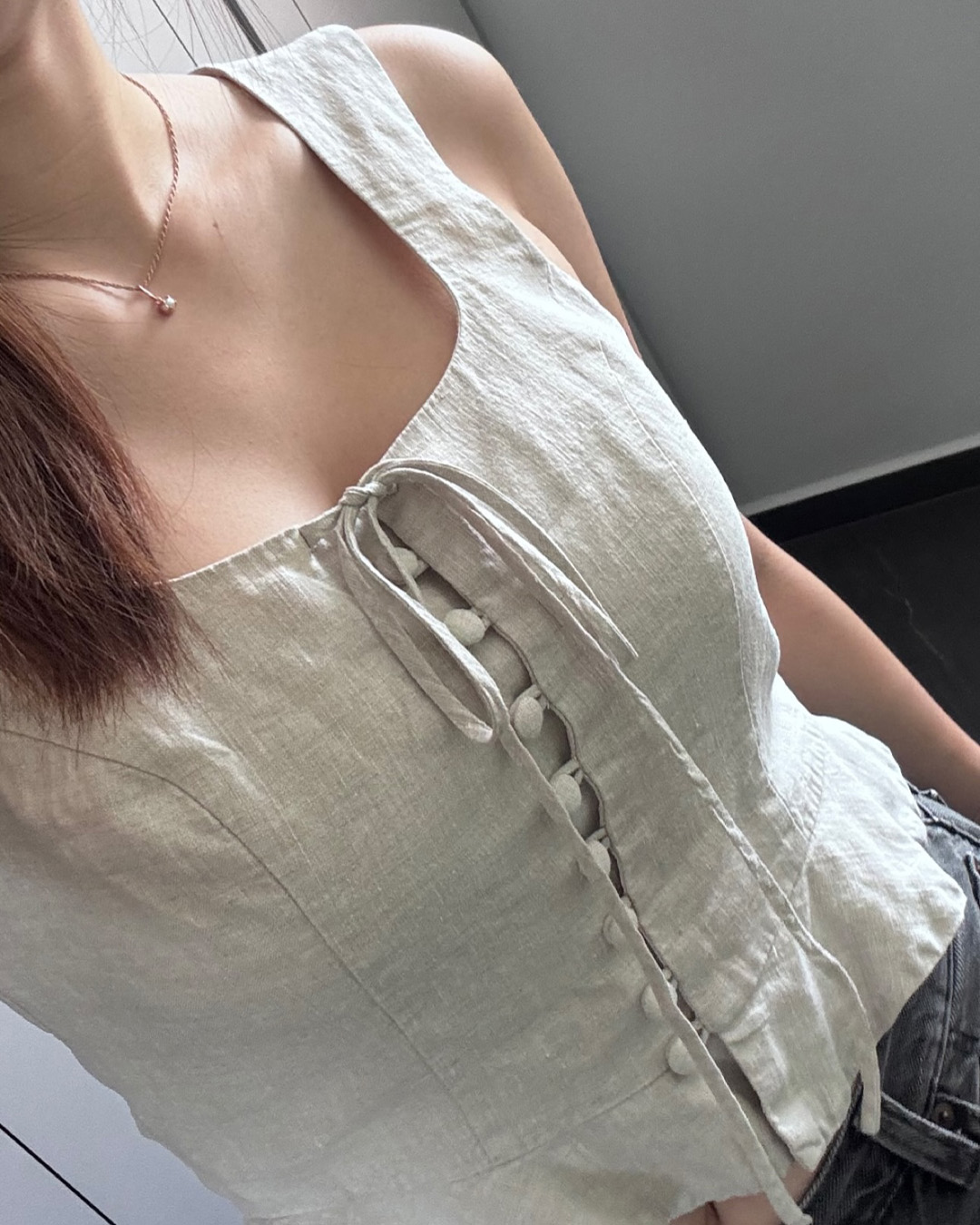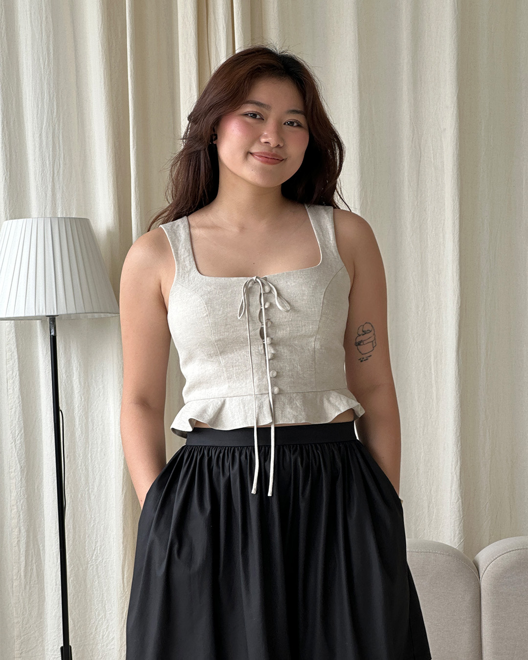 Enhance your style with our Beth Top, featuring a square neckline, button front, ruffled hem, and a self-tied ribbon. Fully lined for ultimate comfort and elegance.