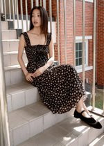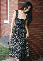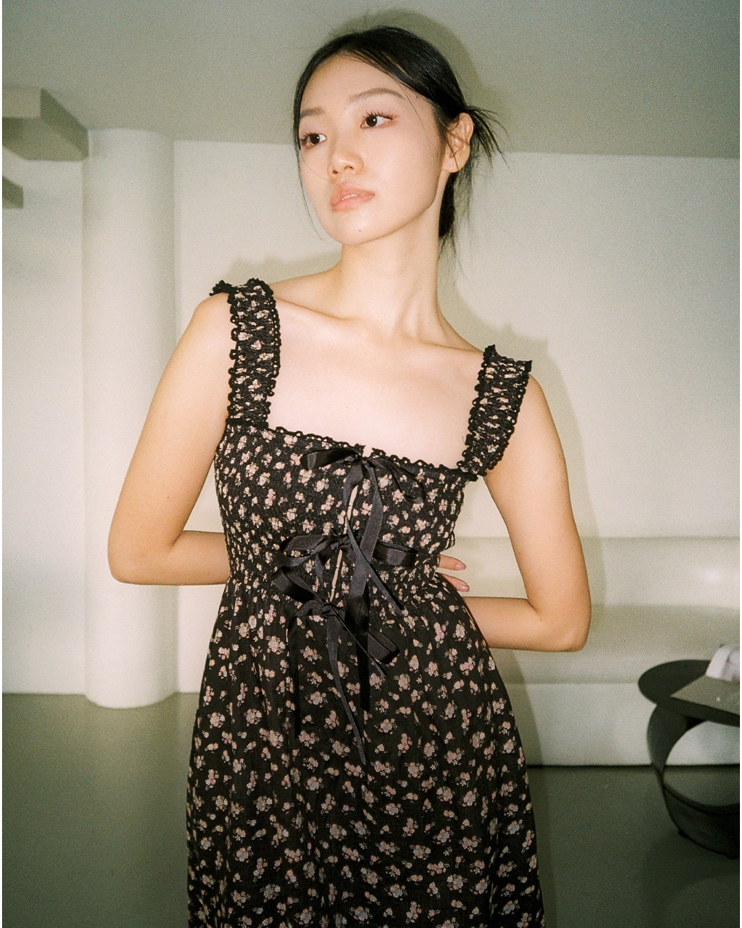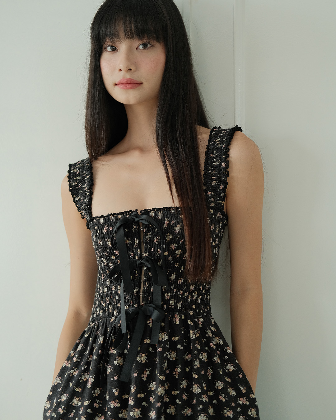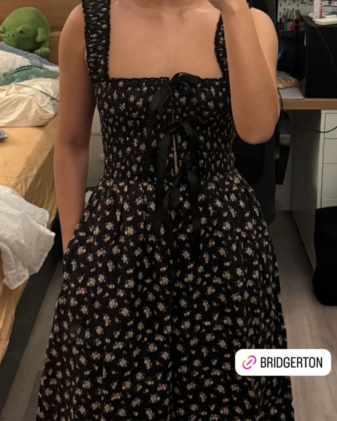 The Bridgerton is a midi-length dress with a fully smocked bodice and a relaxed skirt.