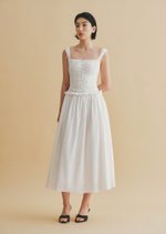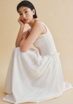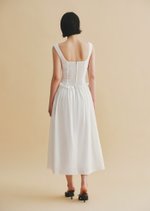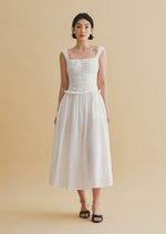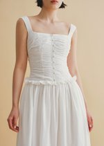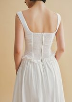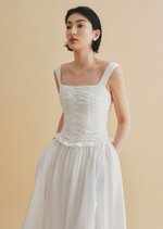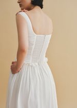 Introducing the Capri Midi Dress—a chic midaxi featuring a square neckline and a corset-style bodice with elegant ruching. Complete with a drop waist, back smocking with a zipper opening, and handy sideseam pockets, this fully lined dress delivers both style and comfort.