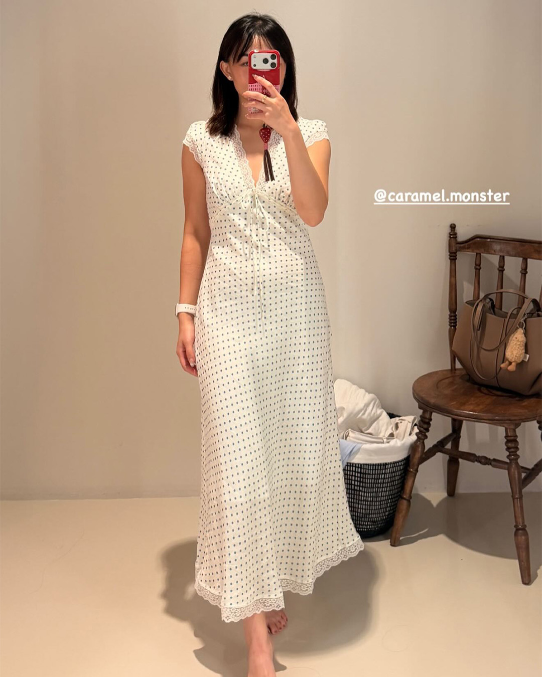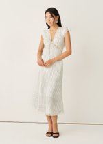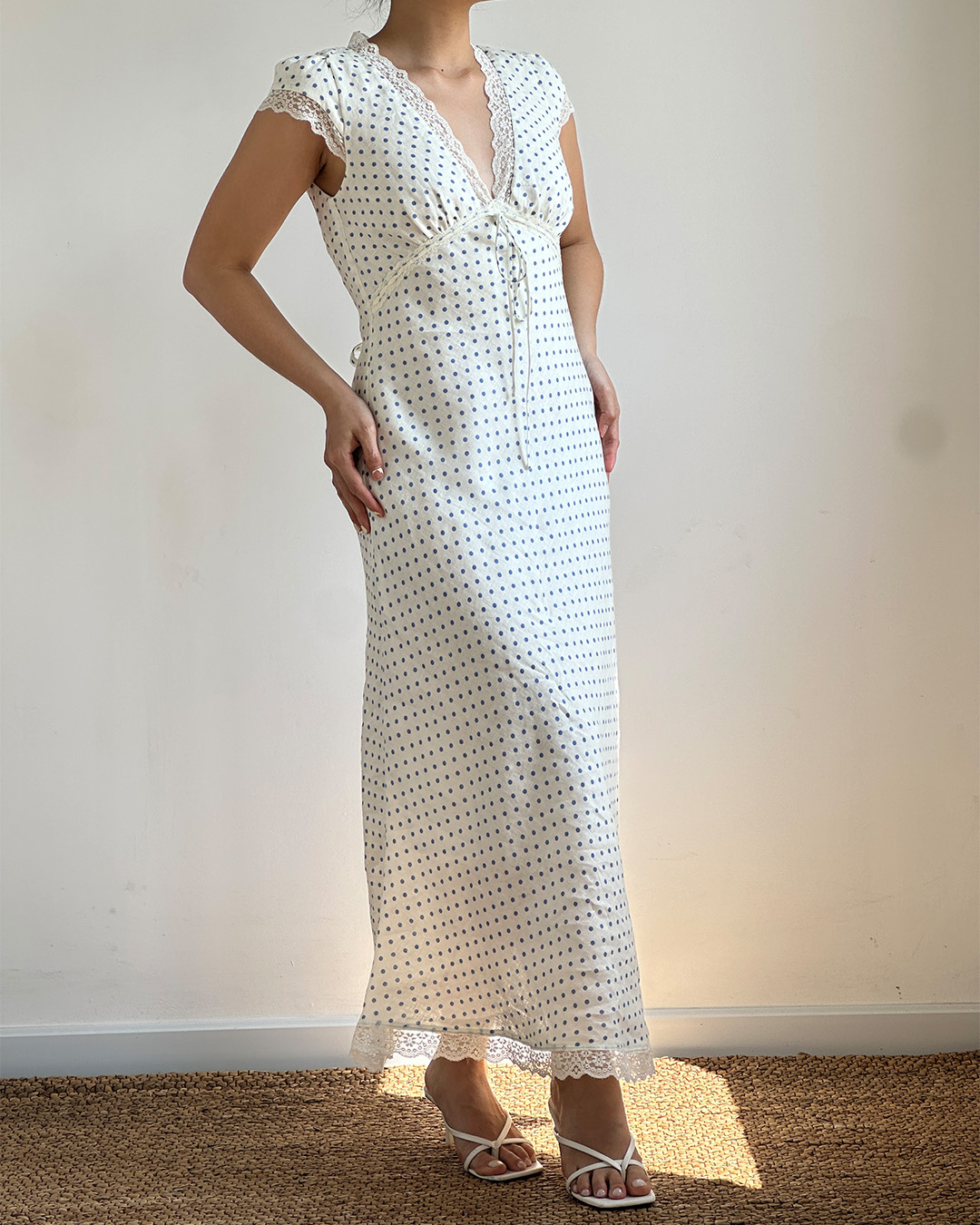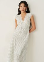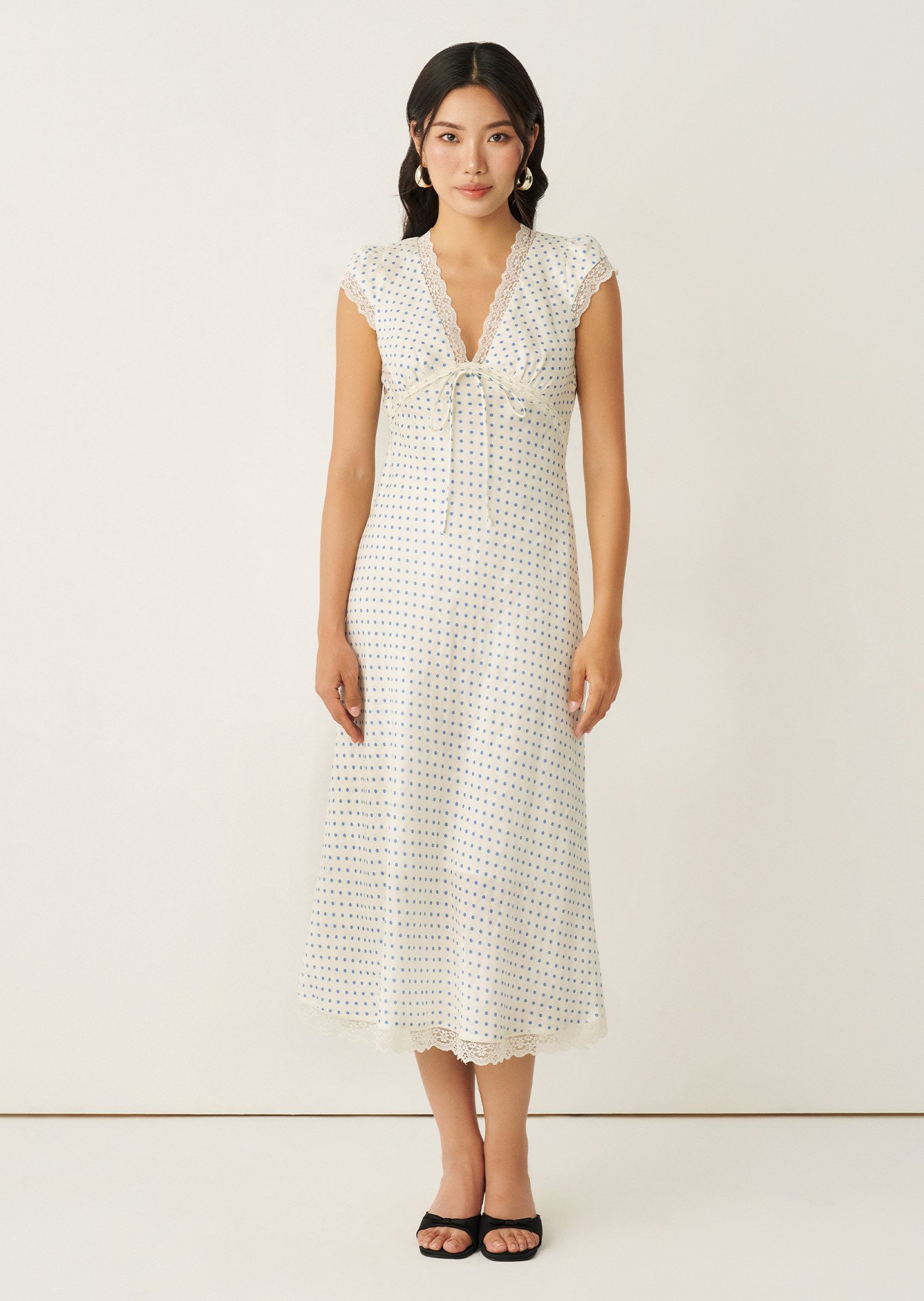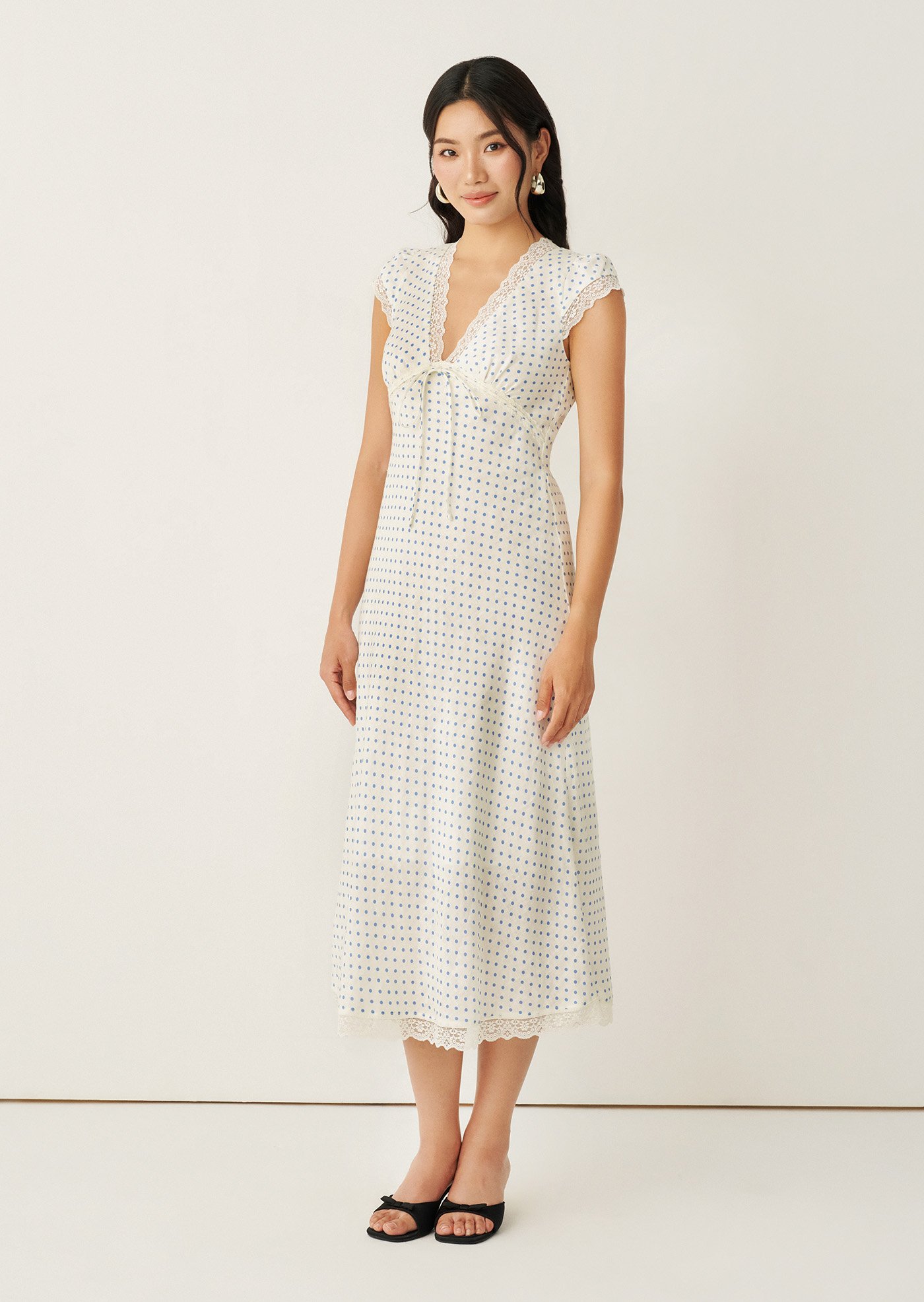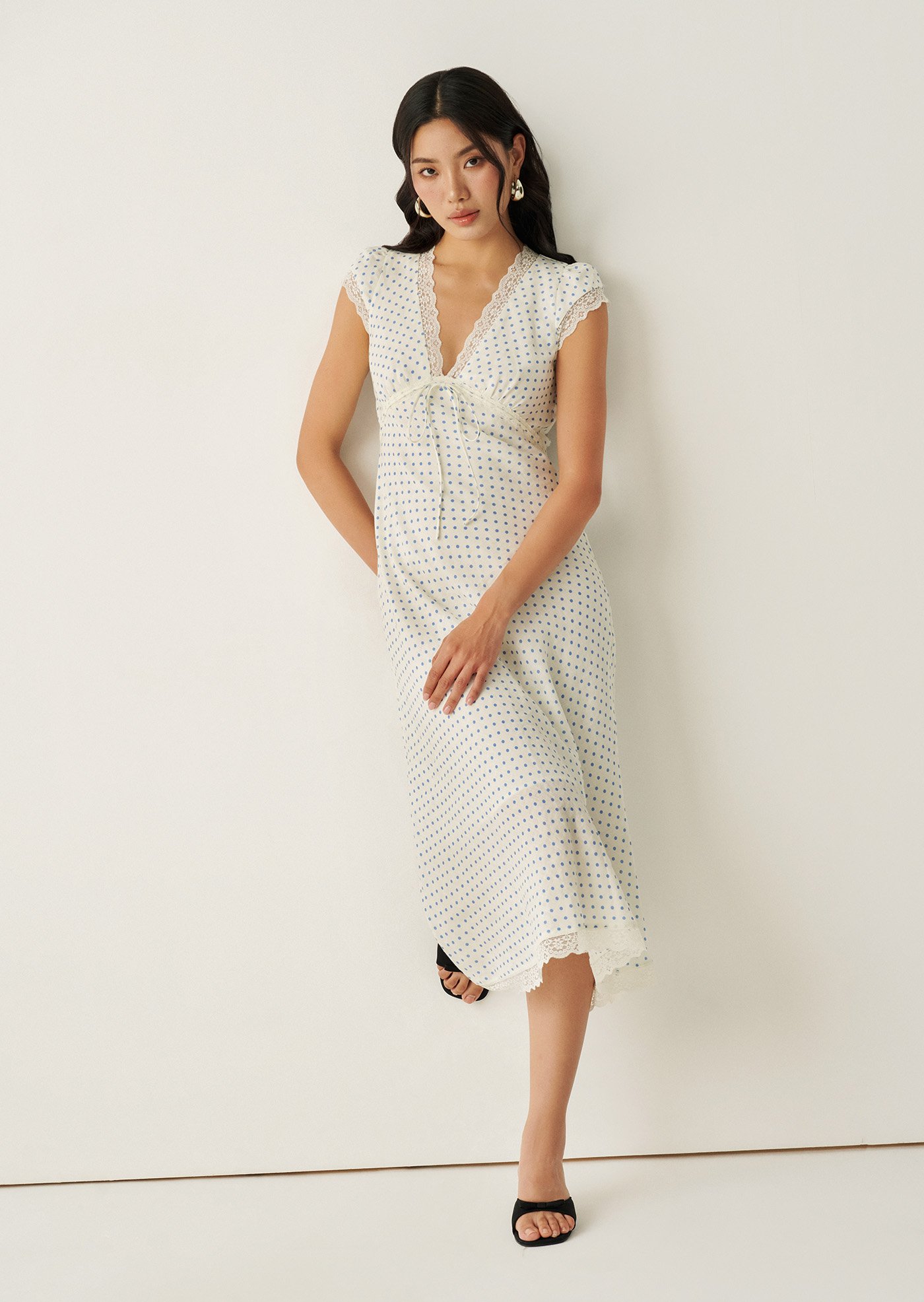 The Carey Midi Dress features a flattering V-neckline with delicate lace trim, soft cap sleeves, and an adjustable underbust tie for a gently shaped silhouette. Cut on the bias for a graceful drape, this midi length piece is equal parts romantic and effortless.