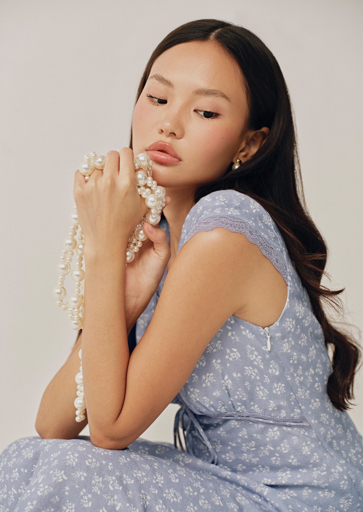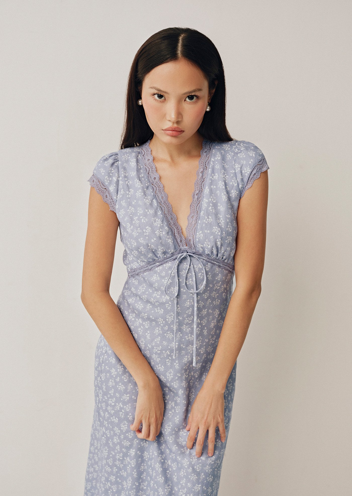 The Carey Midi Dress features a flattering V-neckline with delicate lace trim, soft cap sleeves, and an adjustable underbust tie for a gently shaped silhouette. Cut on the bias for a graceful drape, this midi length piece is equal parts romantic and effortless.