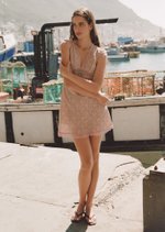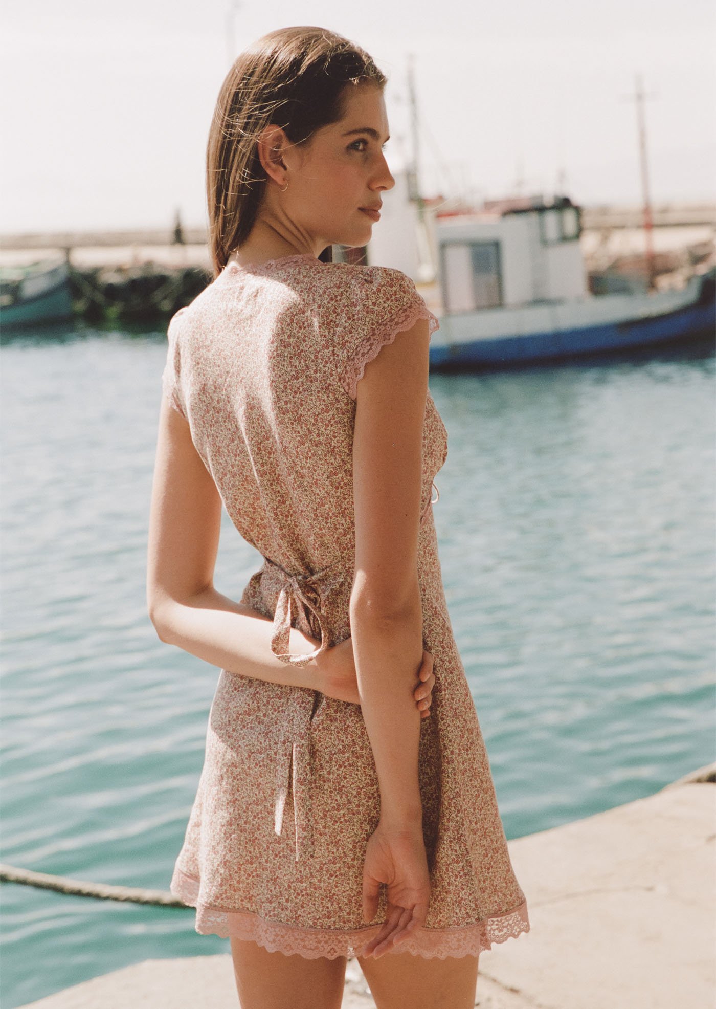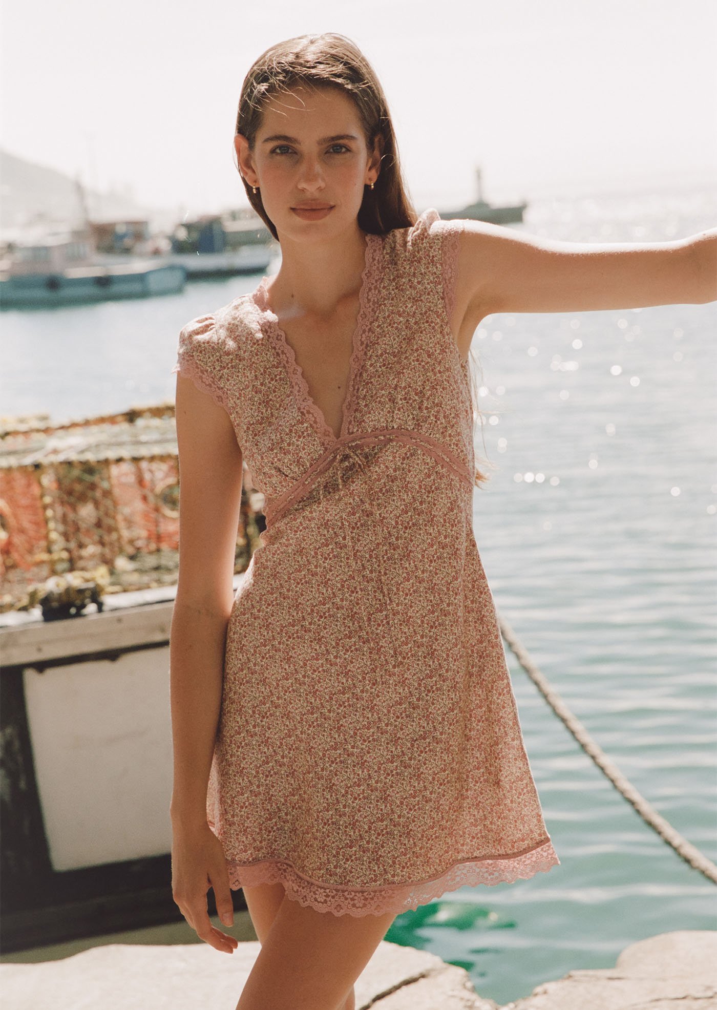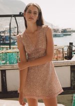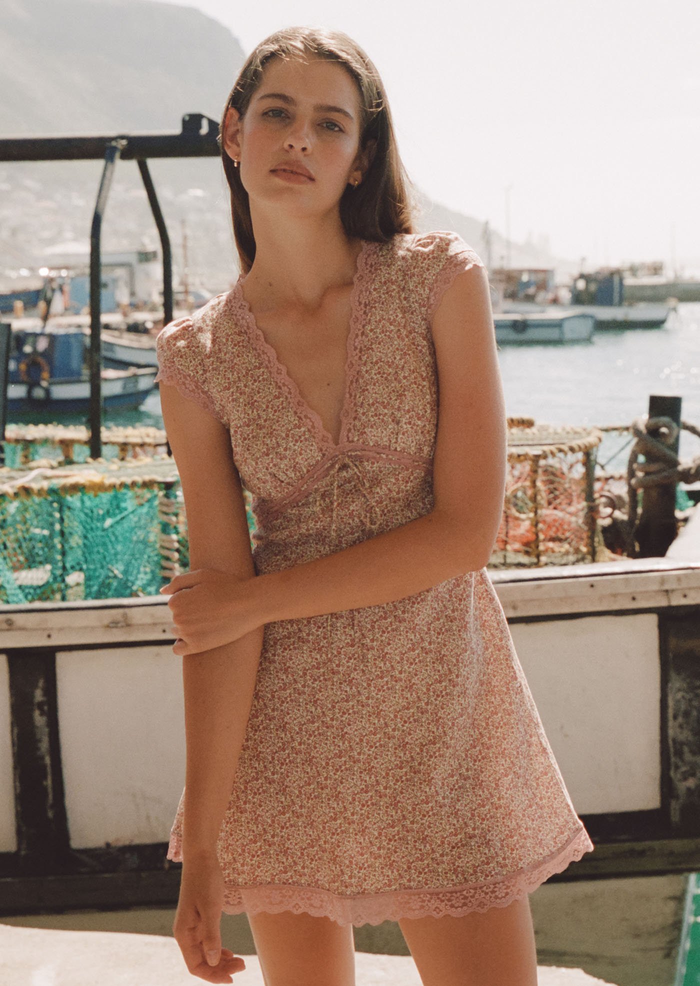 The Carey Mini Dress features a soft V-neckline framed with delicate lace trims and a dainty tie detail at the bust. Designed in a flattering fitted silhouette with a gentle flare, it brings a romantic vintage charm to everyday dressing.