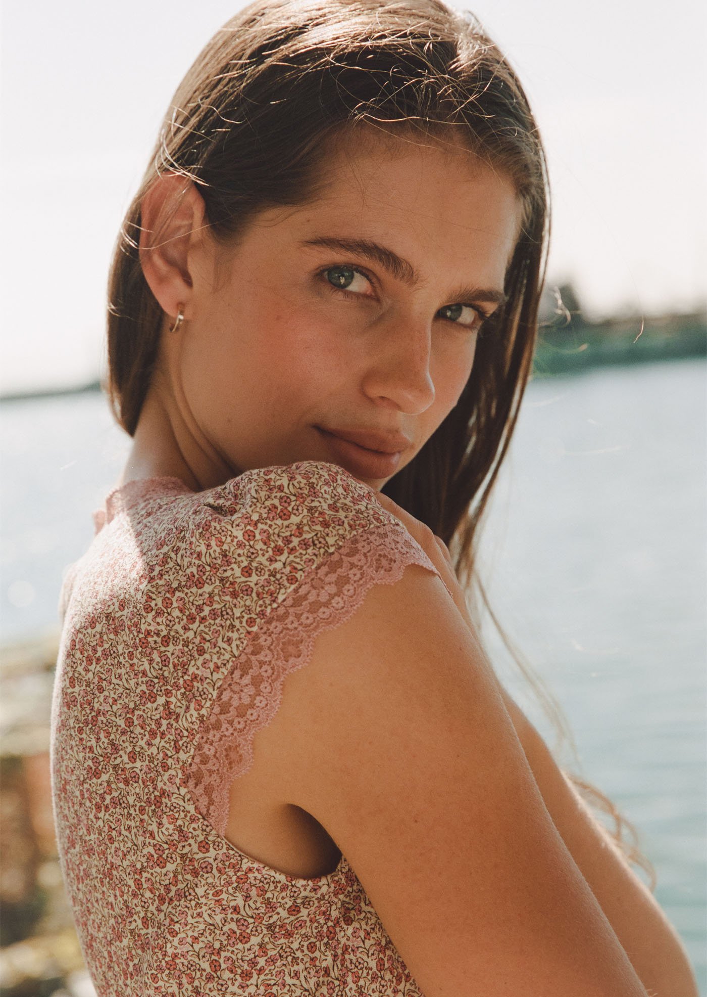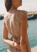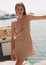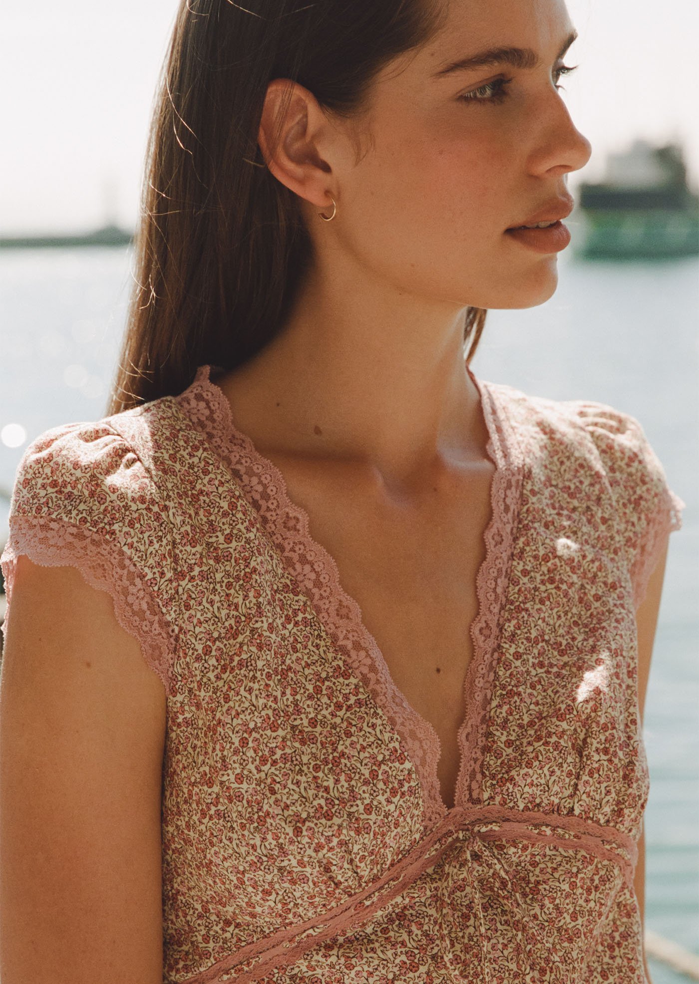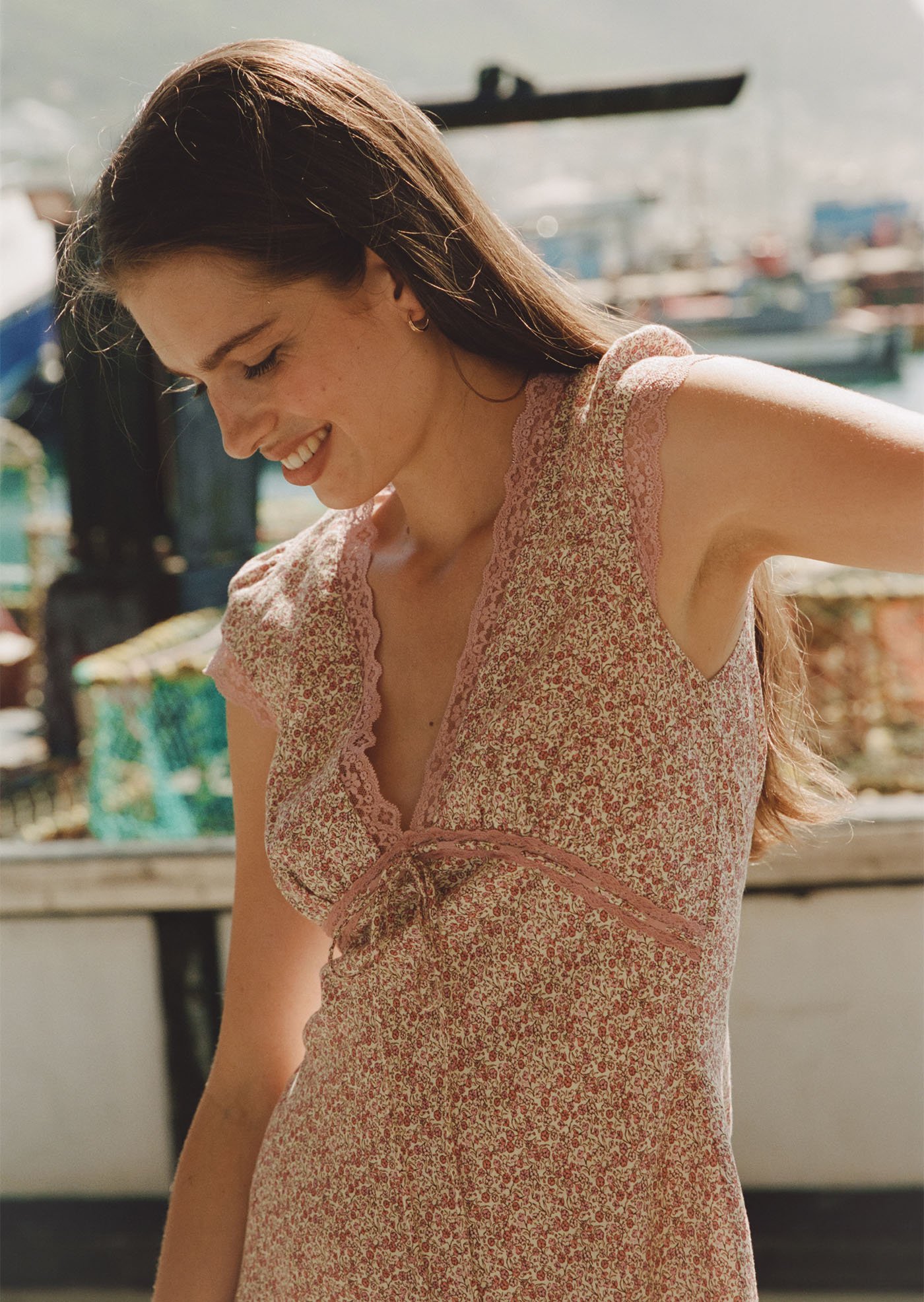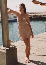 The Carey Mini Dress features a soft V-neckline framed with delicate lace trims and a dainty tie detail at the bust. Designed in a flattering fitted silhouette with a gentle flare, it brings a romantic vintage charm to everyday dressing.