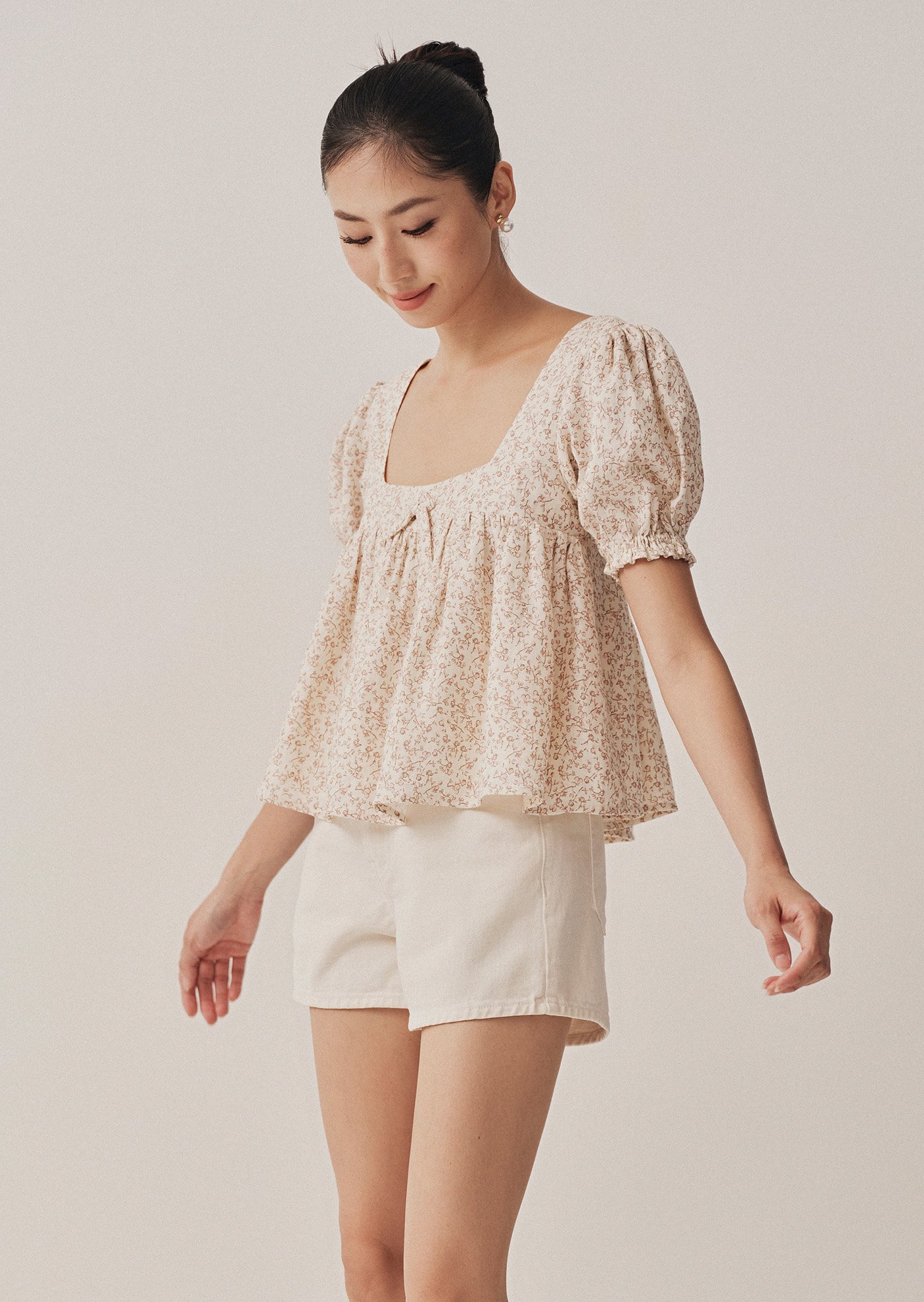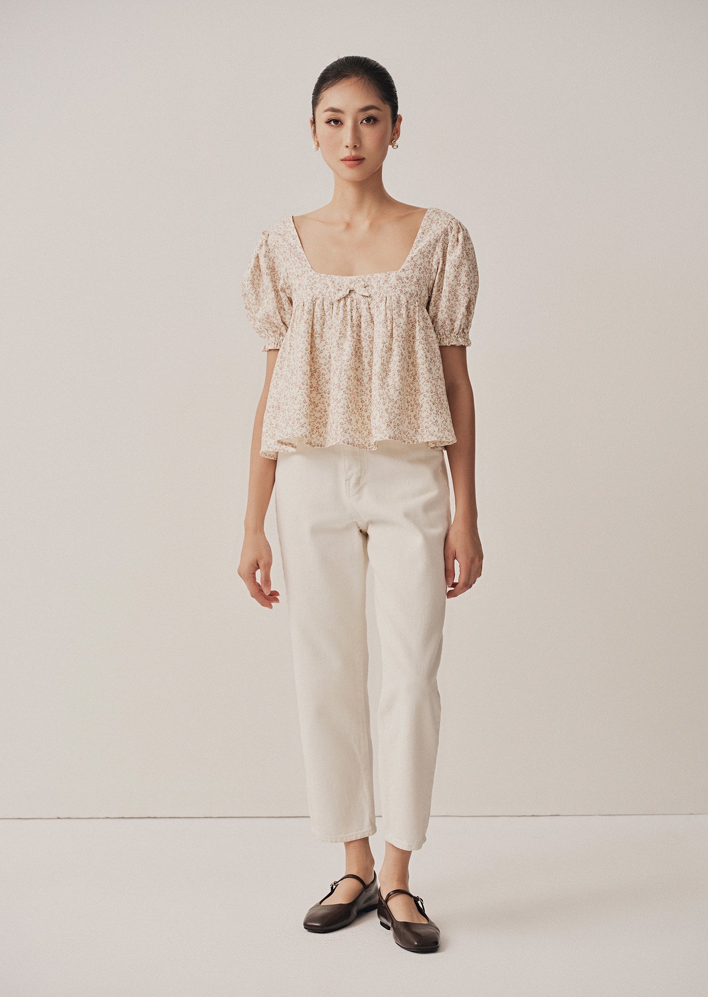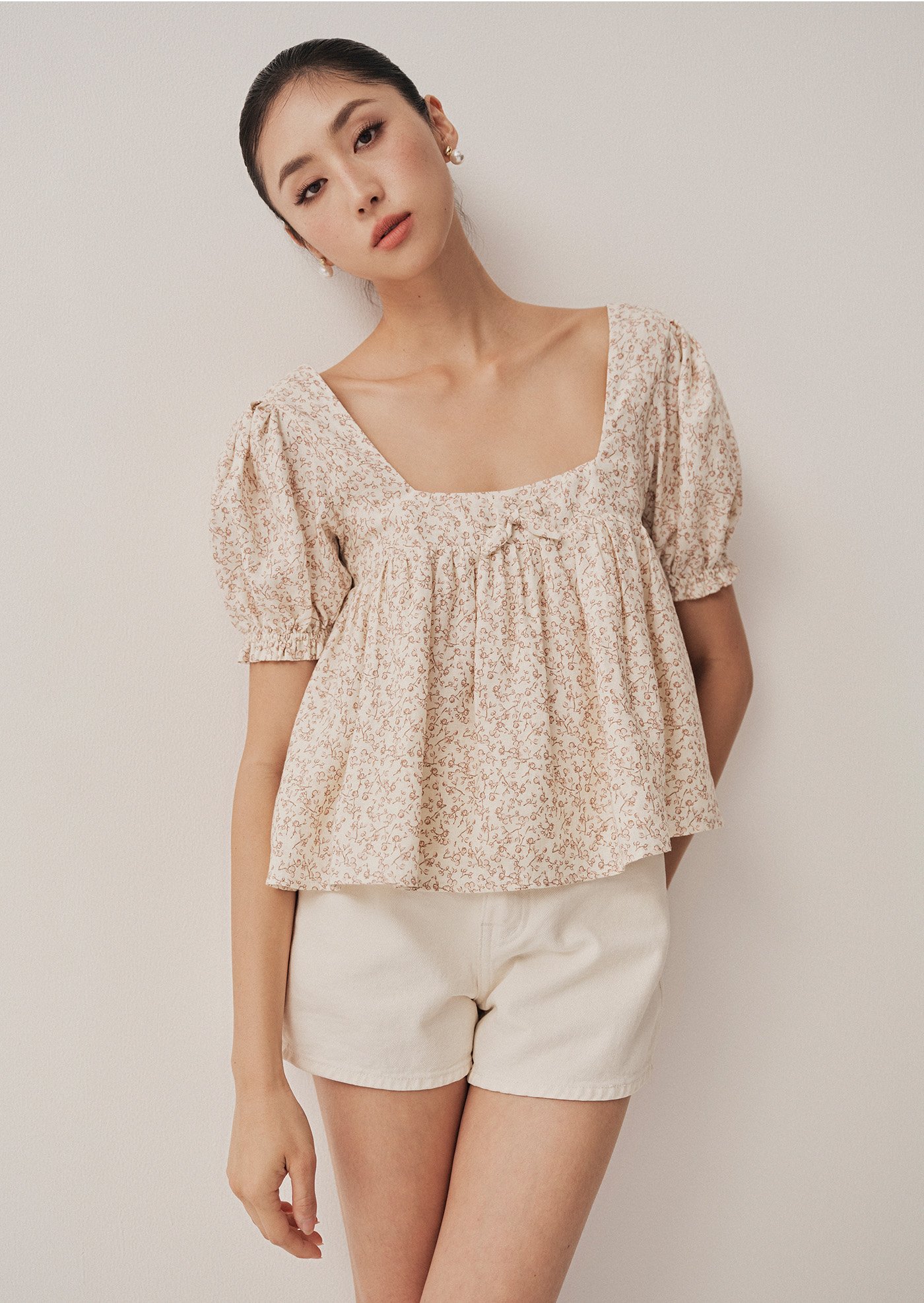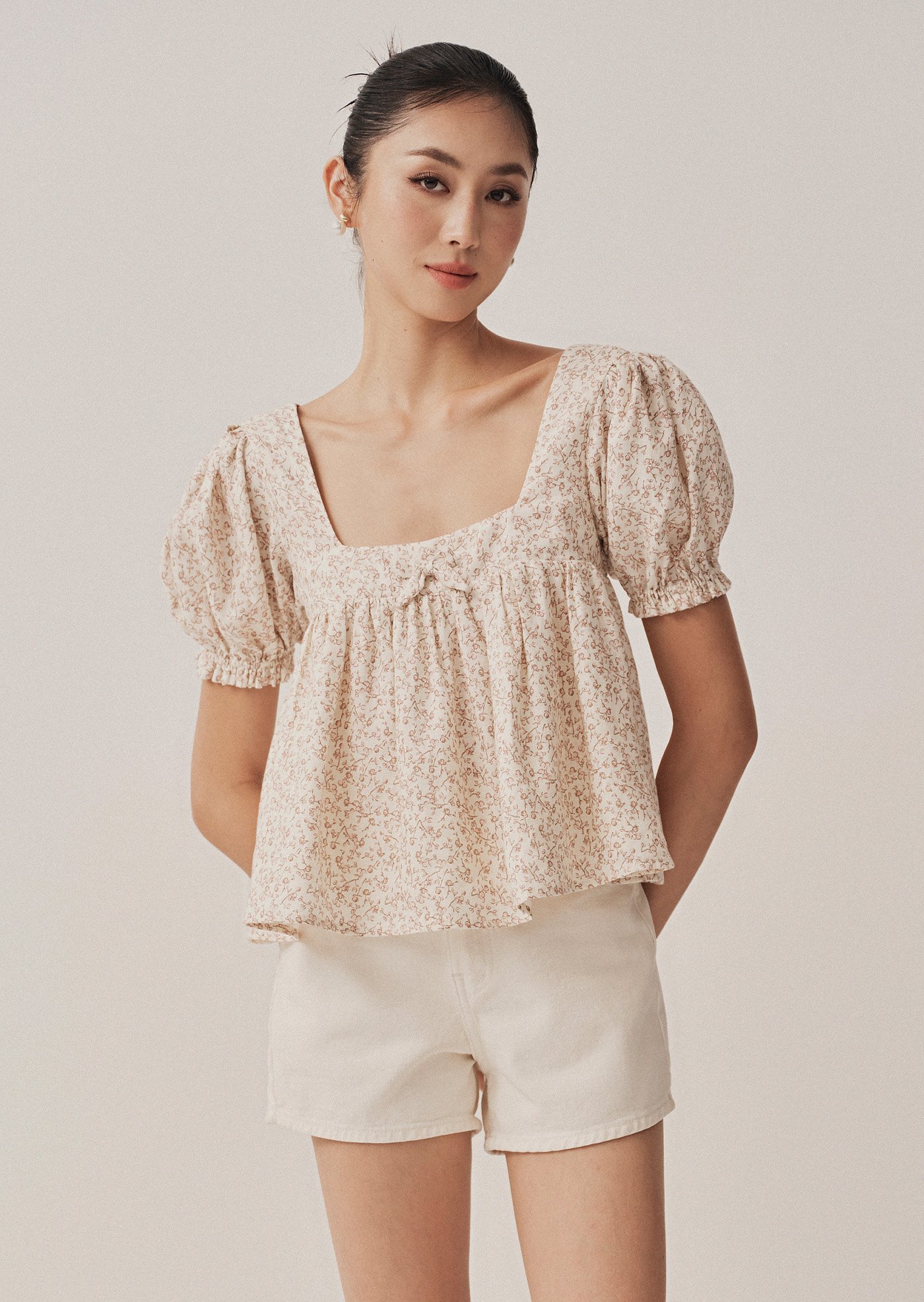 The Cassidy Top is a sweet silhouette with a soft square neckline, puff sleeves, and a relaxed, flowy body finished with a dainty front bow.