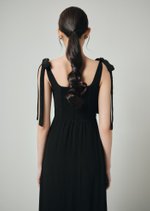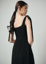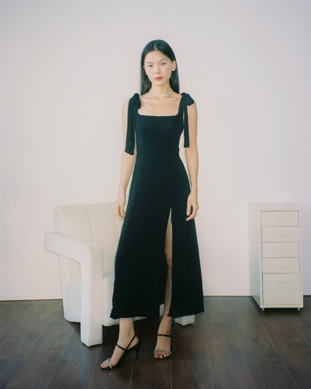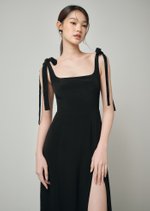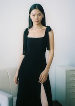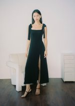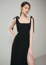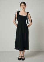 The Cassie midi dress features a square neckline with self-tied straps and a front side slit for that extra comfort and room for movement with style.