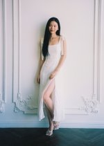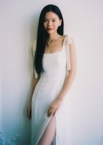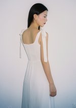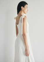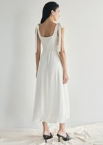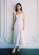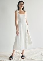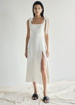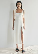 The Cassie midi dress features a square neckline with self-tied straps and a front side slit for that extra comfort and room for movement with style.