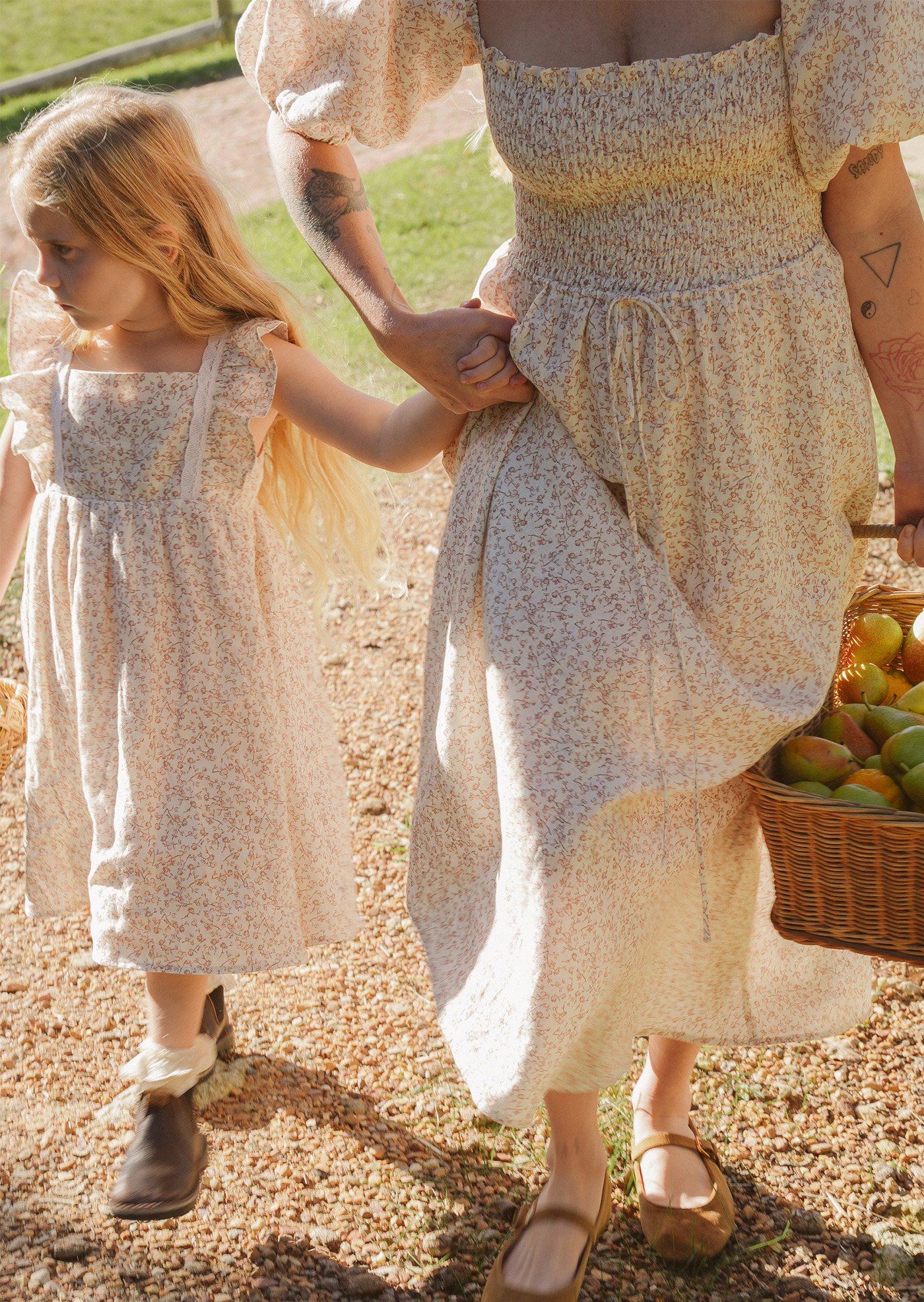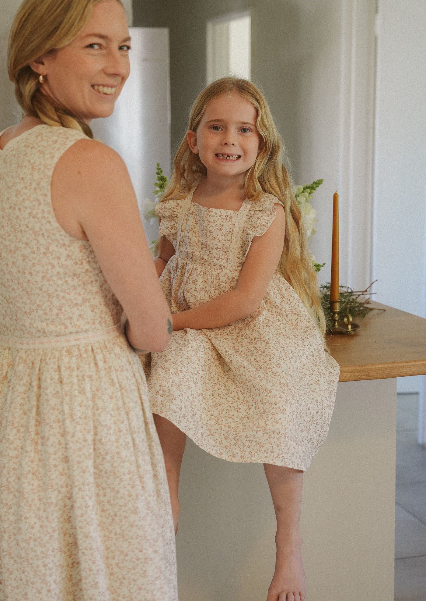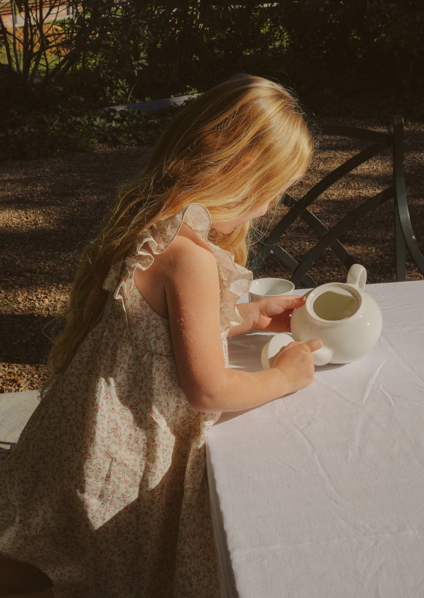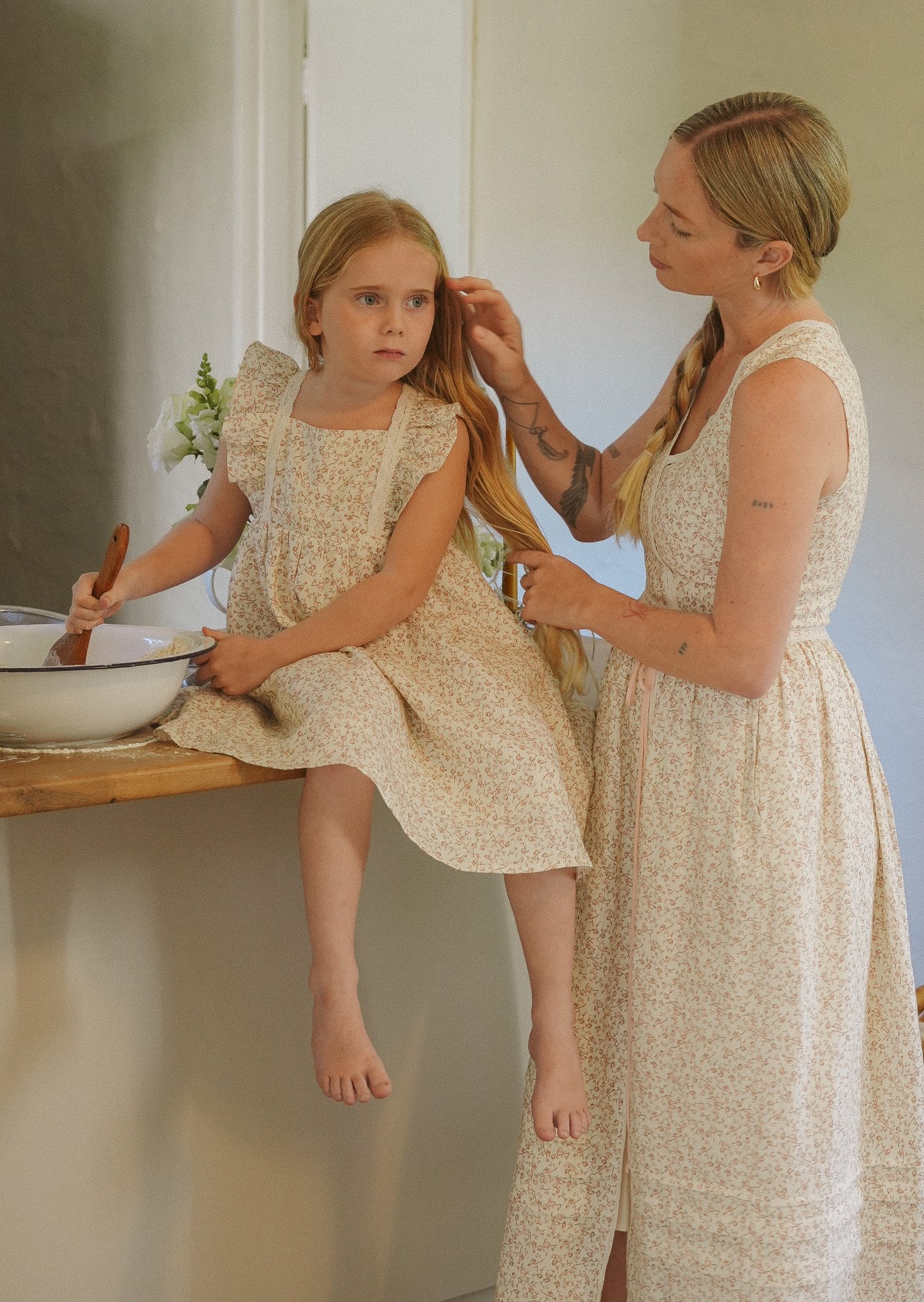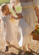 A sweet, twirl-friendly dress for sunny days and special moments. The Cherrie dress features soft ruffled straps, delicate lace detailing, and a gentle floral print — made for little ones who love to move, play, and dream in comfort.