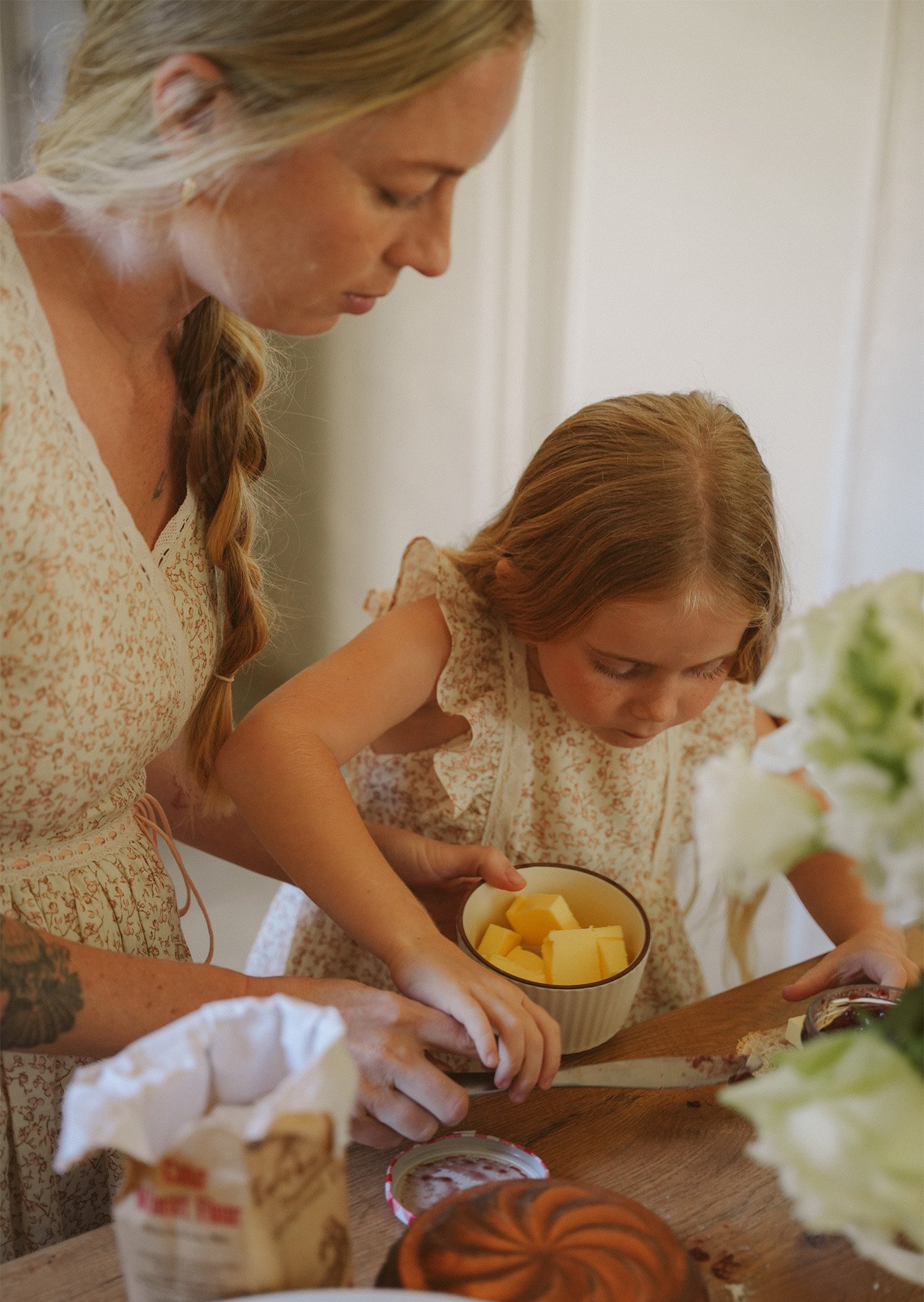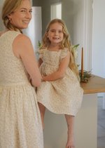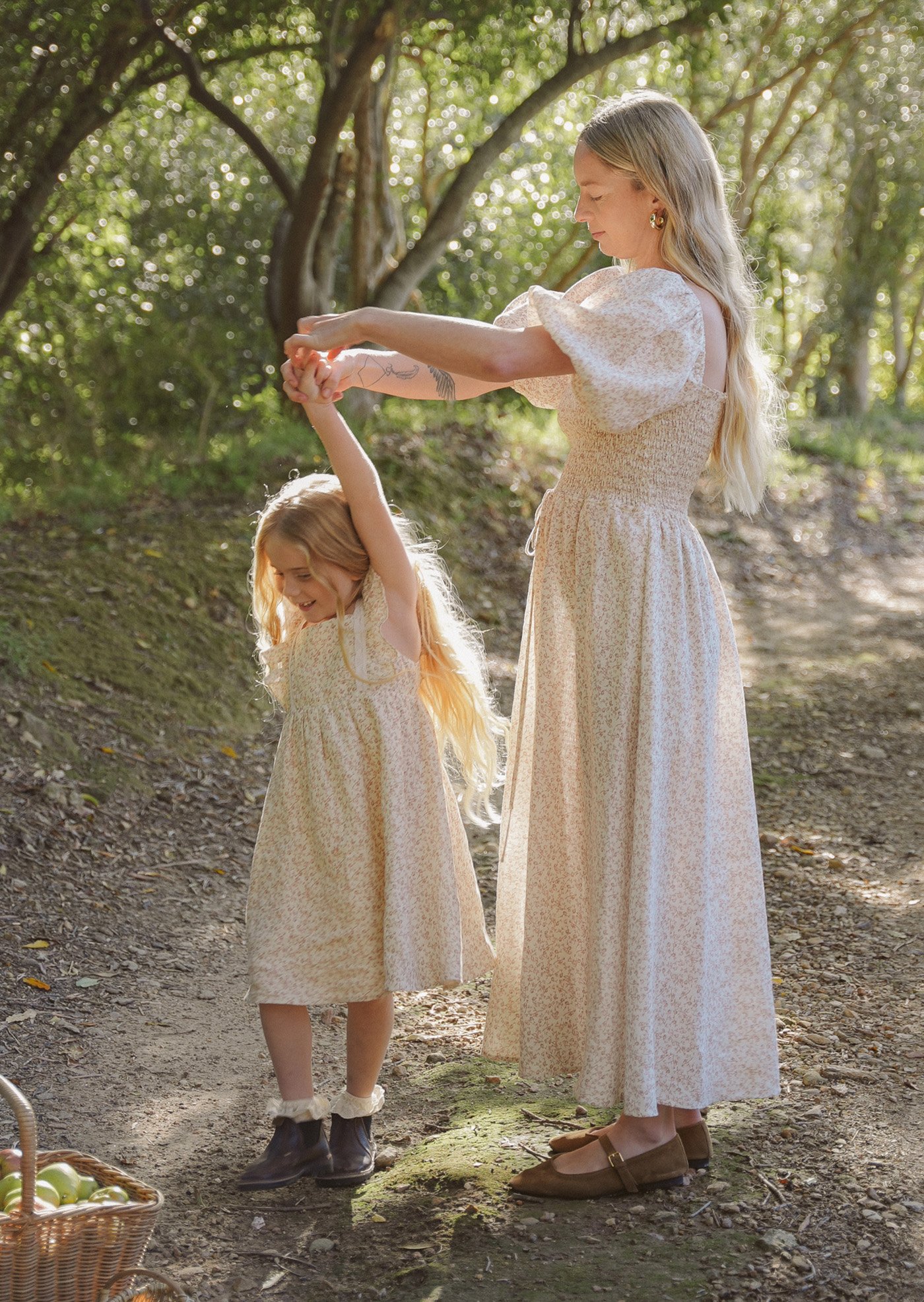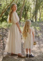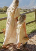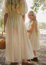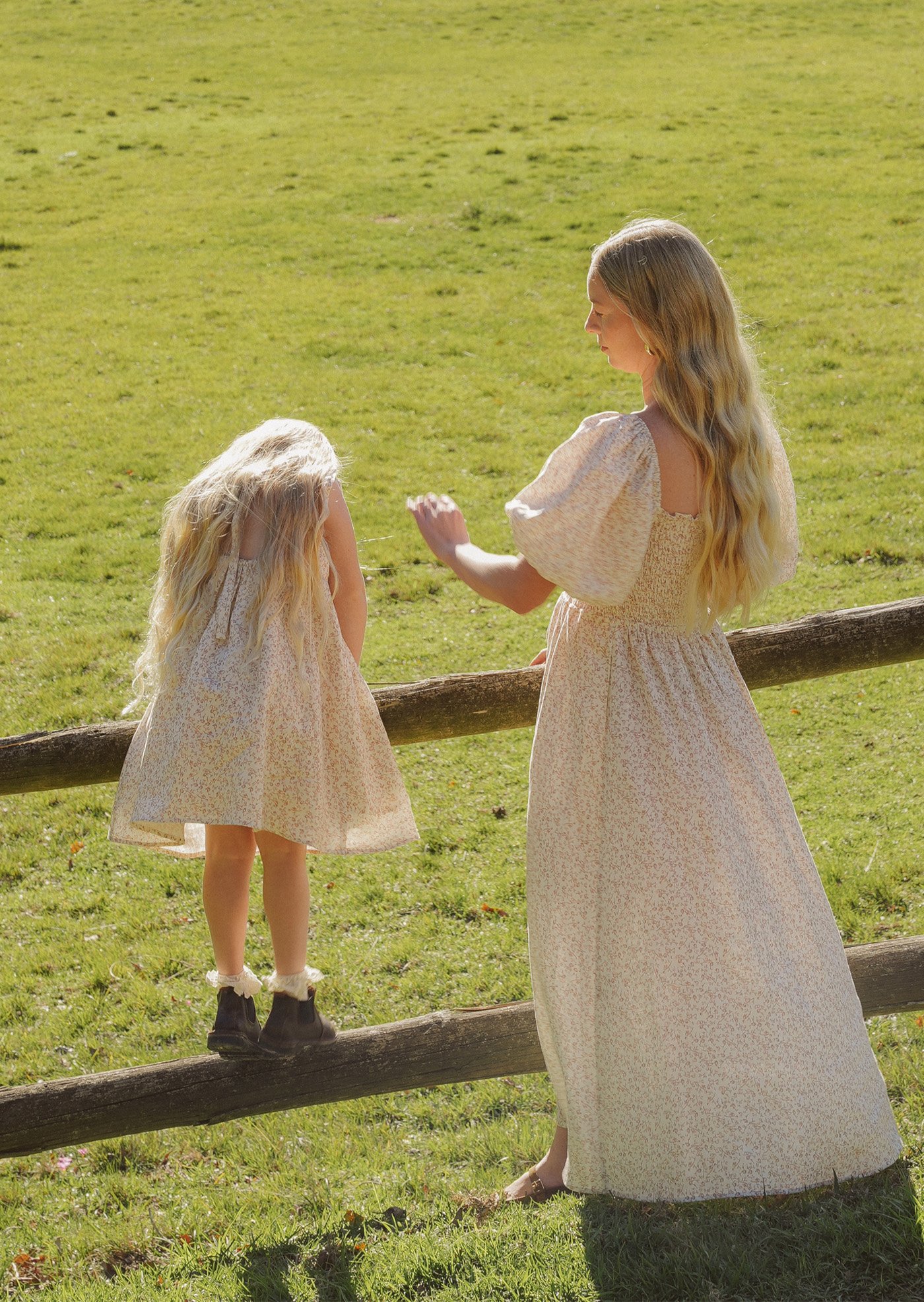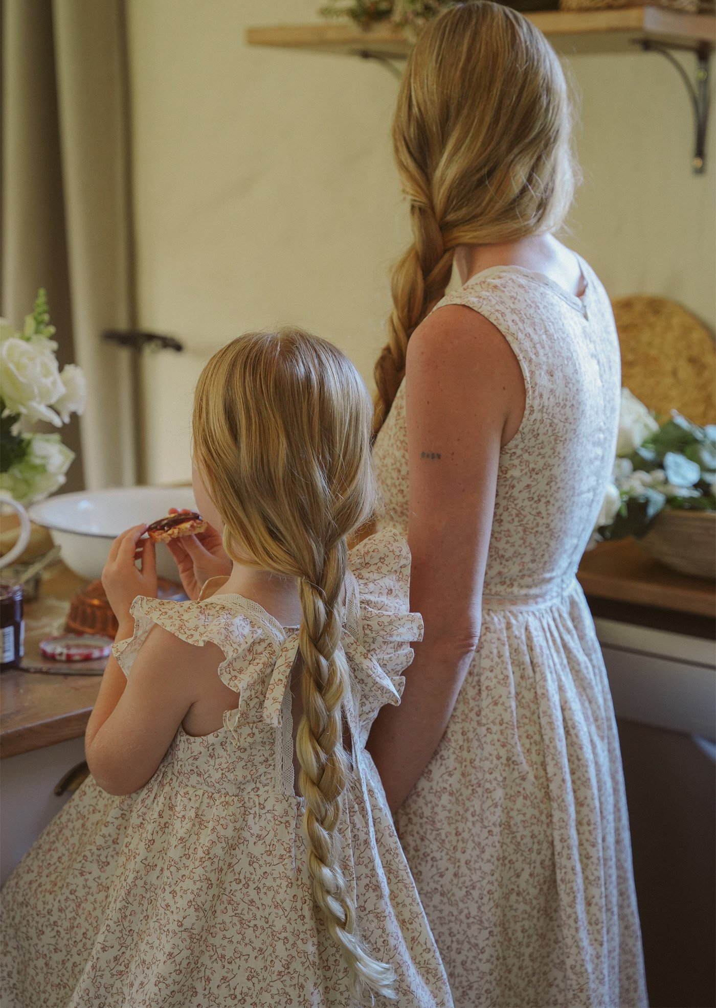 A sweet, twirl-friendly dress for sunny days and special moments. The Cherrie dress features soft ruffled straps, delicate lace detailing, and a gentle floral print — made for little ones who love to move, play, and dream in comfort.