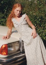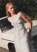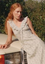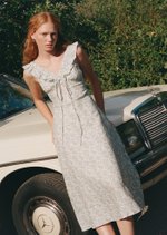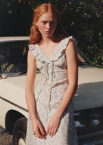 The Clementine Midi Dress features a ruffled V-neckline with a dainty tie detail, soft shoulder ruffles, and a gently gathered bust for a flattering, feminine shape. Finished with a flared midi skirt, invisible back zip, and full lining, it’s a romantic silhouette made for sunlit days.