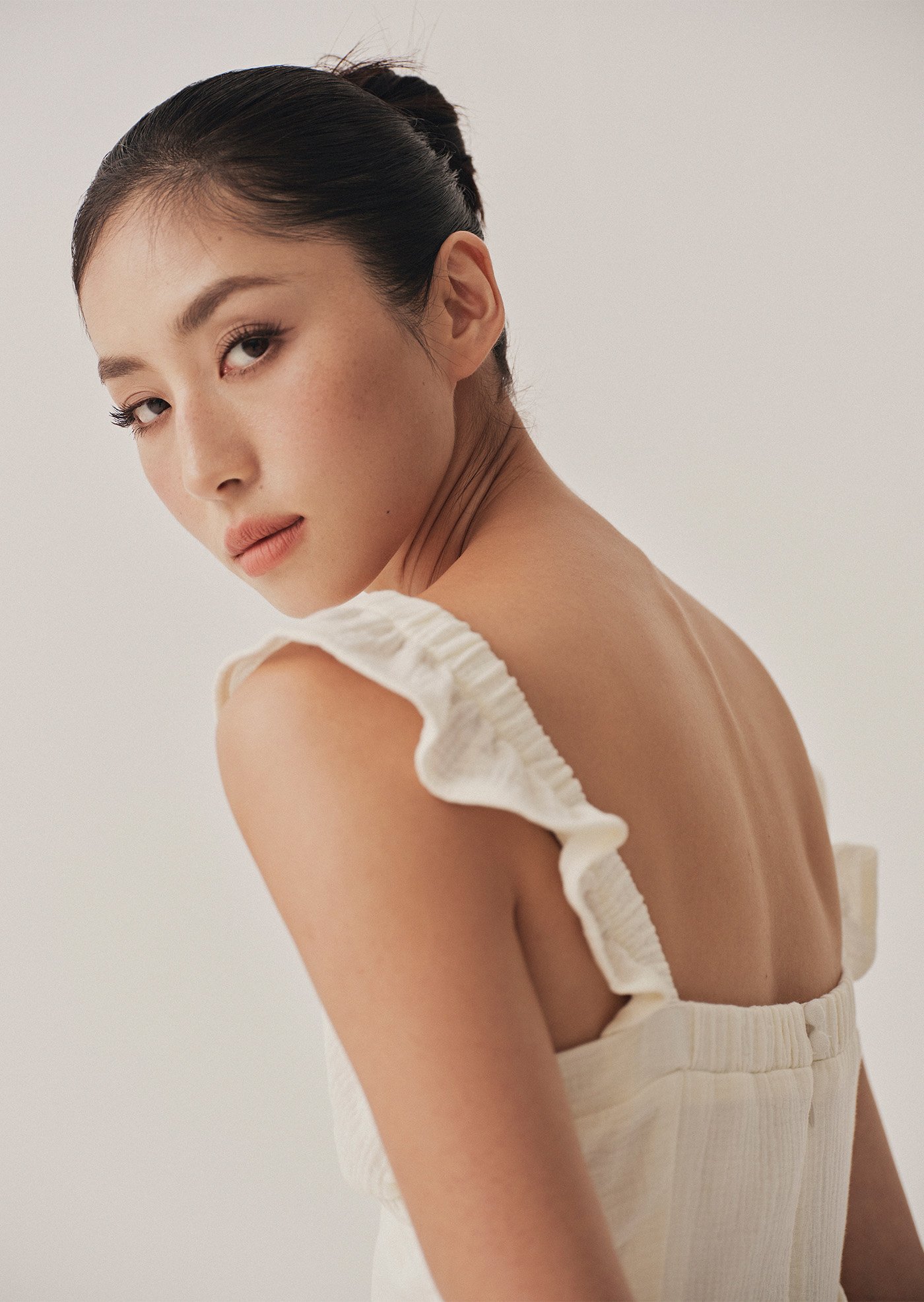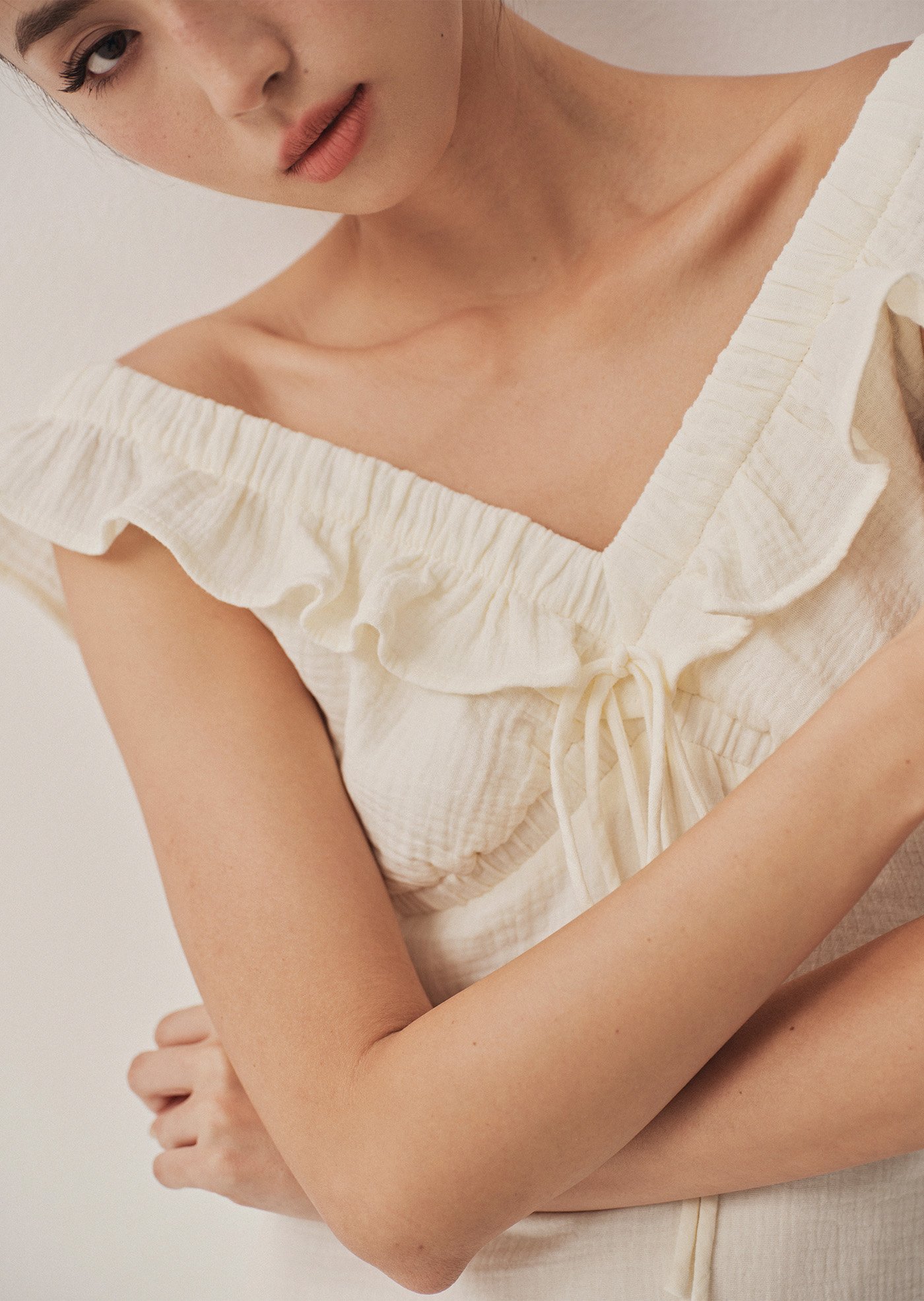-Sleeveless with soft shoulder ruffles