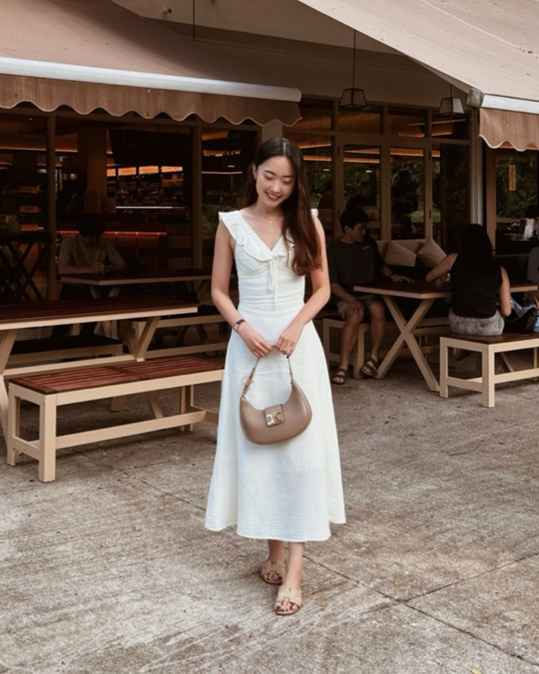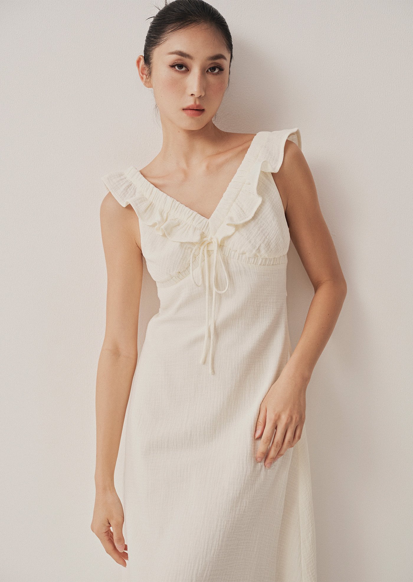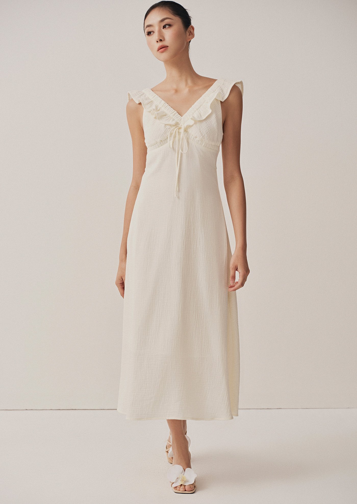 The Clementine Midi Dress features a ruffled V-neckline with a dainty tie detail, soft shoulder ruffles, and a gently gathered bust for a flattering, feminine shape. Finished with a flared midi skirt, invisible back zip, and full lining, it’s a romantic silhouette made for sunlit days.