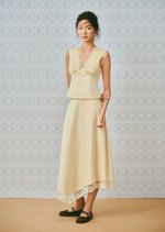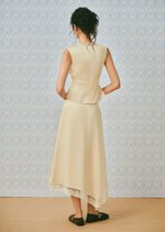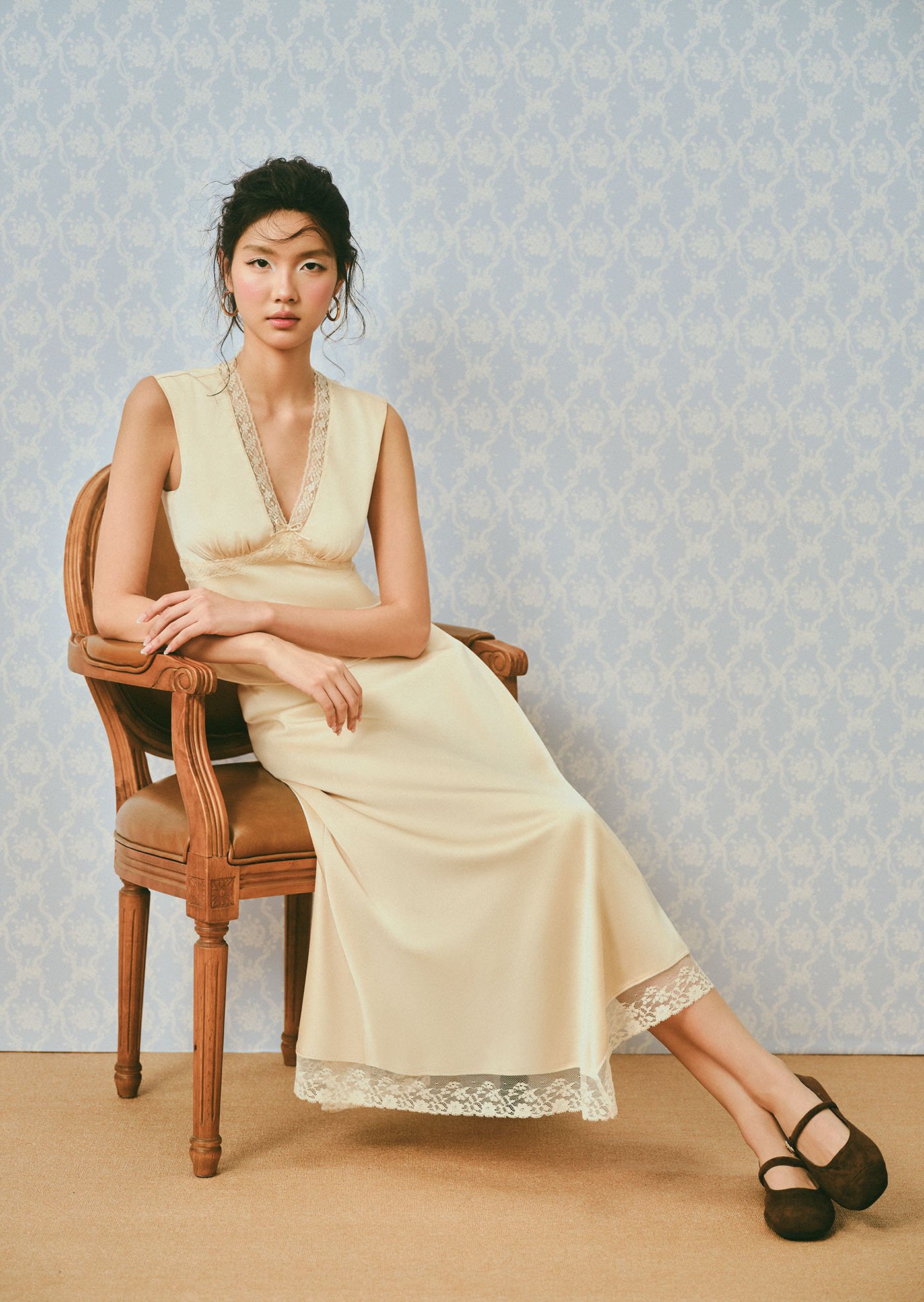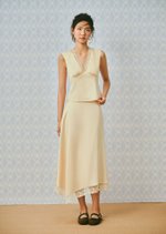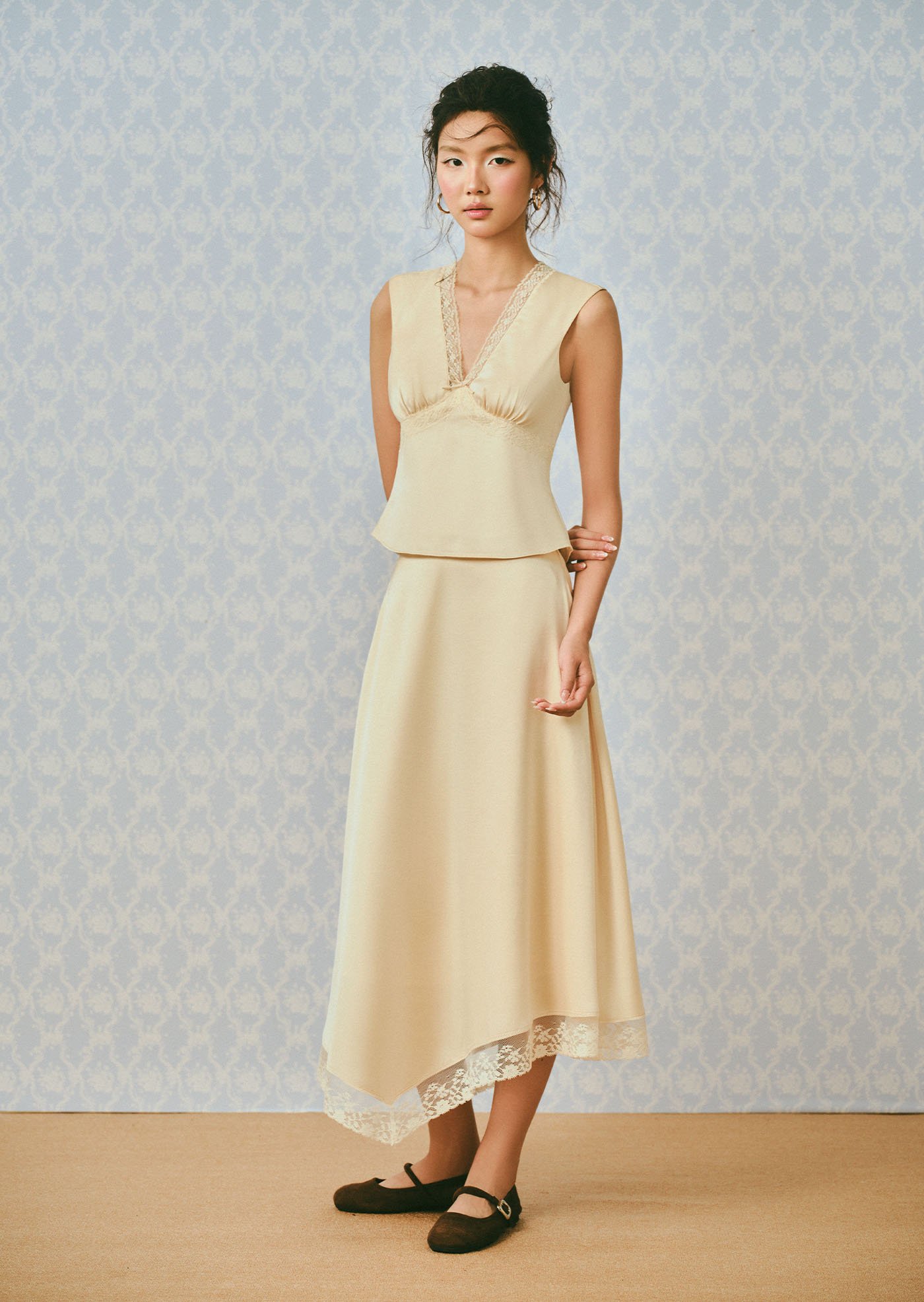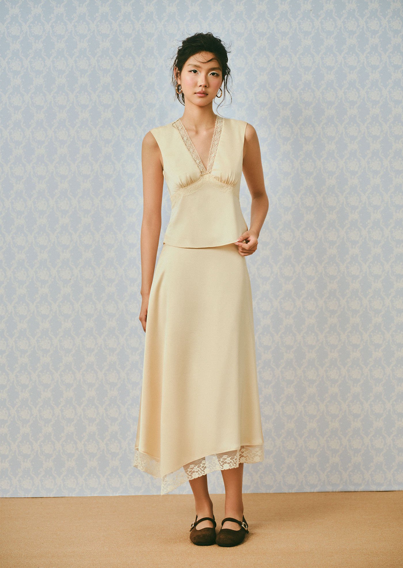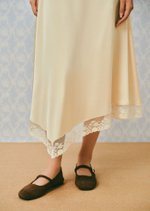 The Cloudlight Midi Skirt features a fluid silhouette with a softly draped hem and delicate lace trim peeking through the layers, creating a light and graceful movement with every step.