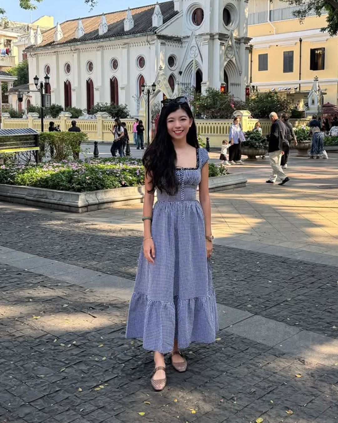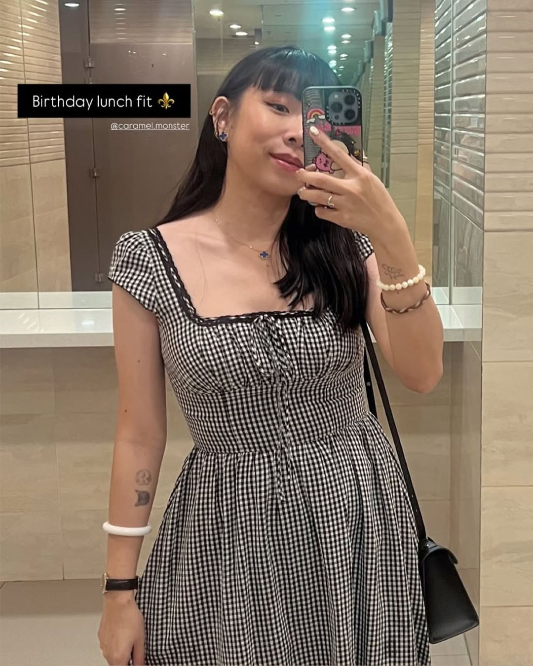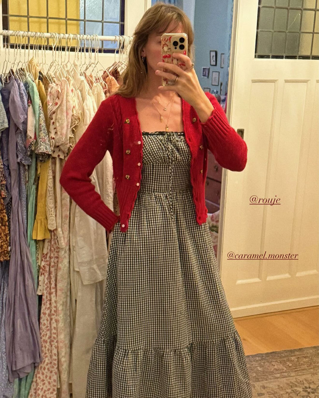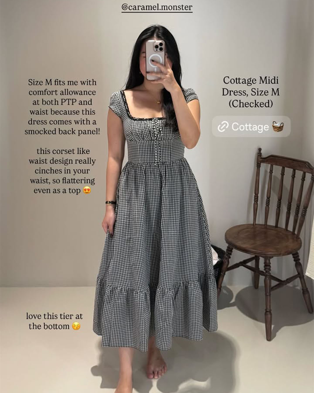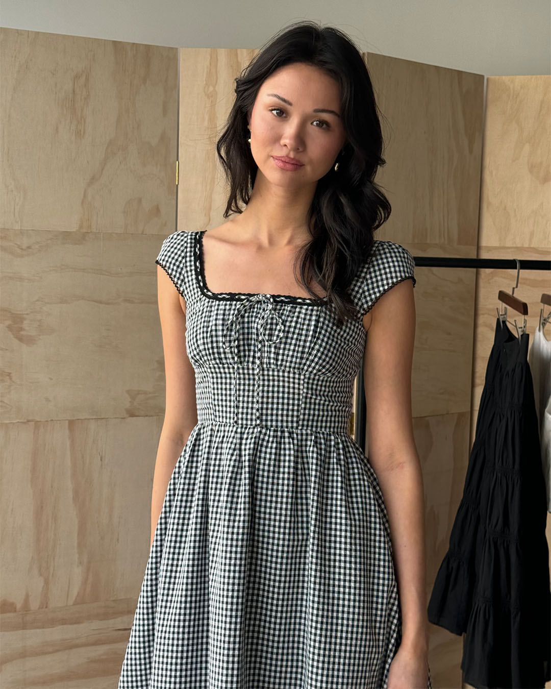 The Cottage Midi Dress features a square neckline with lace trim, bow detail, and a fitted bodice that flows into a tiered midi skirt. Rendered in classic gingham with hidden pockets, it’s a romantic yet easy piece for everyday wear.