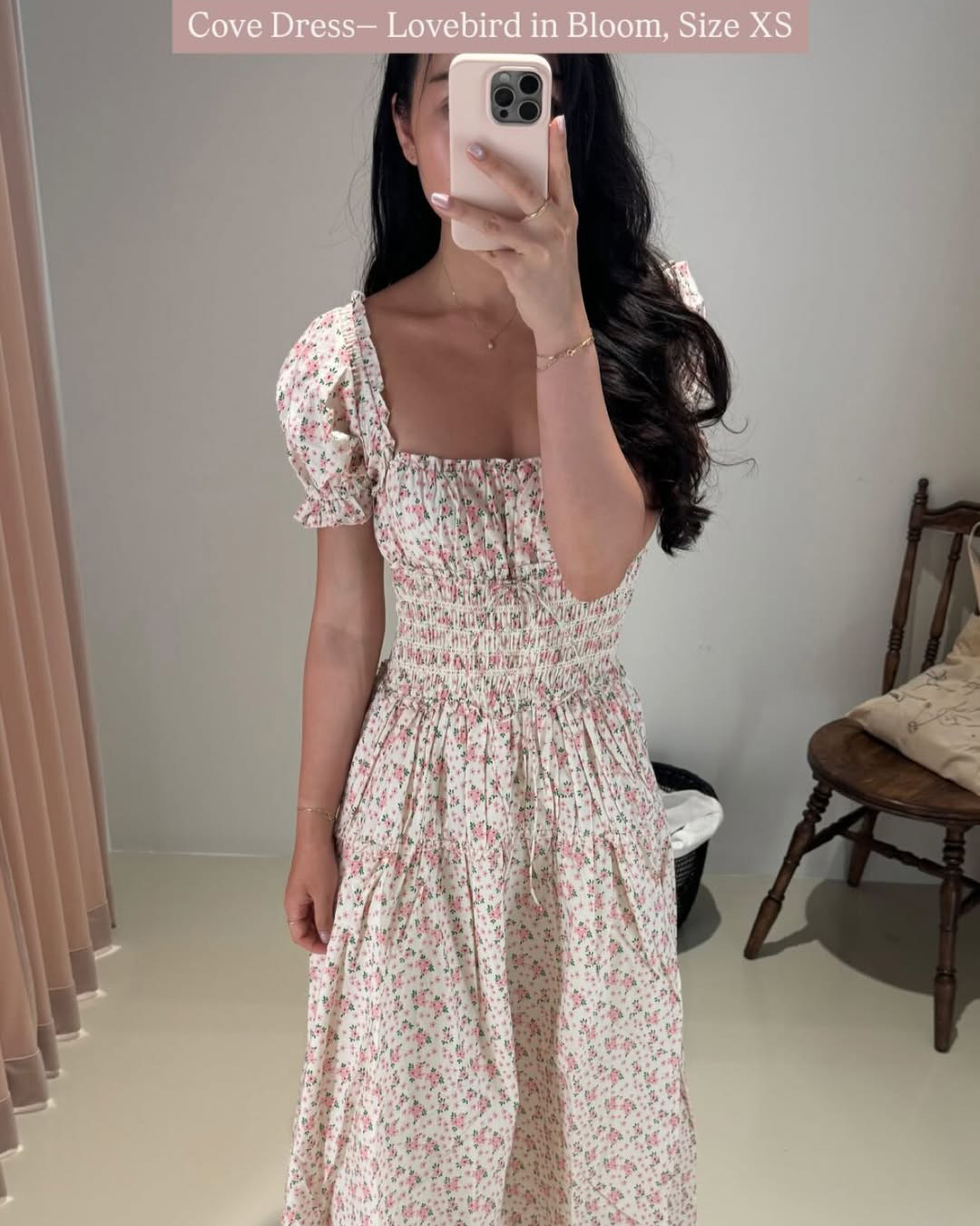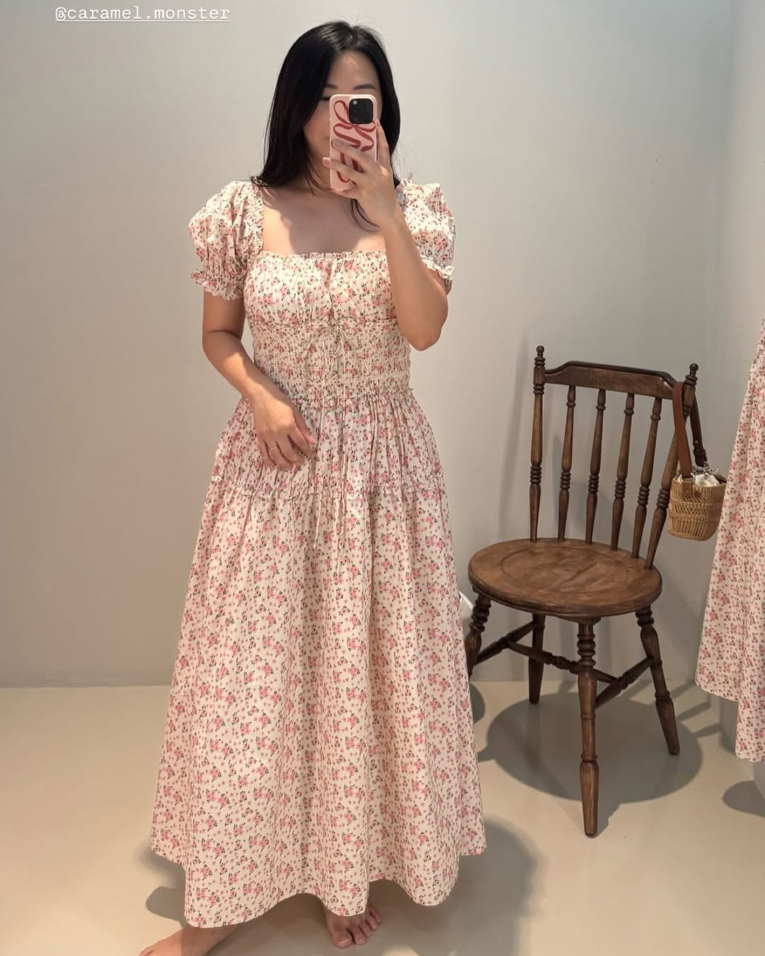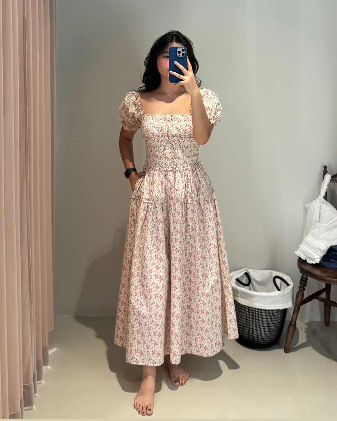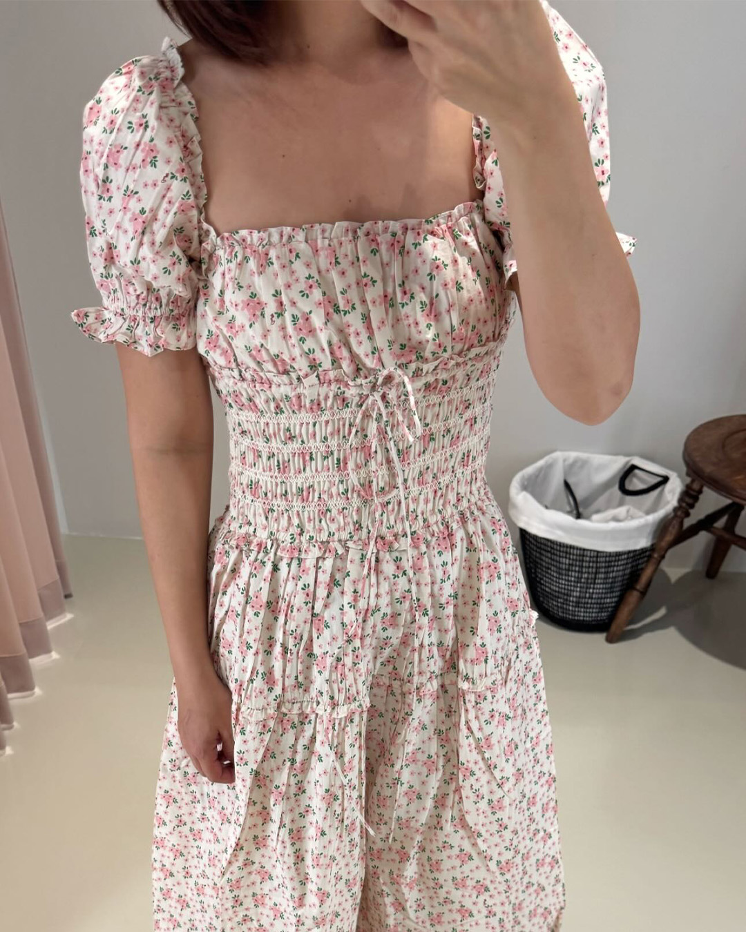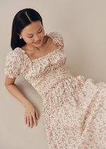 Featuring a smocked bodice that hugs comfortably, puffed sleeves with gentle ruffles, and a flowy midaxi skirt, this dress moves effortlessly between everyday ease and quiet elegance. Printed with delicate vintage-inspired florals on breathable cotton, it’s the kind of piece made for slow days and long strolls.