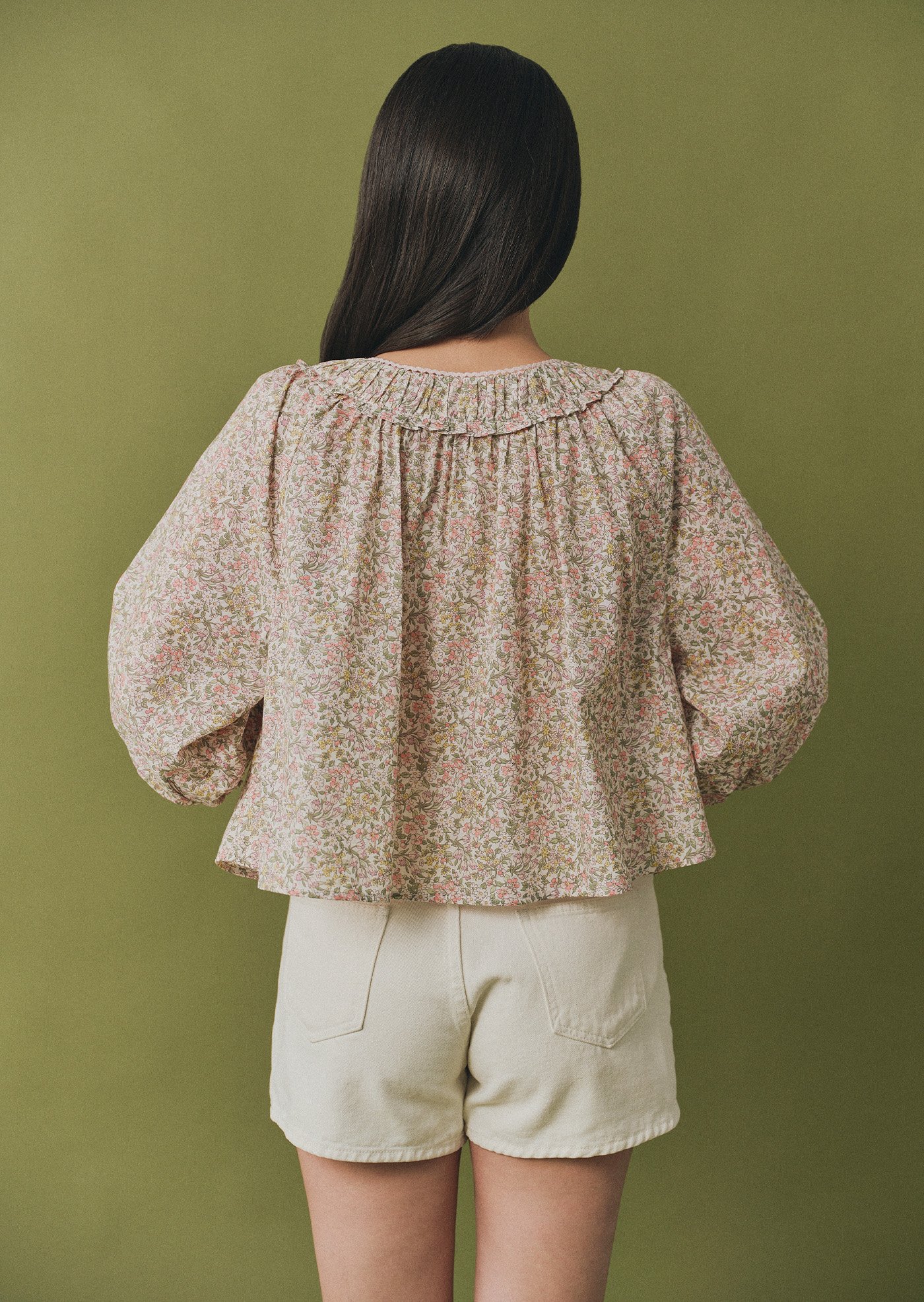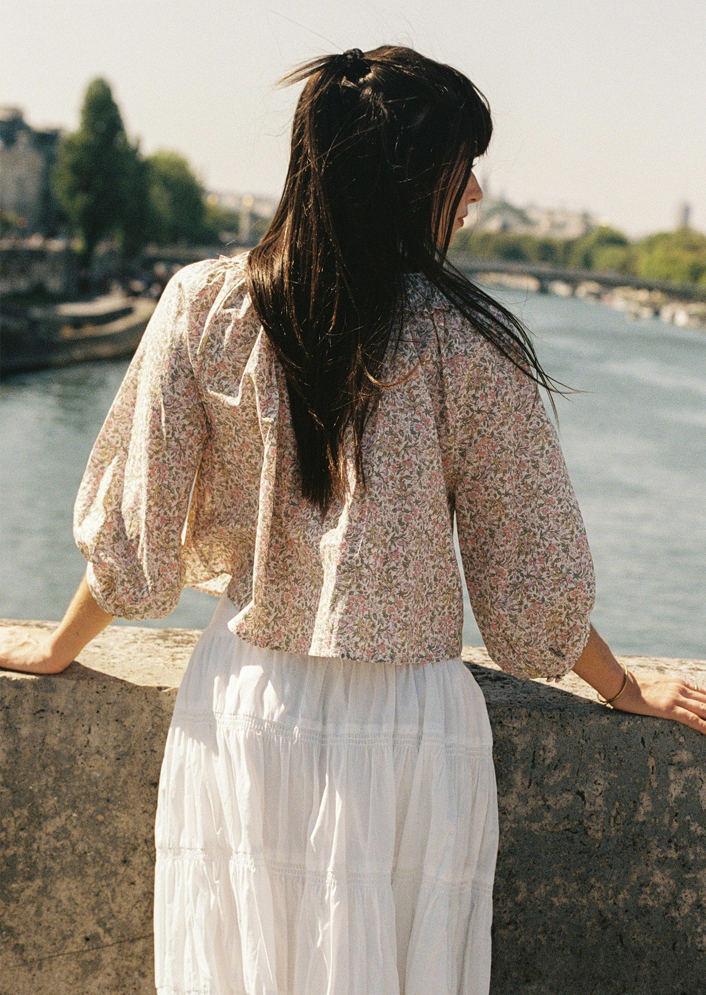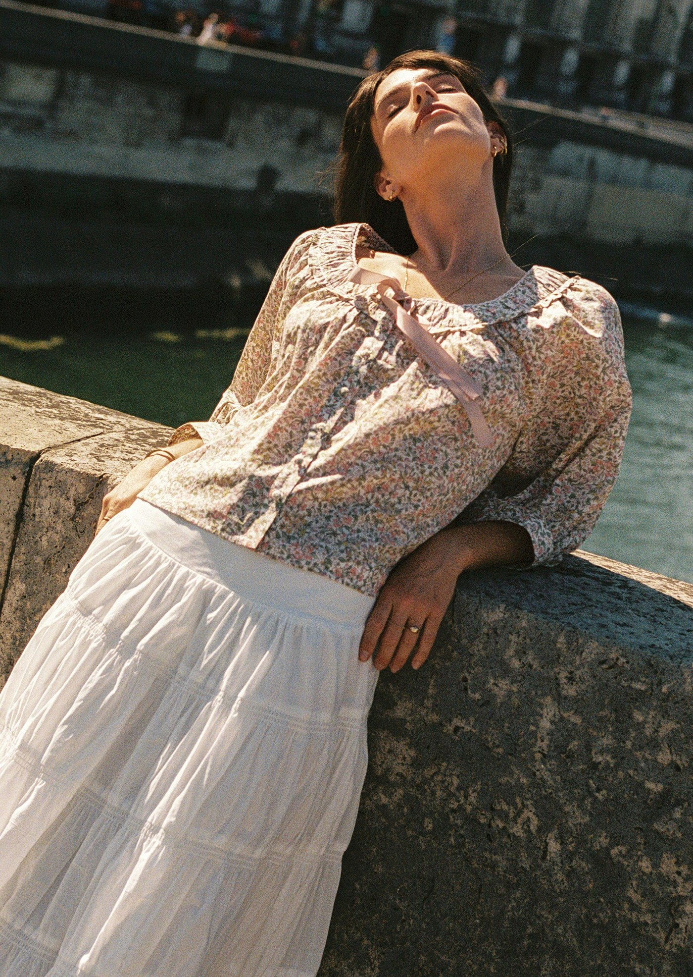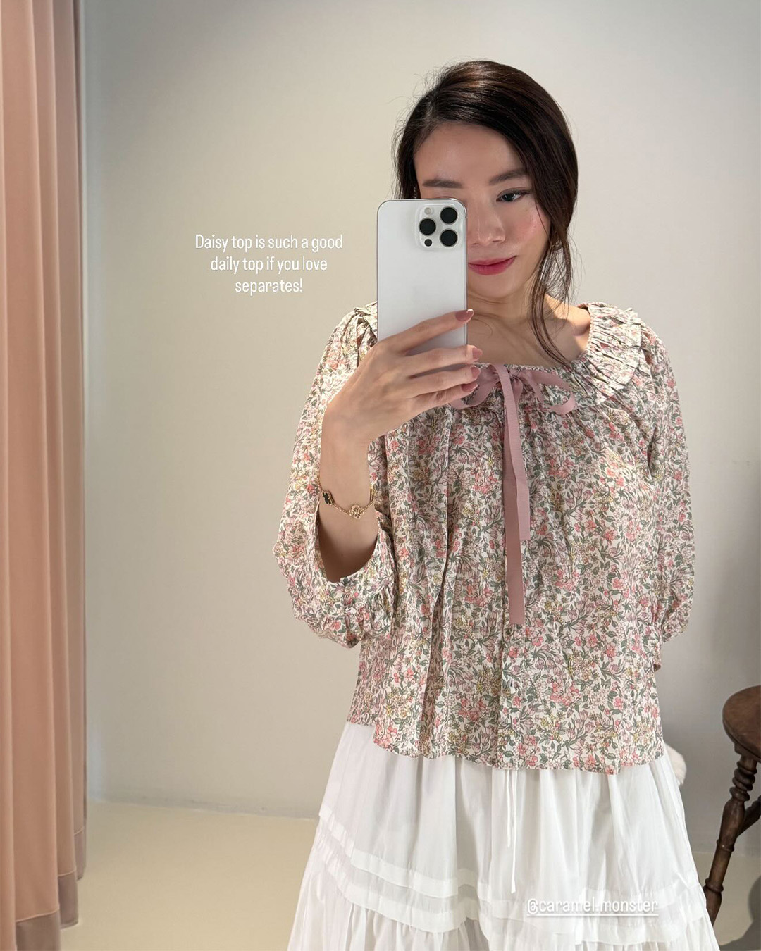 The Daisy Top is a romantic everyday piece with soft florals, a ruffled neckline, and a sweet bow detail. Its light cotton fabric and gentle volume make it perfect for effortless styling from day to night.