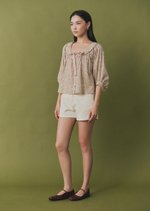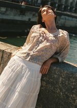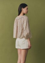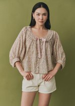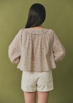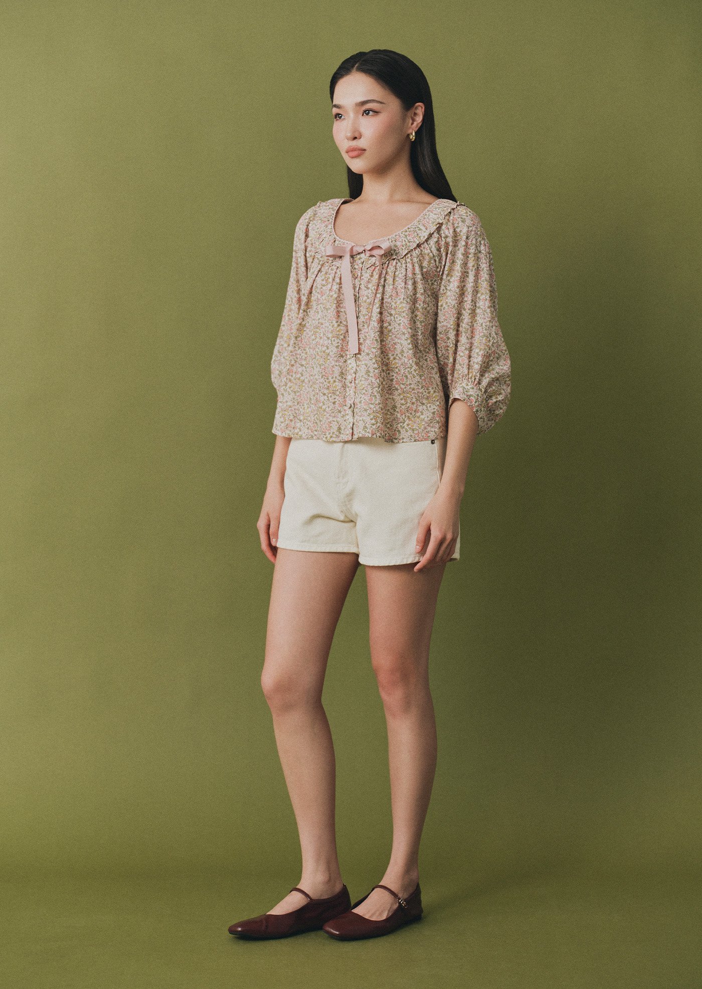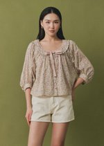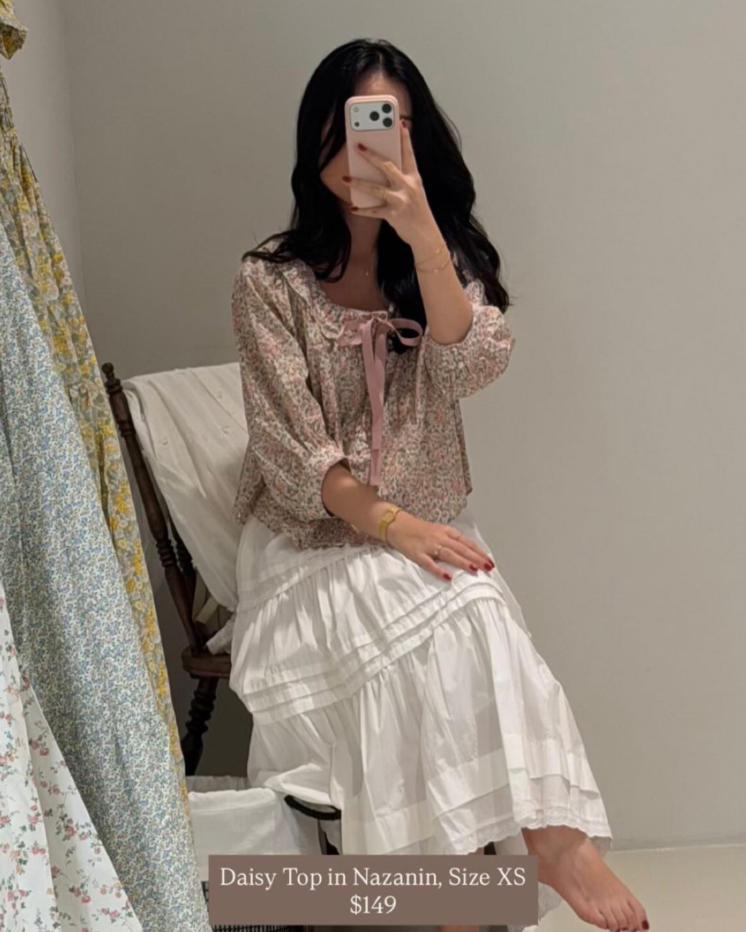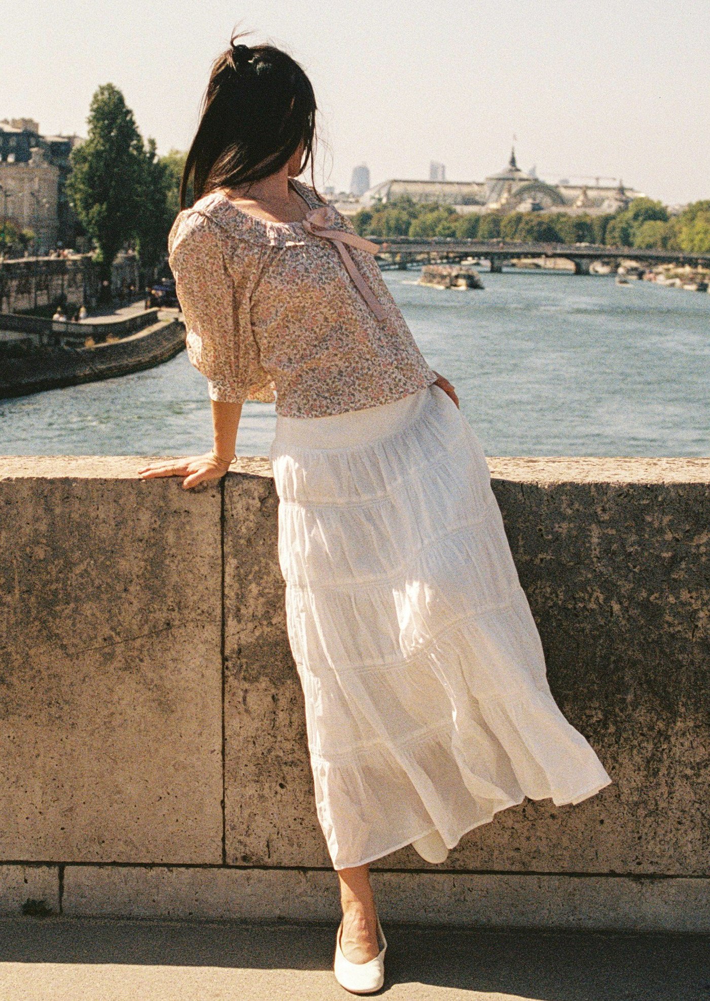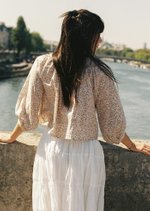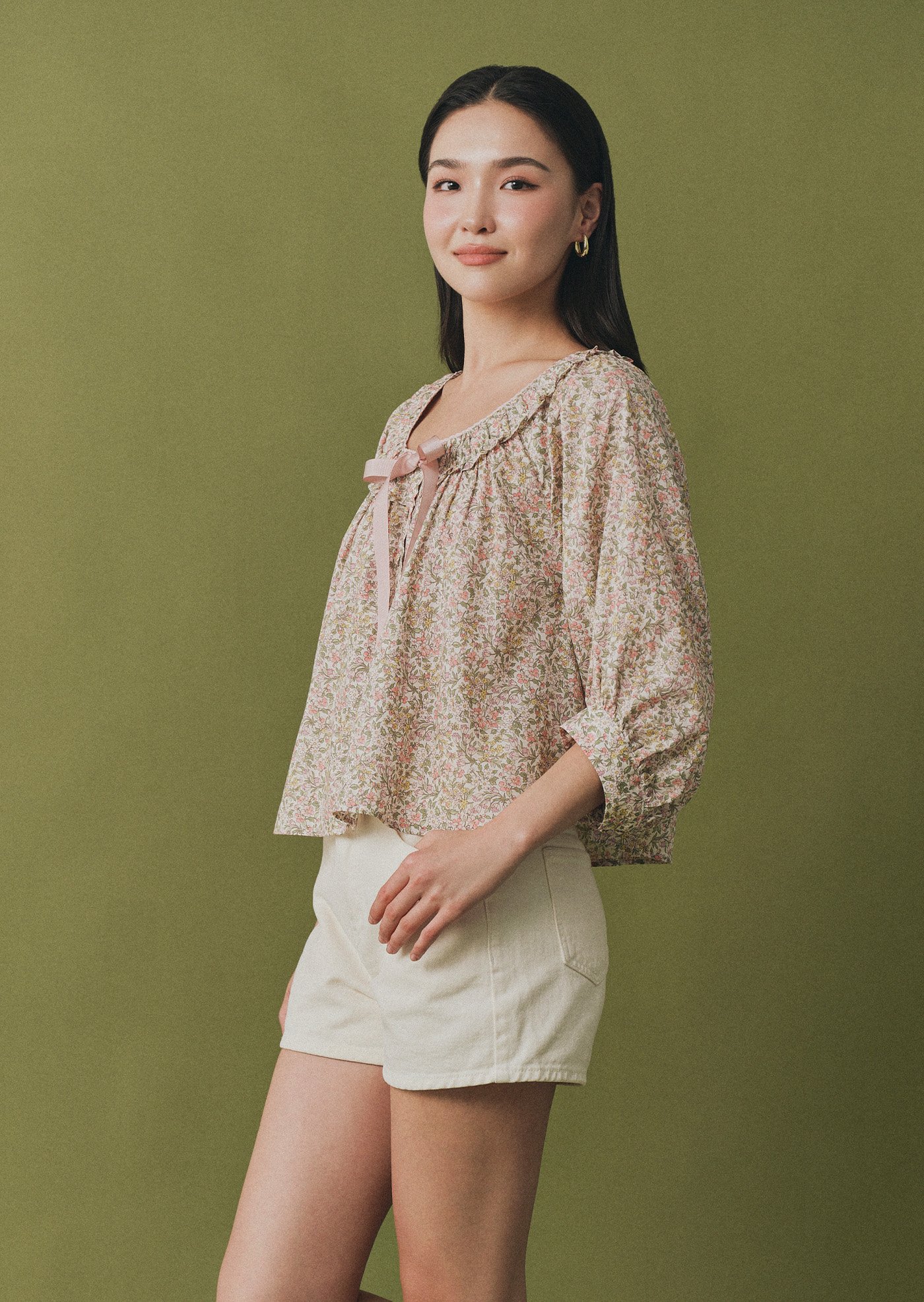 The Daisy Top is a romantic everyday piece with soft florals, a ruffled neckline, and a sweet bow detail. Its light cotton fabric and gentle volume make it perfect for effortless styling from day to night.