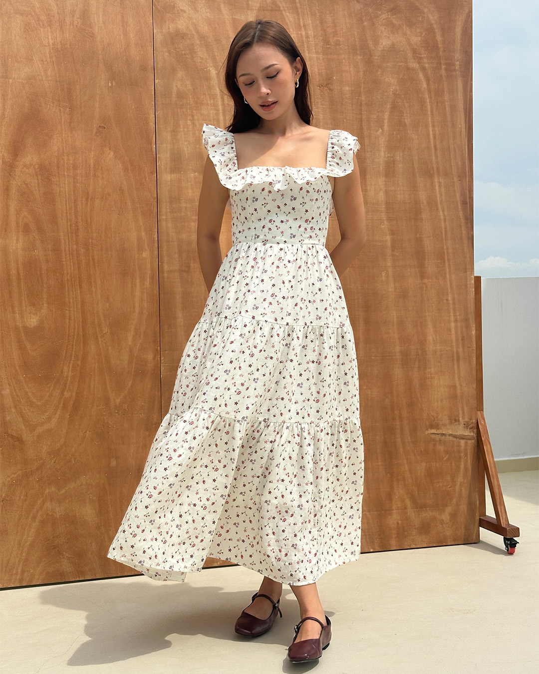 The Dayna features a ruffled neckline on a fitted bodiced with a tiered layer maxi skirt. Choose to wear it on or off the shoulder.