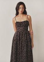 The Eleanor features a sweetheart neckline with a gathered bust panel and a two-tiered maxi skirt.
