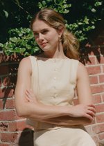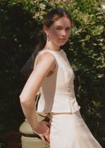 The Elijah top showcases a elegant boat neckline, a self-tie ribbon at the waist, and stylish box pleats at the hem for a charming finish.