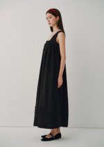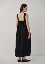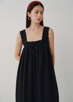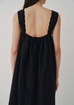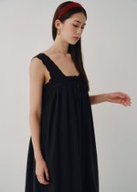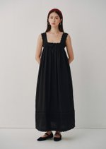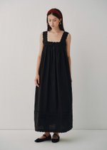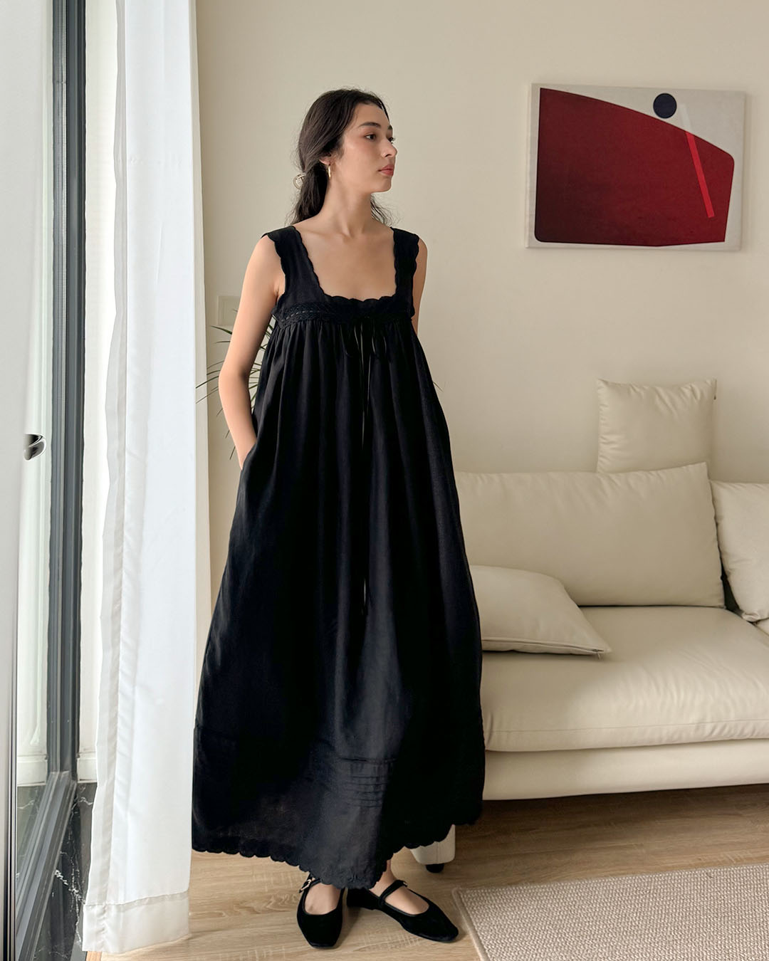 The Eliot Maxi Dress features a scoop neckline, ruched bodice, midi length, and handy pockets, blending elegance with everyday ease.