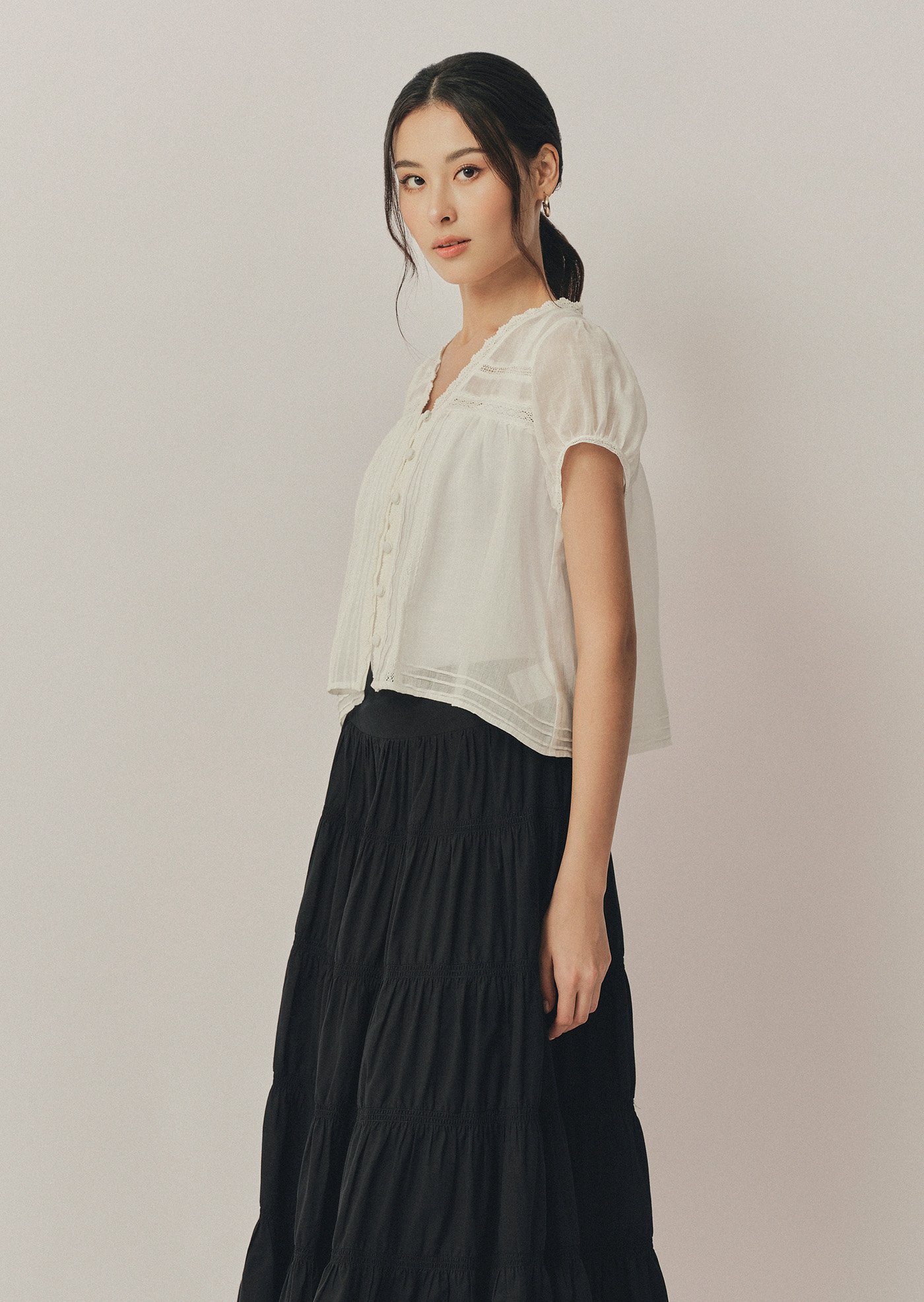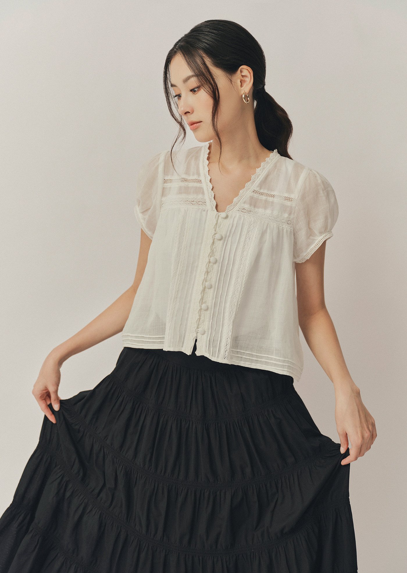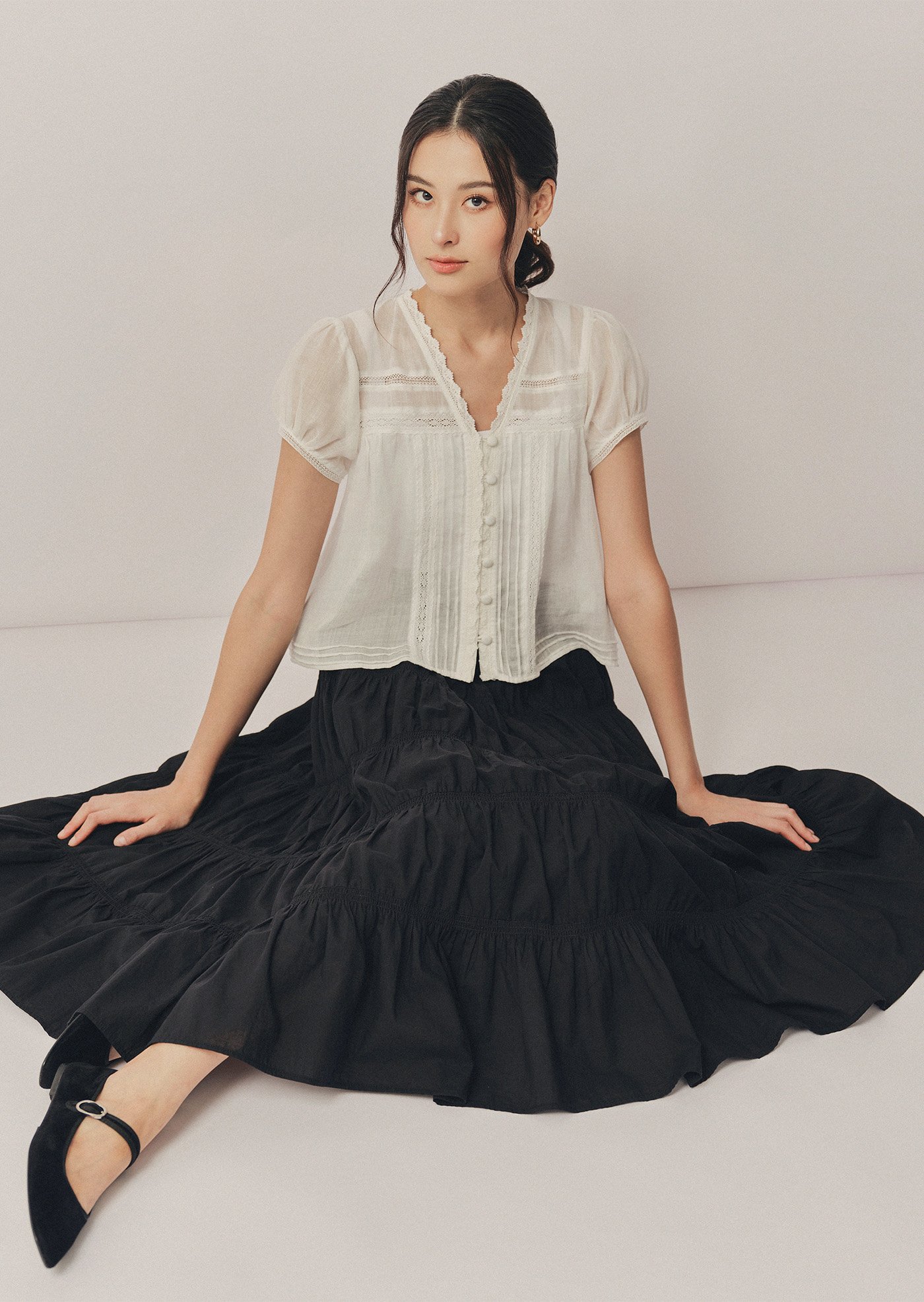The Elowen Top captures a vintage-inspired softness with lace panels, pintuck details, and a gentle silhouette. Airy and romantic, it’s an easy piece to pair with high-waisted skirts or trousers — perfect for everyday wear with a timeless touch.