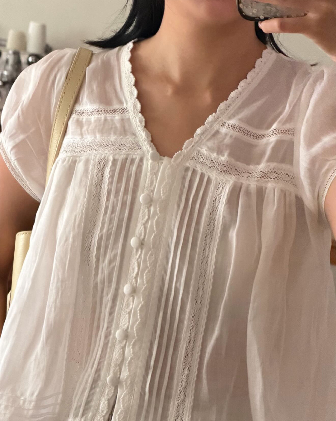 -Delicate lace inserts with vertical pintuck details