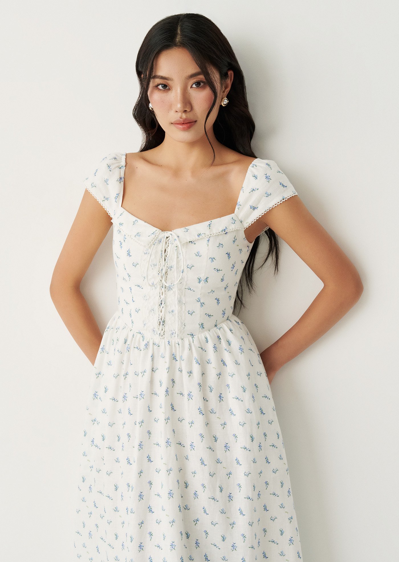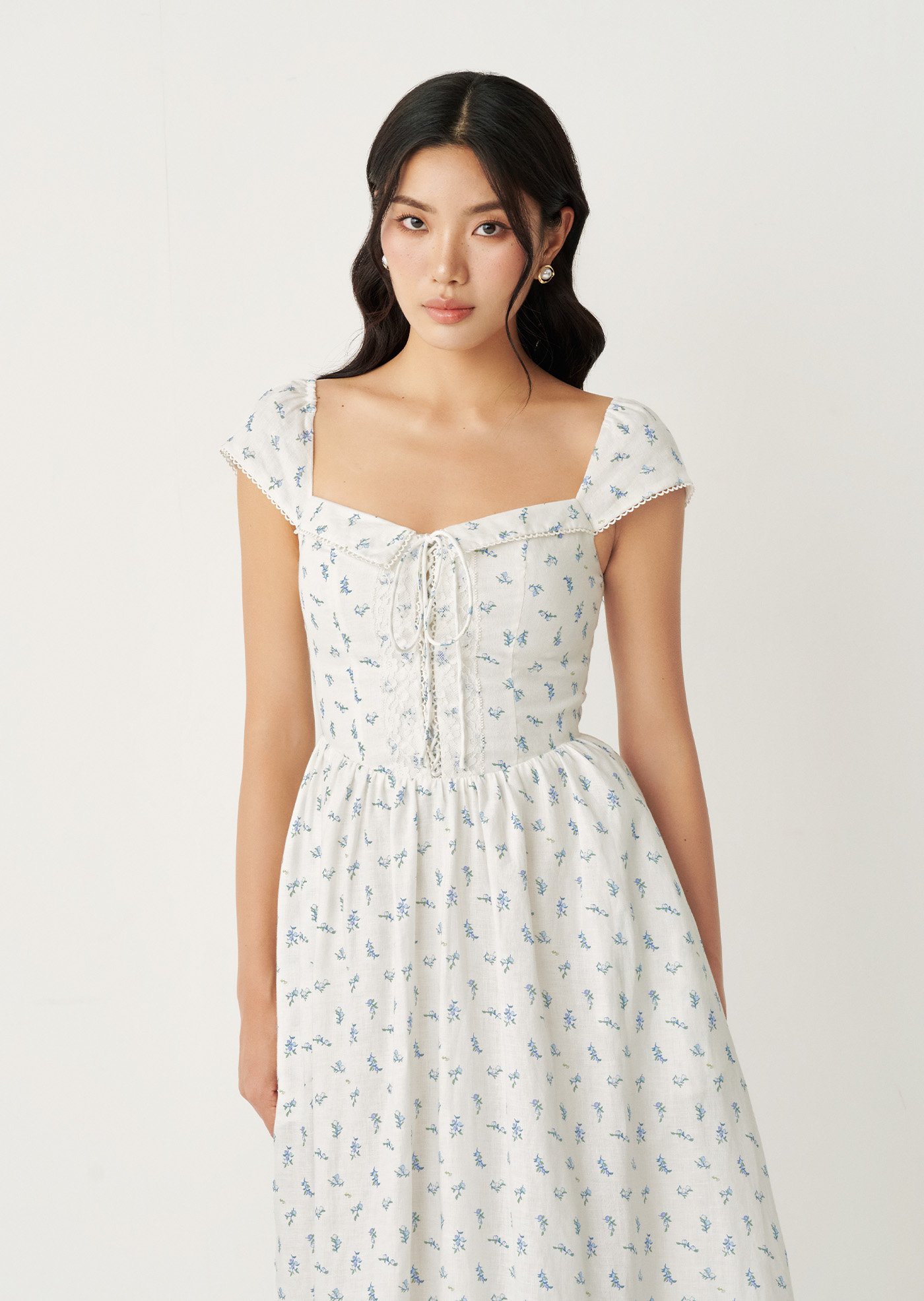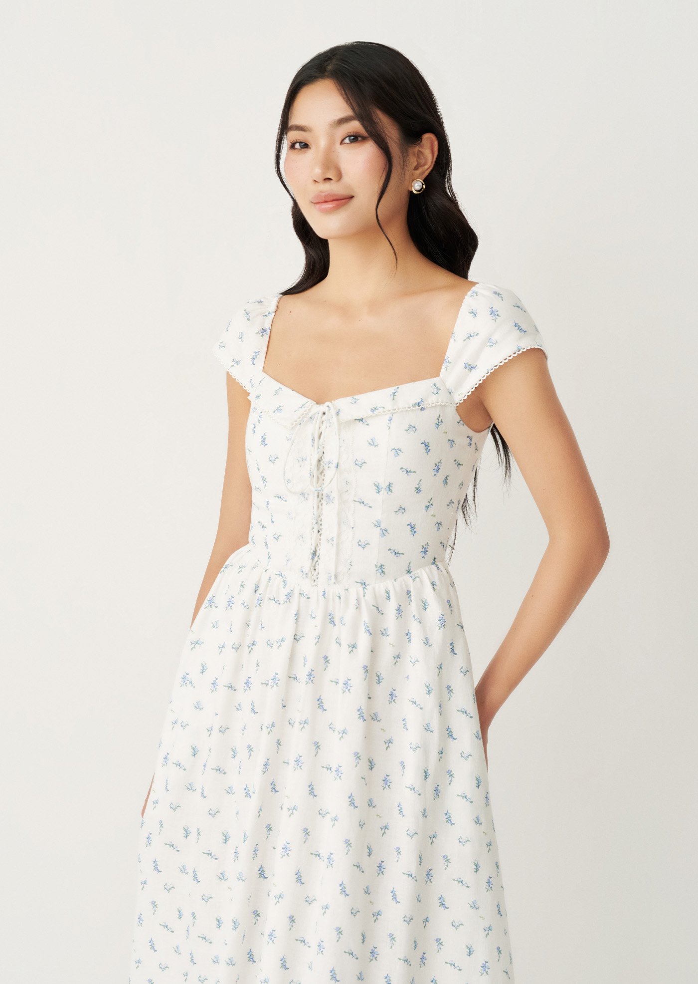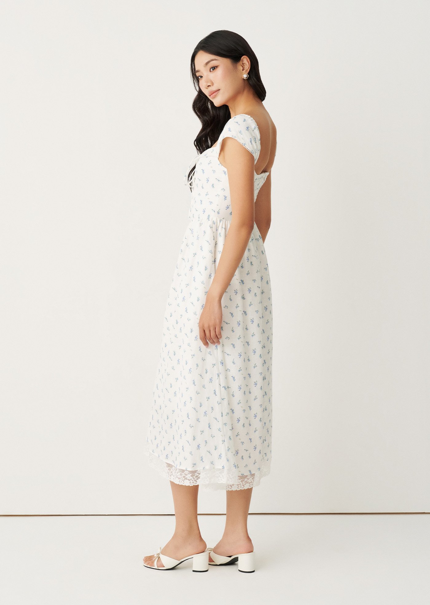 The Fernanda Midi Dress is designed with a fitted bodice that flatters while staying comfortable, finished with a delicate front tie and a smocked back for ease of movement. The gentle blue floral print and lace-trimmed details add a nostalgic charm, while the flowing skirt makes it perfect for everyday wear or slow weekends.