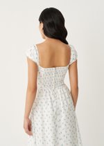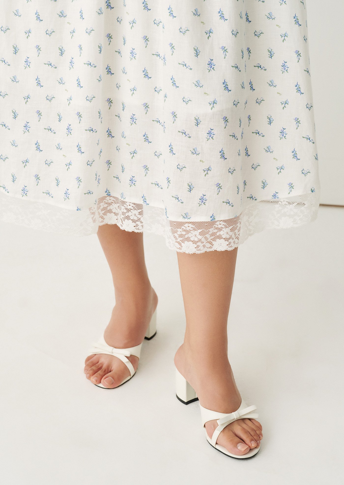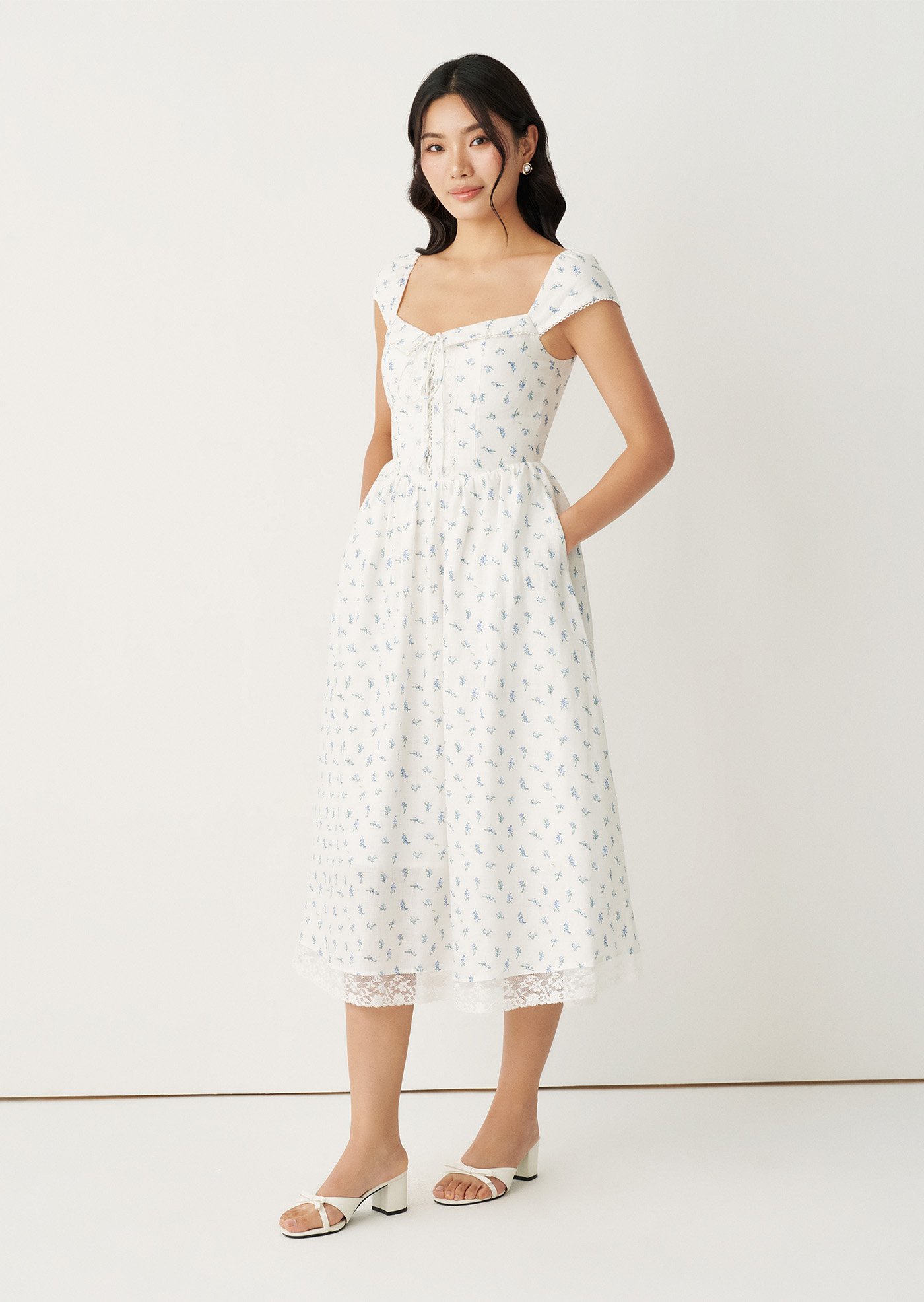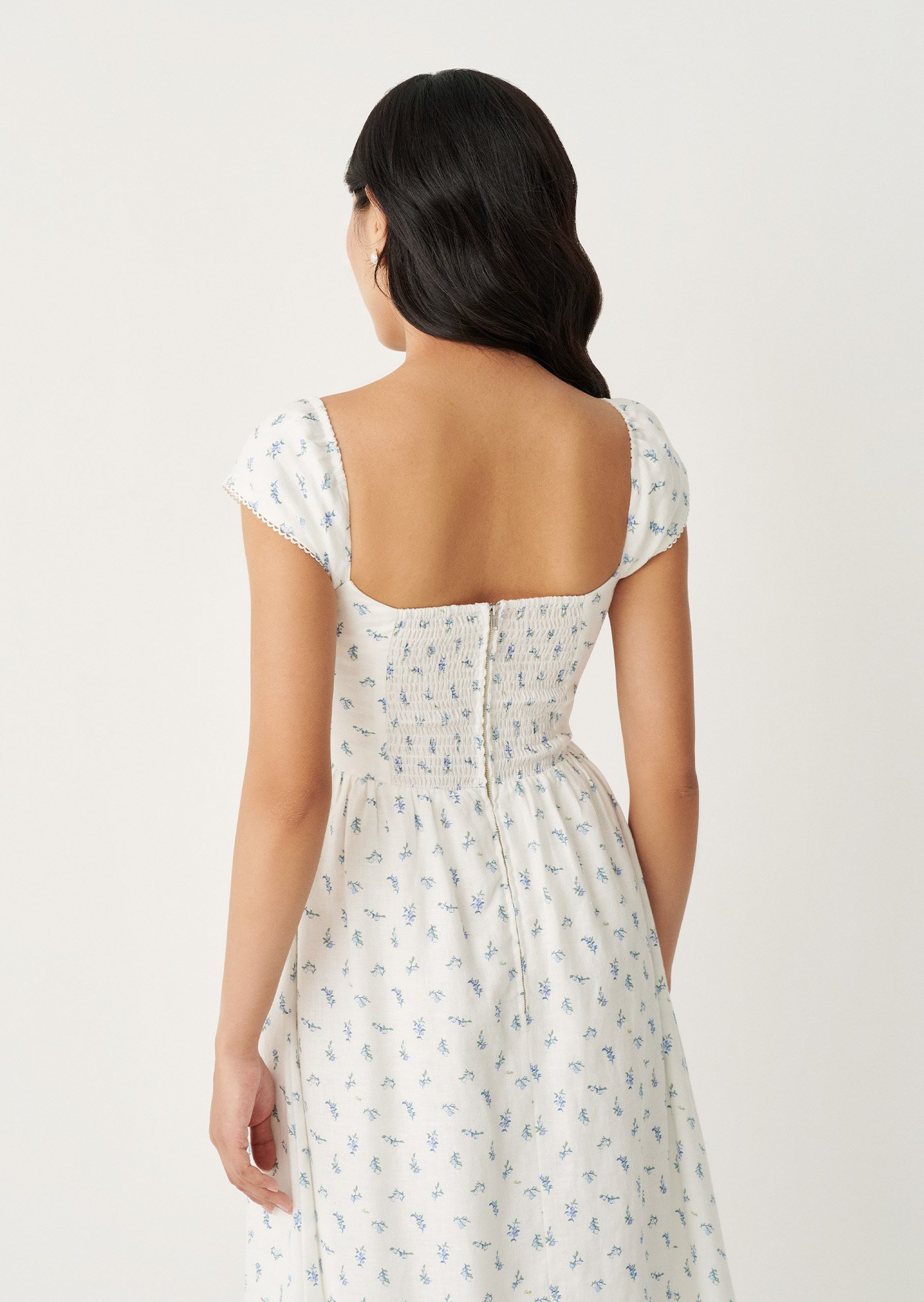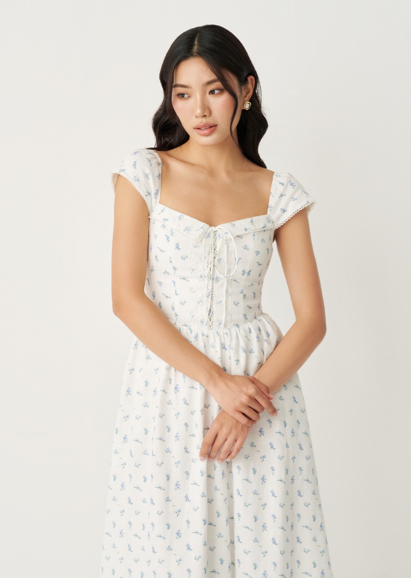 The Fernanda Midi Dress is designed with a fitted bodice that flatters while staying comfortable, finished with a delicate front tie and a smocked back for ease of movement. The gentle blue floral print and lace-trimmed details add a nostalgic charm, while the flowing skirt makes it perfect for everyday wear or slow weekends.