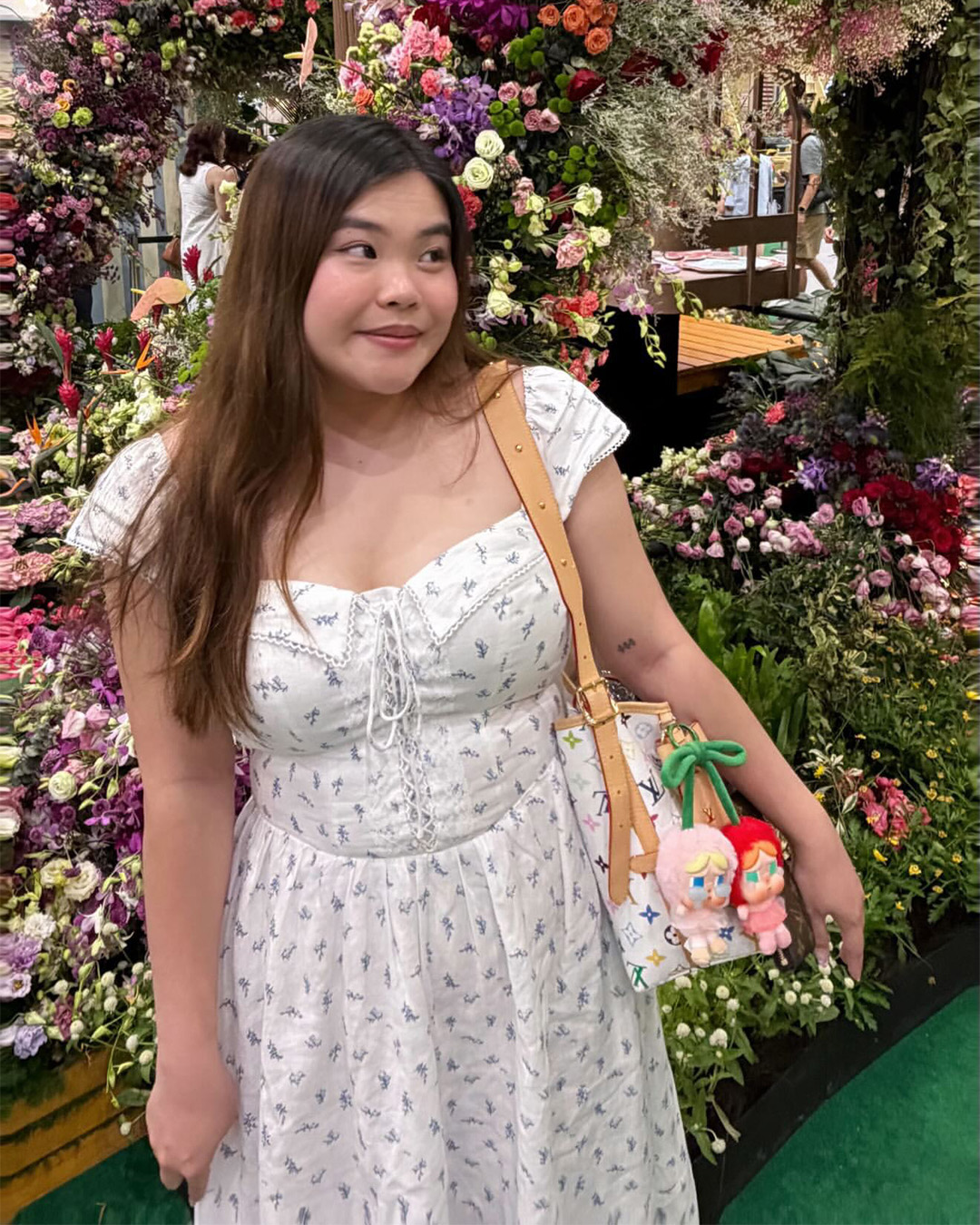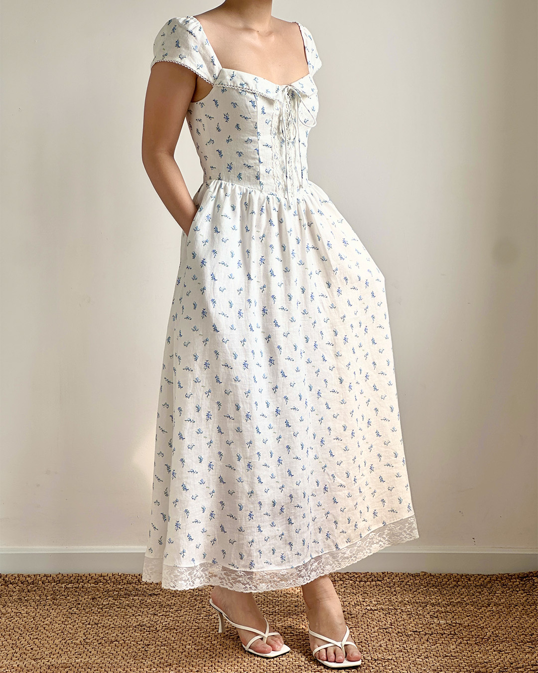 The Fernanda Midi Dress is designed with a fitted bodice that flatters while staying comfortable, finished with a delicate front tie and a smocked back for ease of movement. The gentle blue floral print and lace-trimmed details add a nostalgic charm, while the flowing skirt makes it perfect for everyday wear or slow weekends.