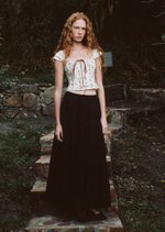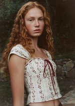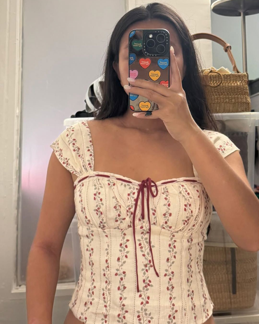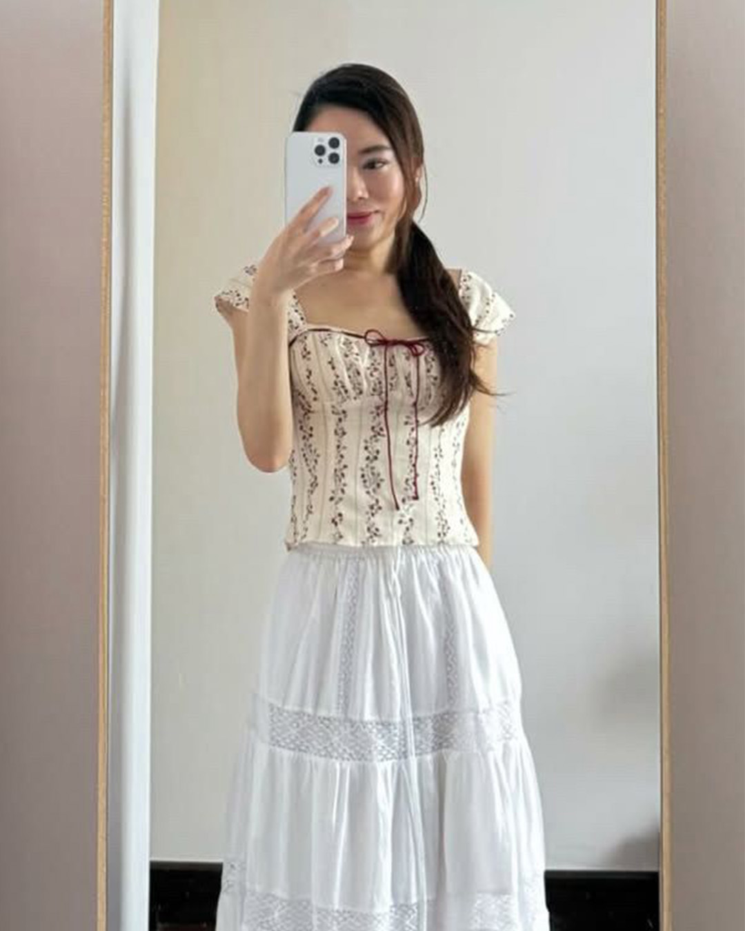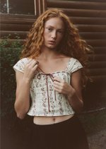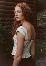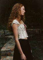 The Fina Top features a romantic sweetheart neckline with a gathered bust, framed by contrast lace trim and a delicate ribbon tie. With its corset-inspired seams, soft cap sleeves, and cropped, fitted silhouette, it's a feminine statement piece with vintage charm.