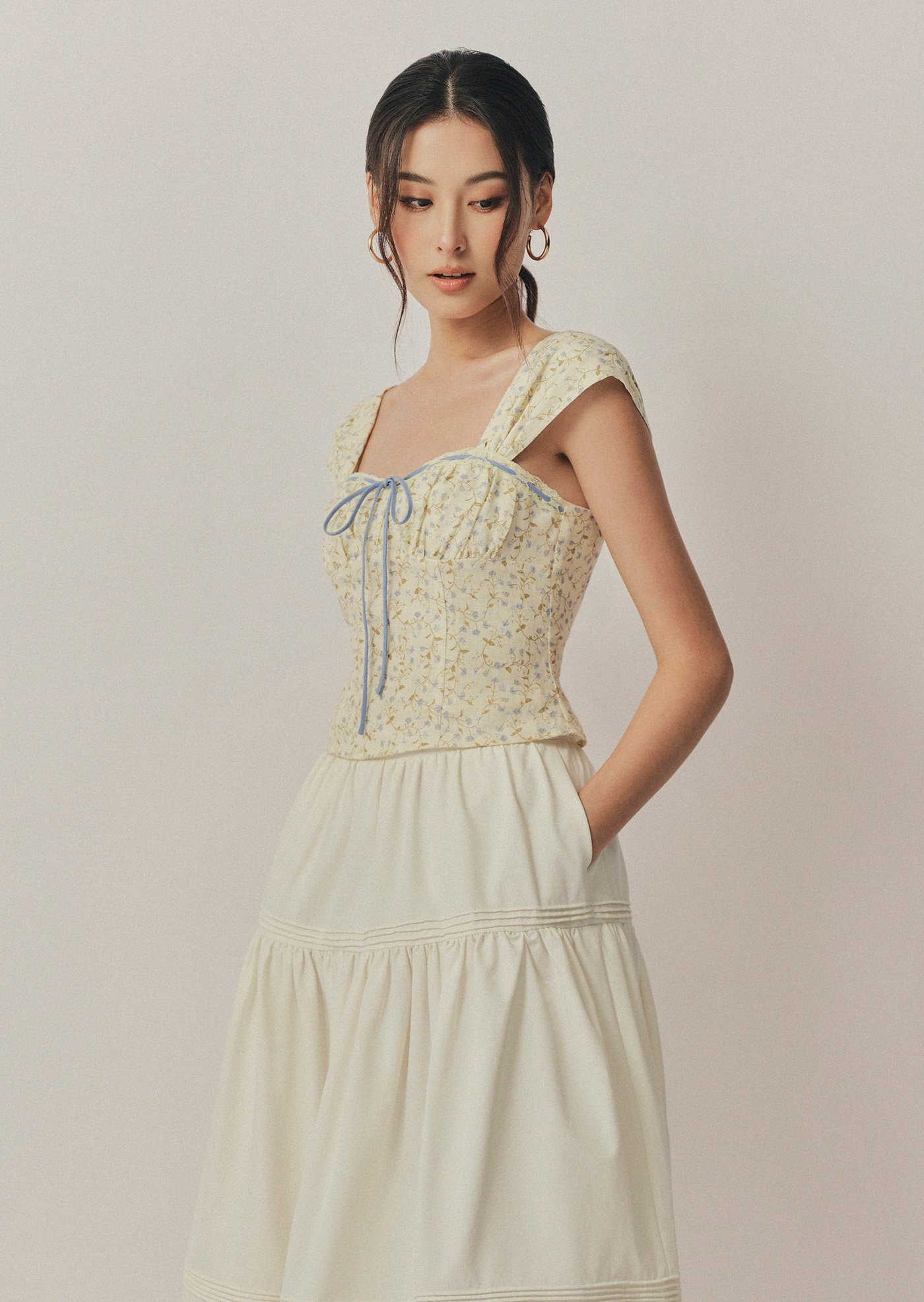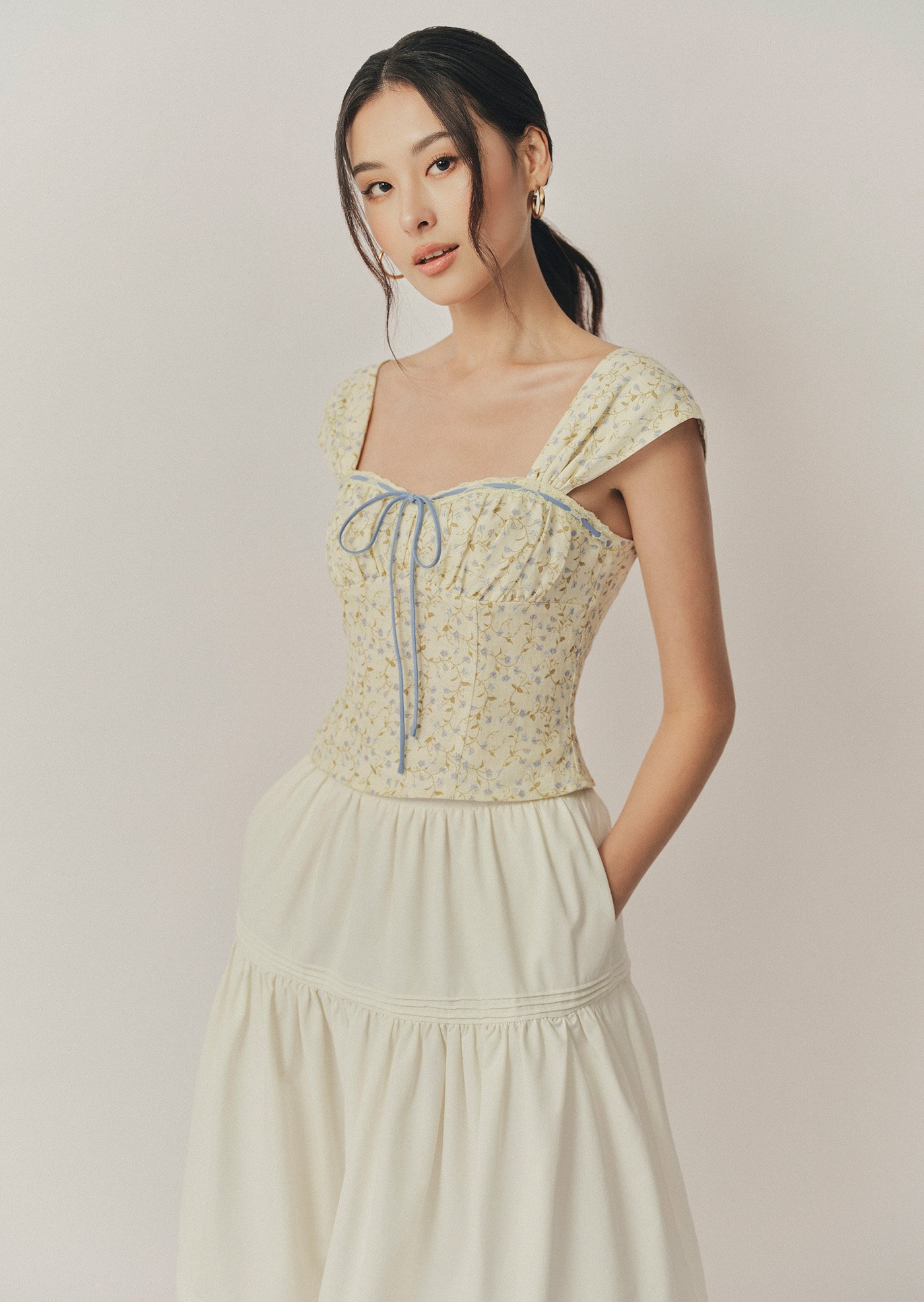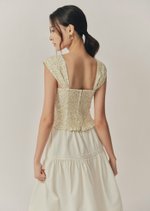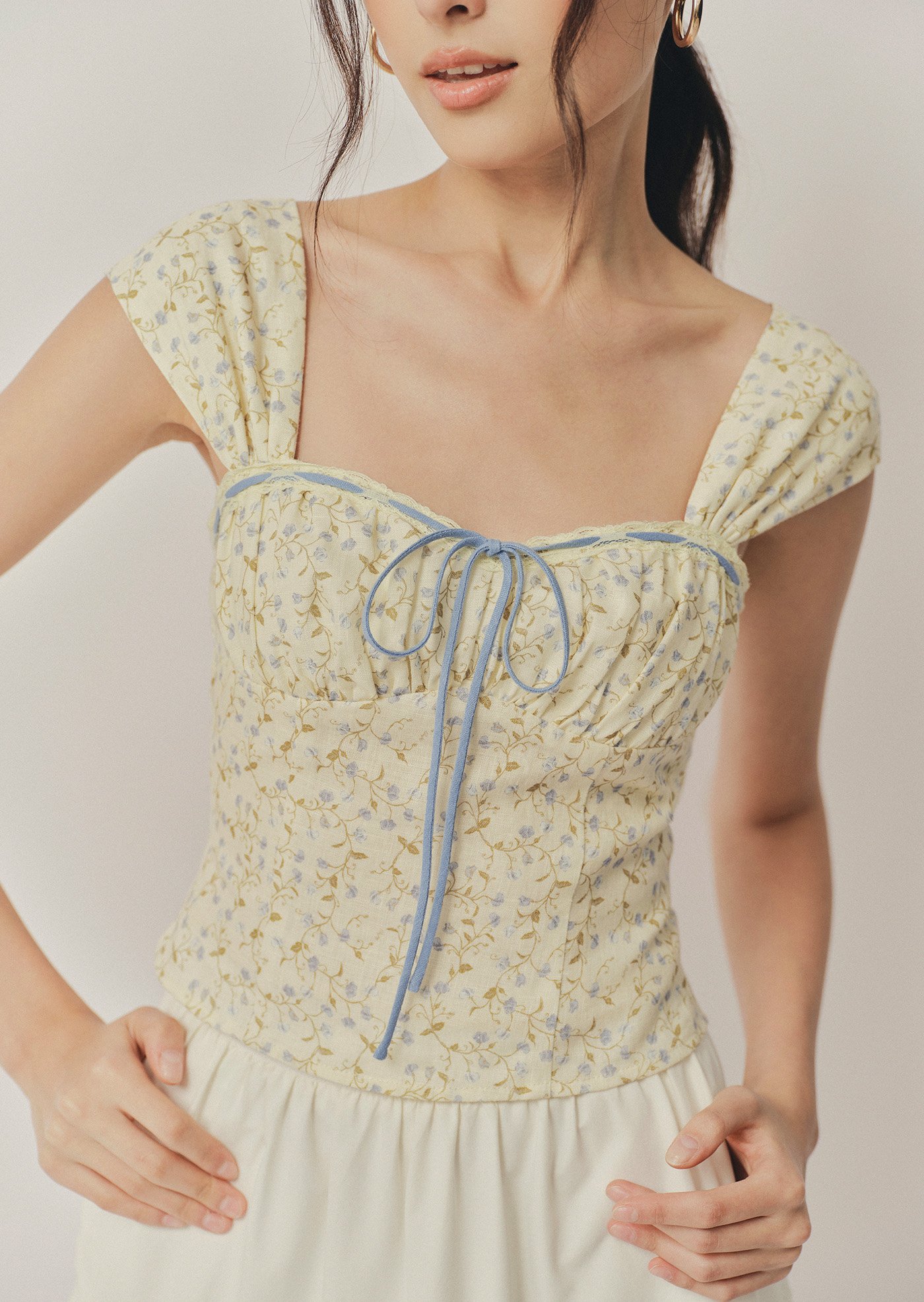 The Fina Top features a romantic sweetheart neckline with a gathered bust, framed by contrast lace trim and a delicate ribbon tie. With its corset-inspired seams, soft cap sleeves, and cropped, fitted silhouette, it's a feminine statement piece with vintage charm.