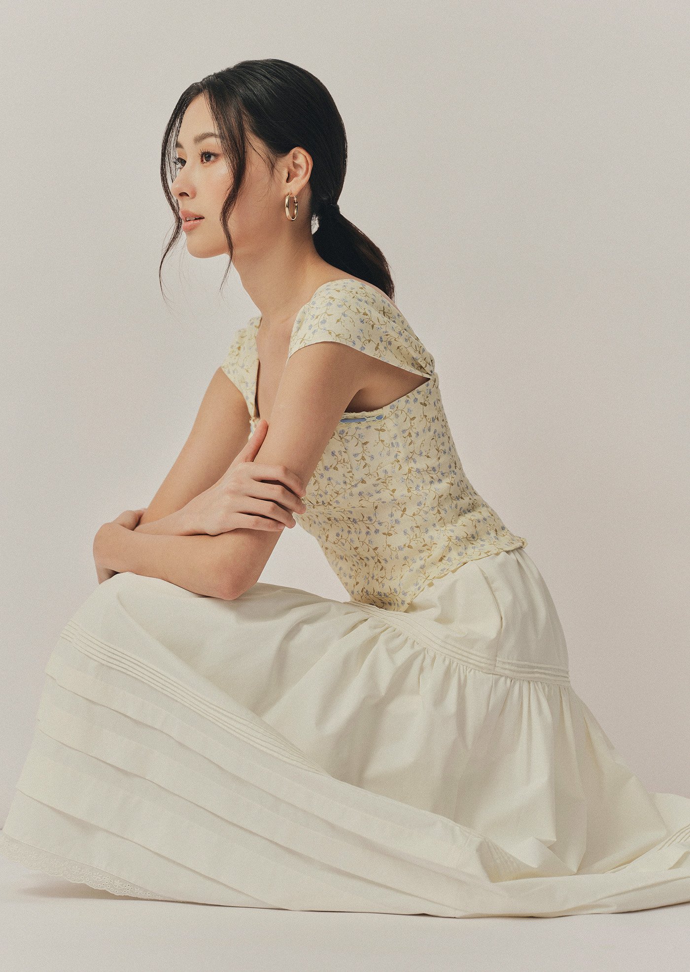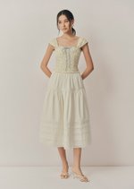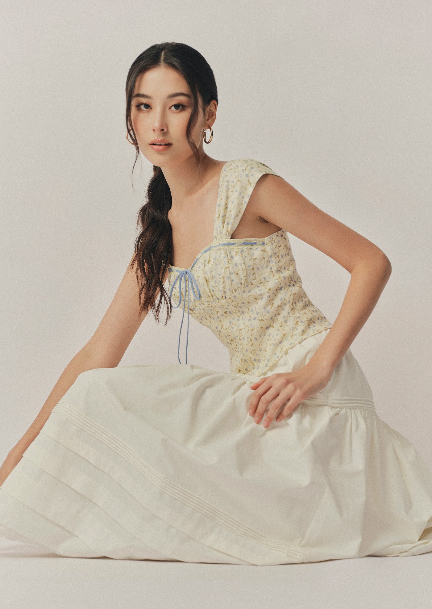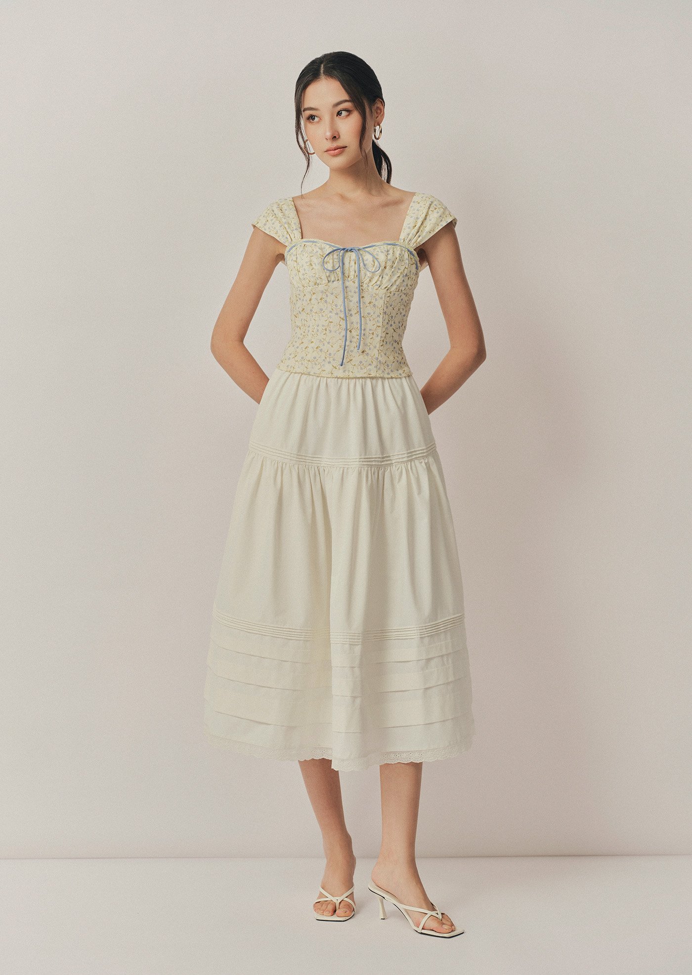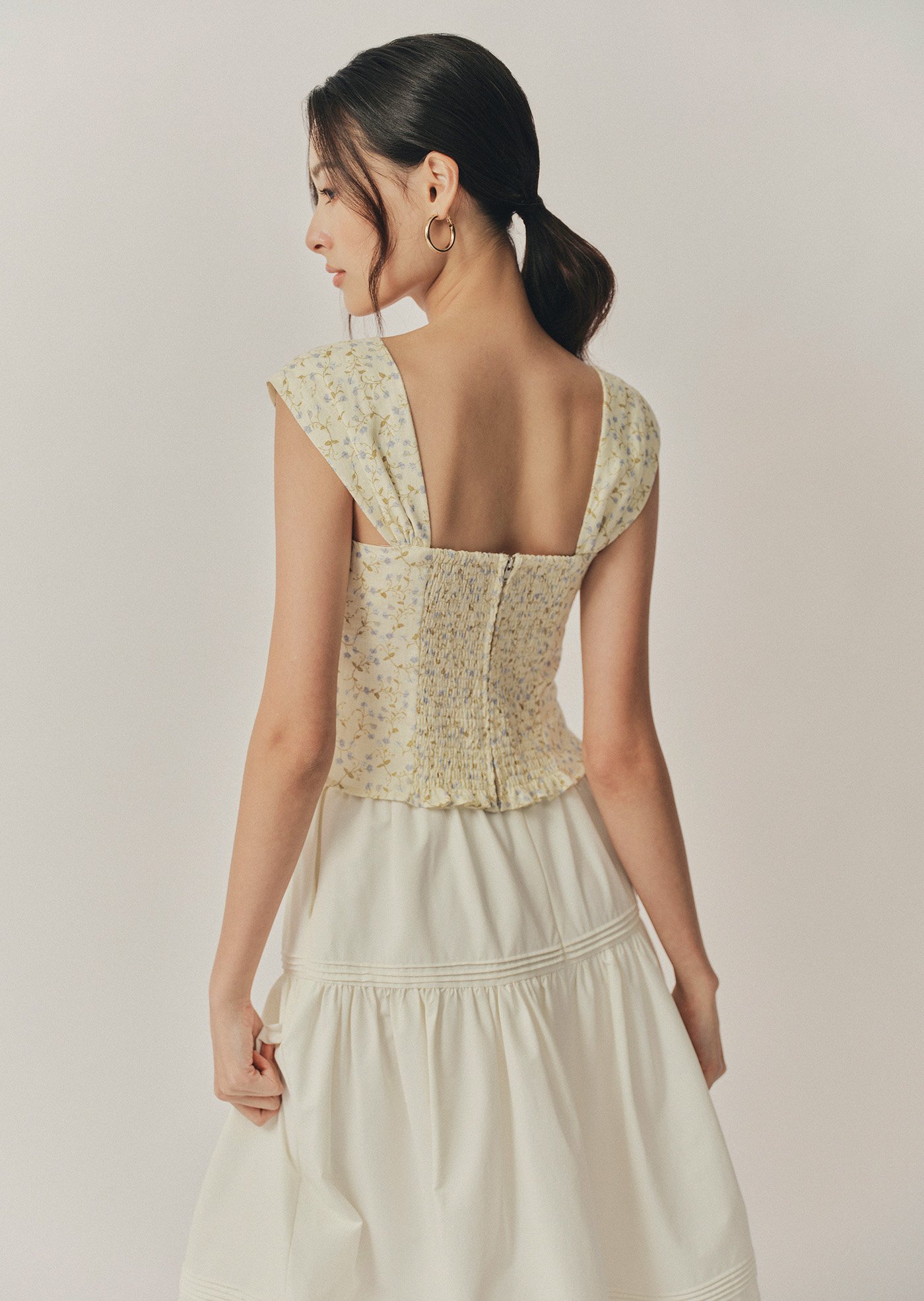 The Fina Top features a romantic sweetheart neckline with a gathered bust, framed by contrast lace trim and a delicate ribbon tie. With its corset-inspired seams, soft cap sleeves, and cropped, fitted silhouette, it's a feminine statement piece with vintage charm.