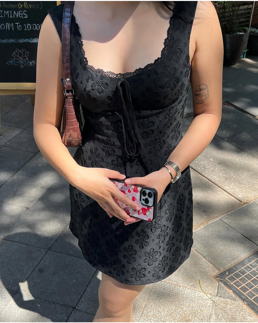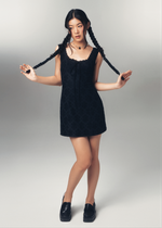 Romance is in the air with this lovely Gigi Mini Dress. A simple A-line mini dress with lace trimmings and tie string detail transform this little black dress into a must have piece for every girl.