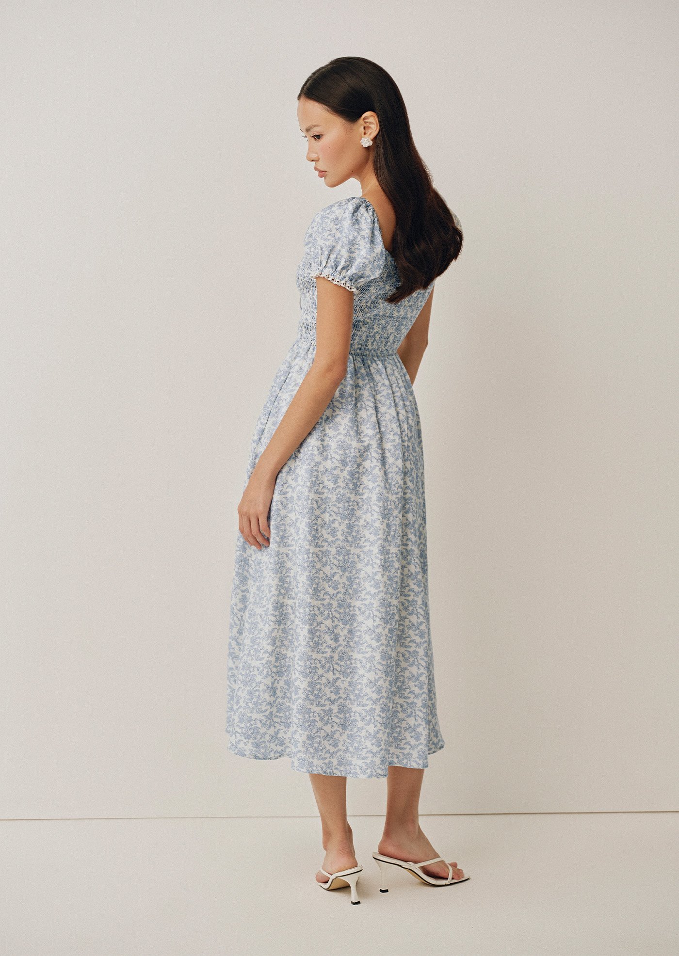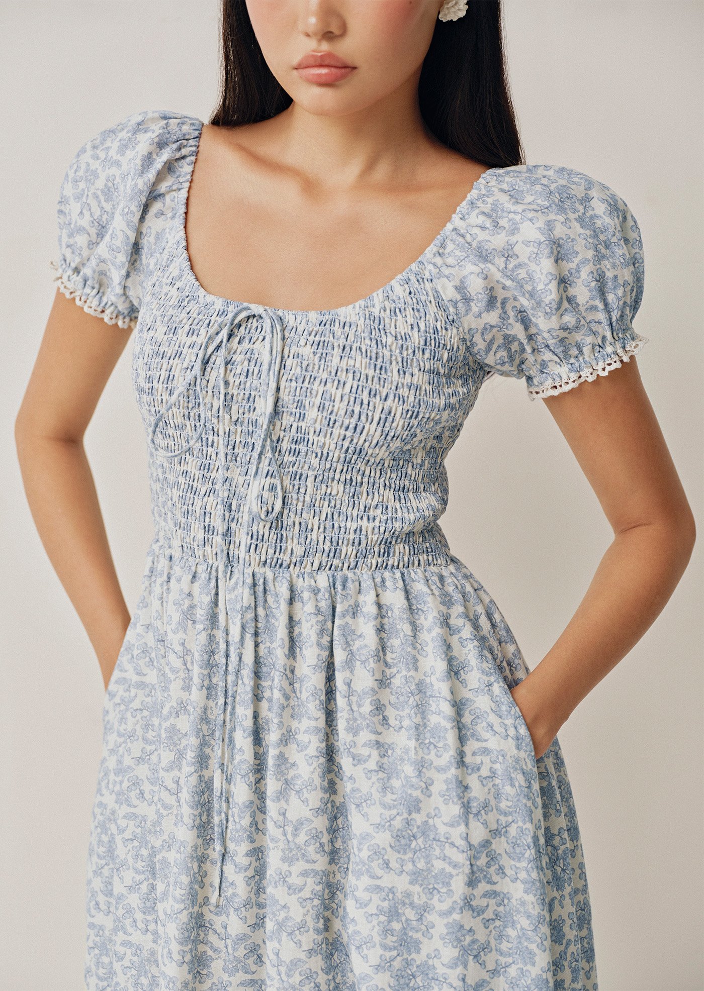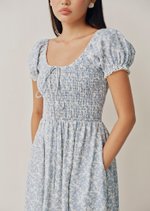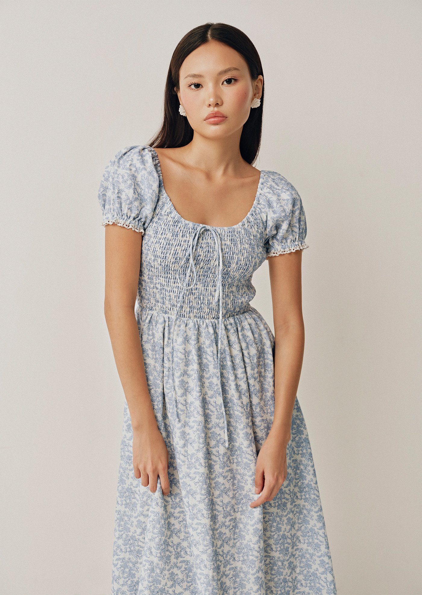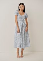 A soft nod to romance, the Helga Midi features a shirred bodice and delicate puff sleeves finished with subtle trim. Crafted from 100% linen with a vintage-inspired floral print, it's the kind of dress made for slow days and sunlit moments.