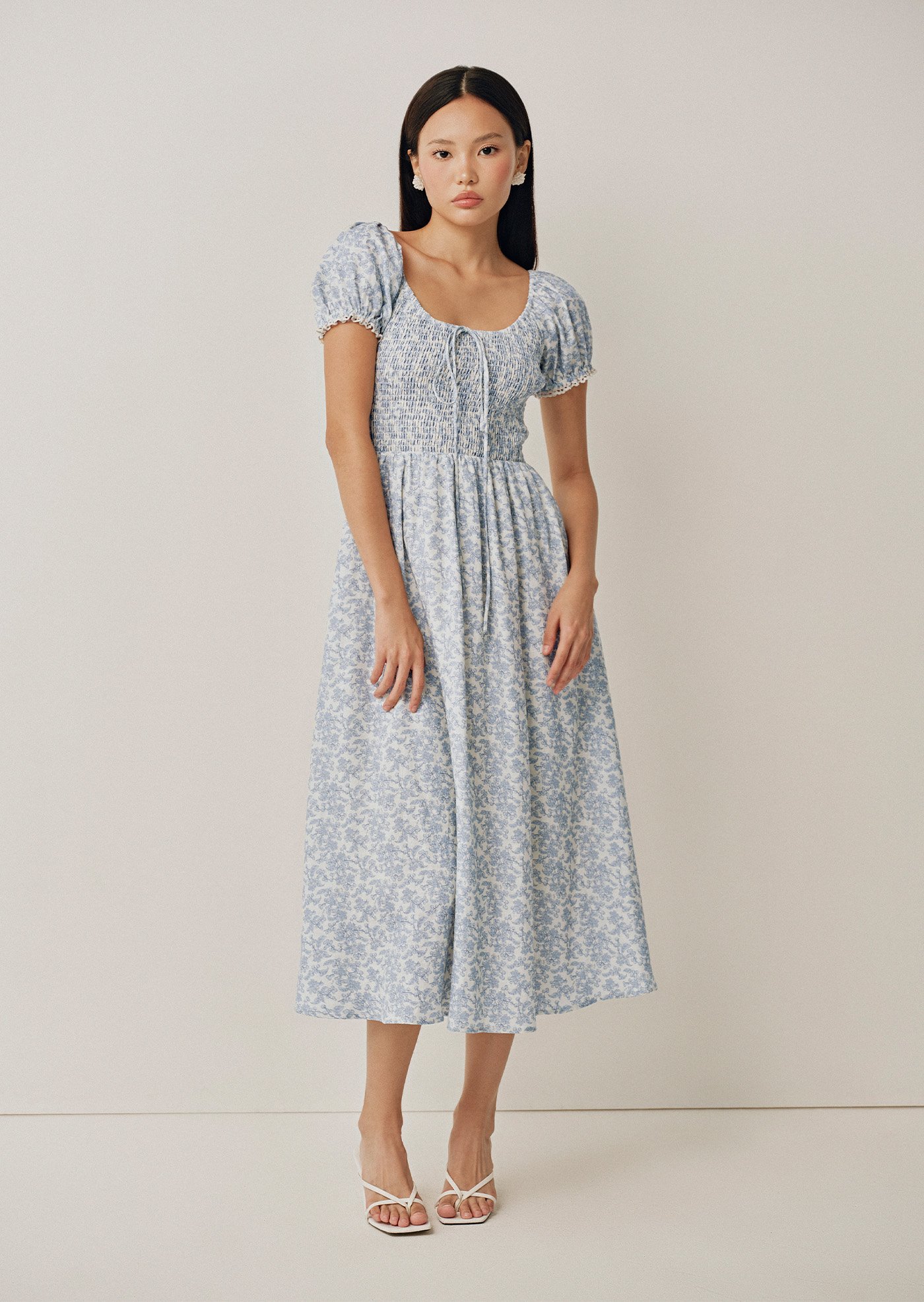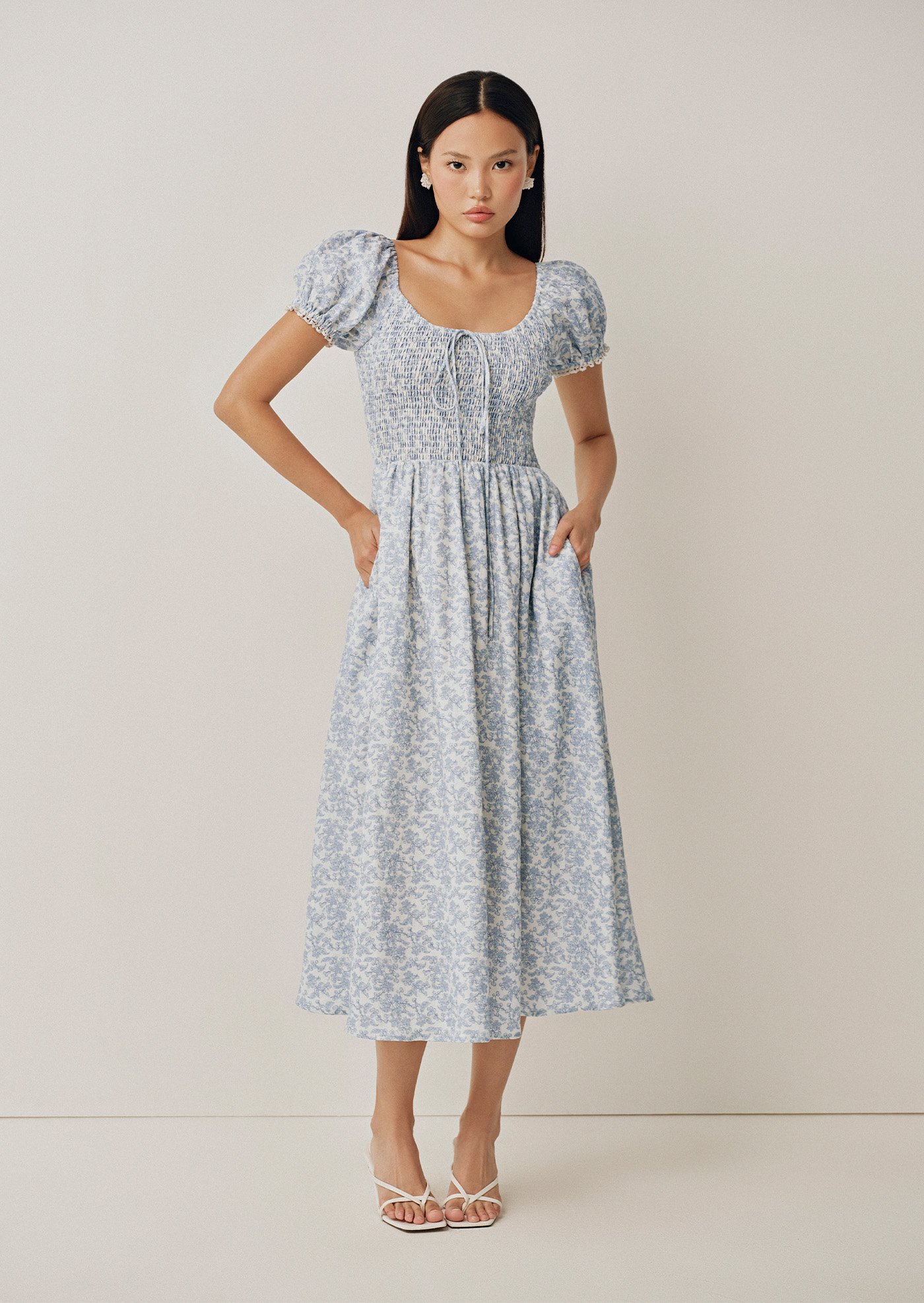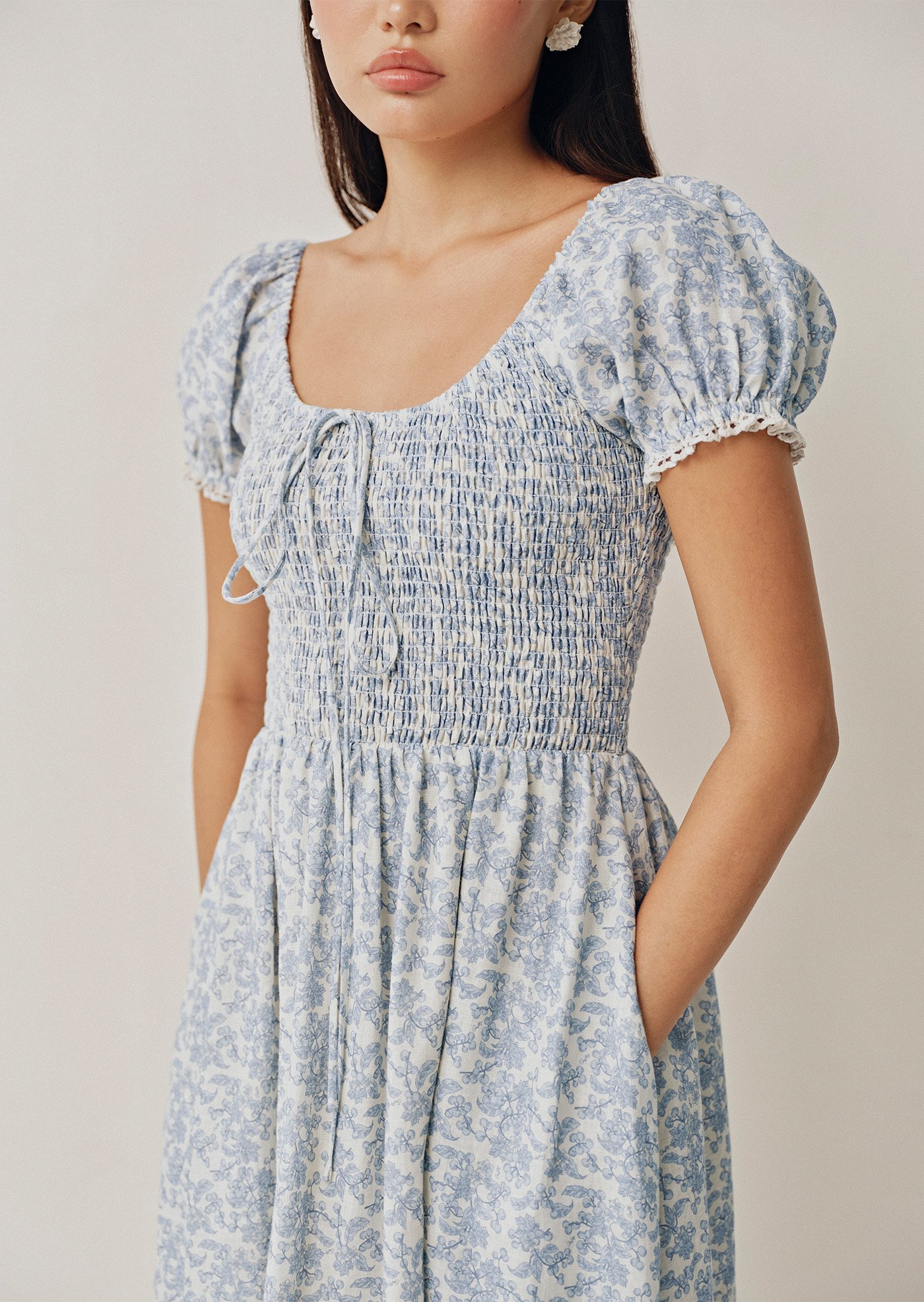 A soft nod to romance, the Helga Midi features a shirred bodice and delicate puff sleeves finished with subtle trim. Crafted from 100% linen with a vintage-inspired floral print, it's the kind of dress made for slow days and sunlit moments.