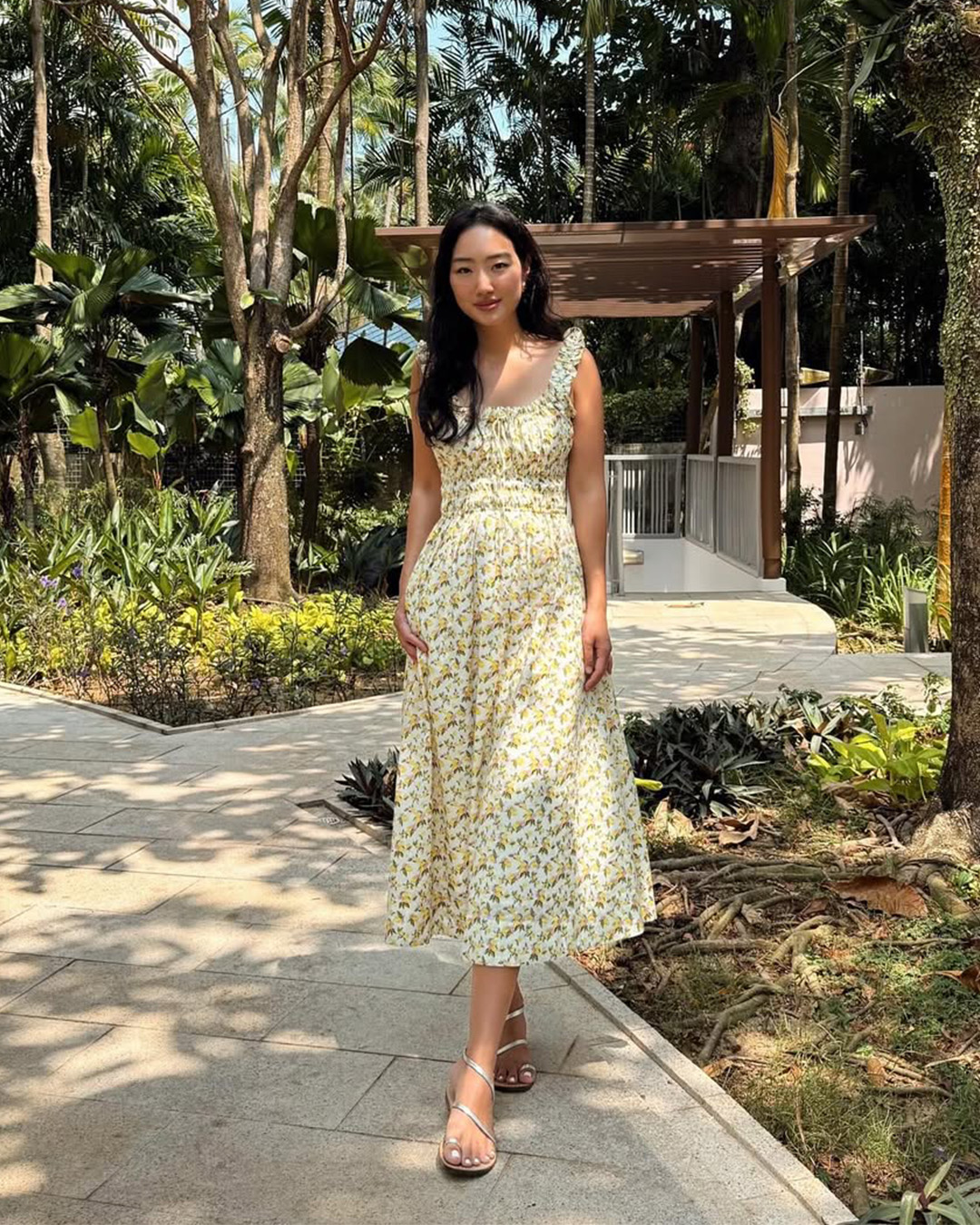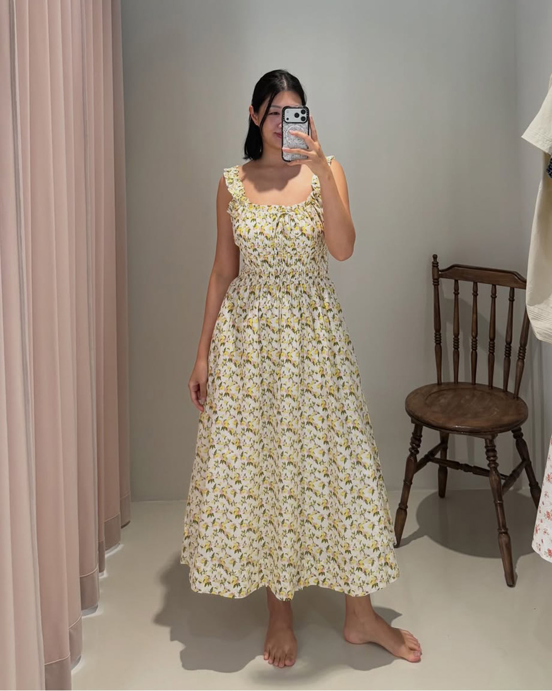 Designed with a smocked bodice that flatters effortlessly, ruffled shoulder straps, and a flowing midi skirt, it moves with grace and ease. A tie detail at the neckline adds a gentle touch of charm, while hidden side pockets make it as practical as it is romantic.