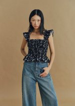 The Hilary Top features a flattering ruched bodice and a stylish corset back, complete with a self-tie ribbon for an adjustable fit. This sleeveless top is fully lined, offering both comfort and elegance for any occasion.