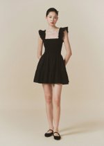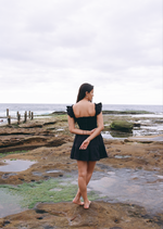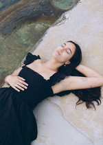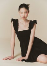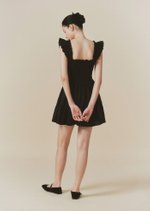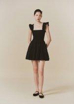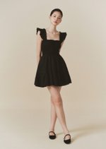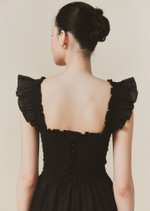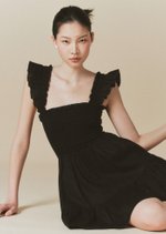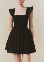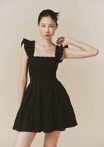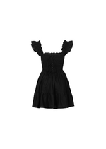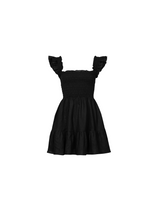 The Hill dress features frilly sleeves paired with a mini tiered skirt. The fully smocked bodice includes corset-like back detailing and is adorned with self-tied ribbon